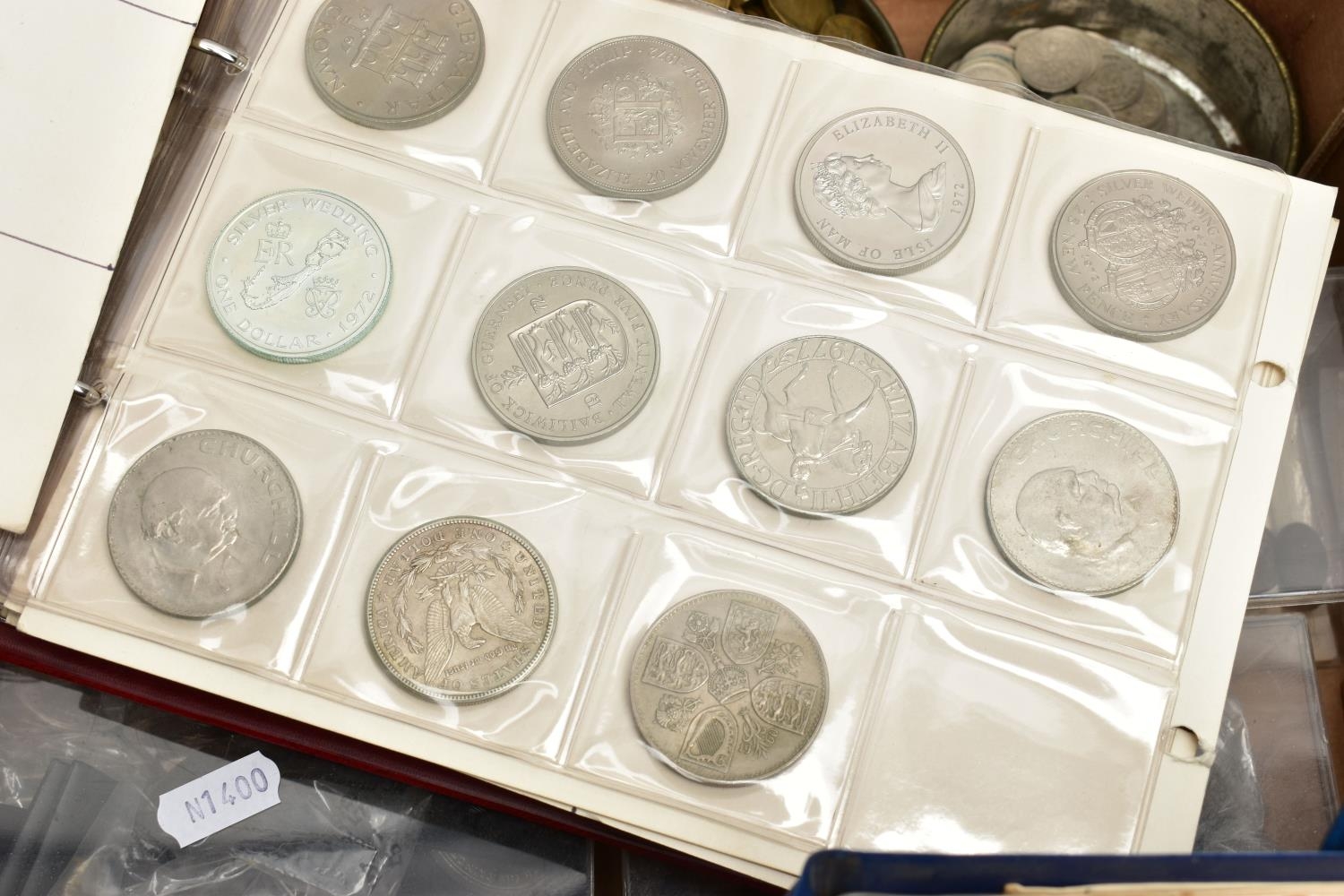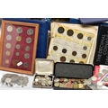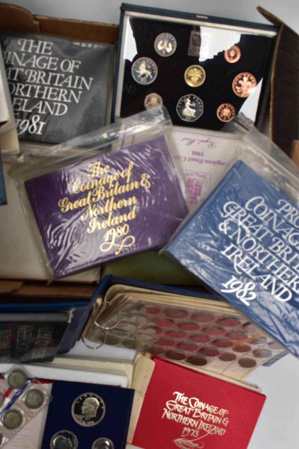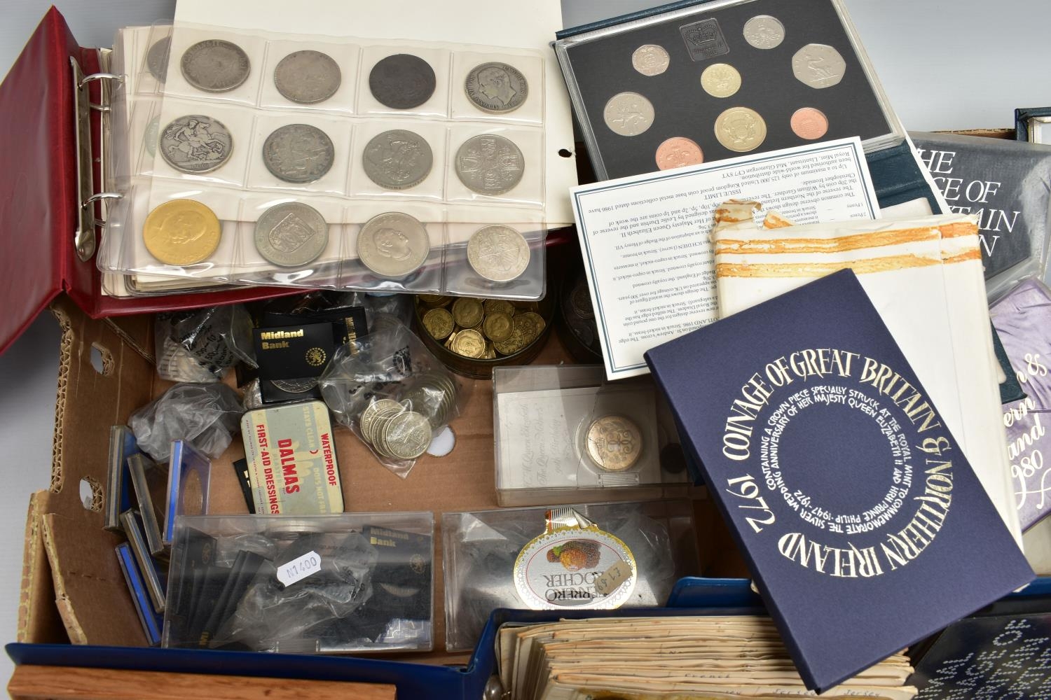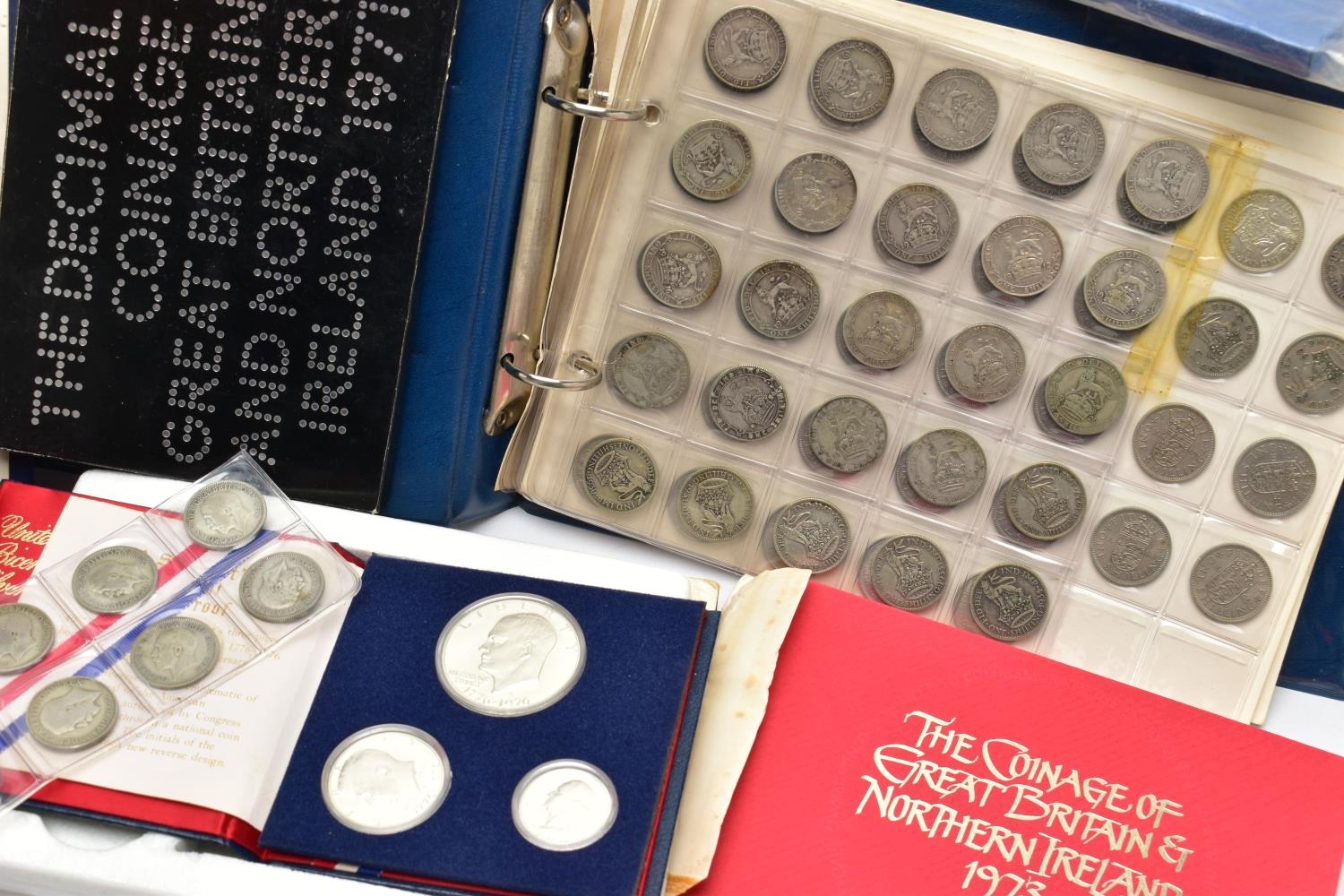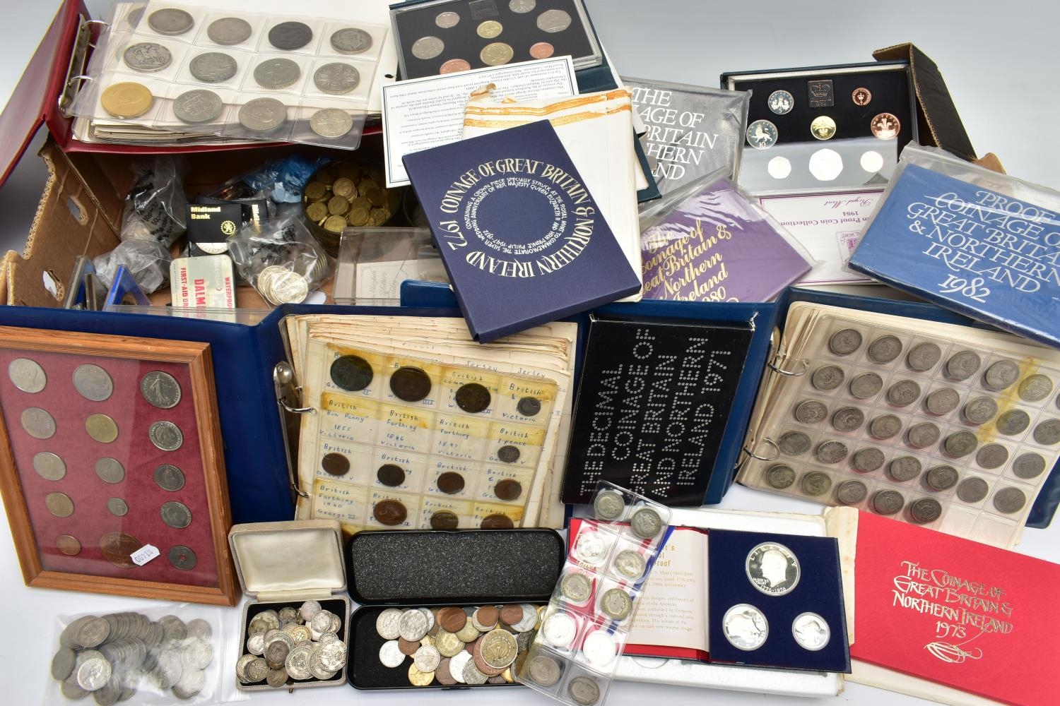 TWO BOXES OF UK AND WORLD COINS SOME LOOSE AND SOME IN THREE ALBUMS, to include a George III crown 1819, Charles II crown 1673, Spain 5 pesetas, 1976 100 pesetas 1885, Morgan Dollar 1921, Victoria good grade penny, 1855,1935,1951 crowns, 1972 Bermuda silver crown, lots of florin shillings sixpence and three pence silver coins, a USA bicentennial silver proof set of coins,1970,71,72,73,74,75,76,77,78,80,81,82 UK year set of coins, four proof coin sets 1983,84,85,86, etc