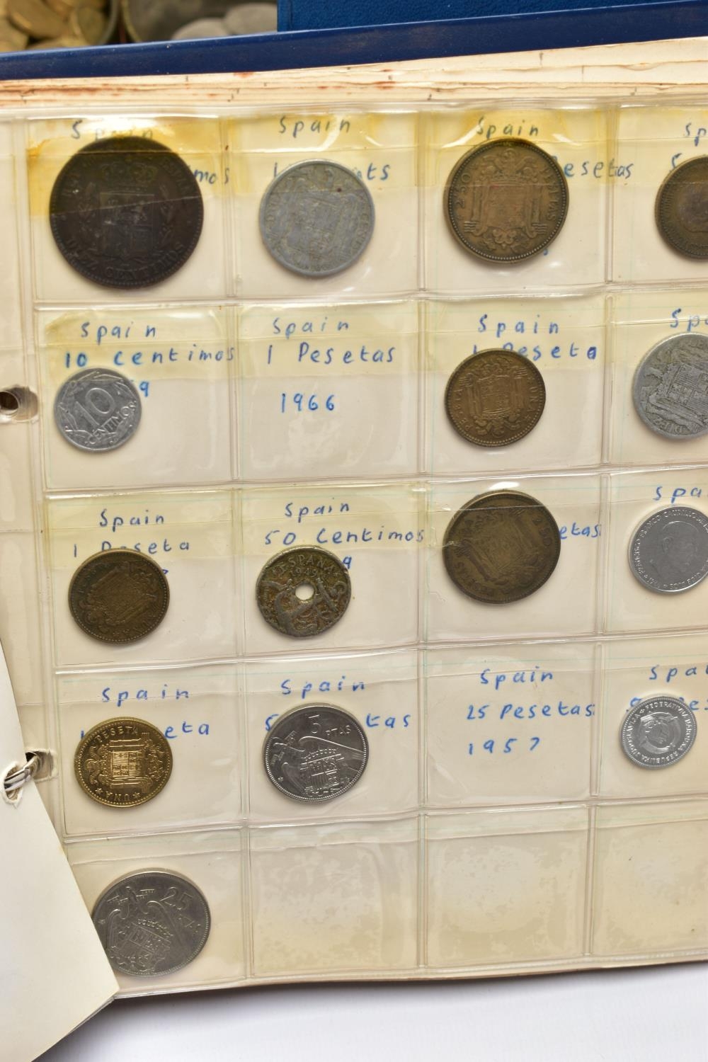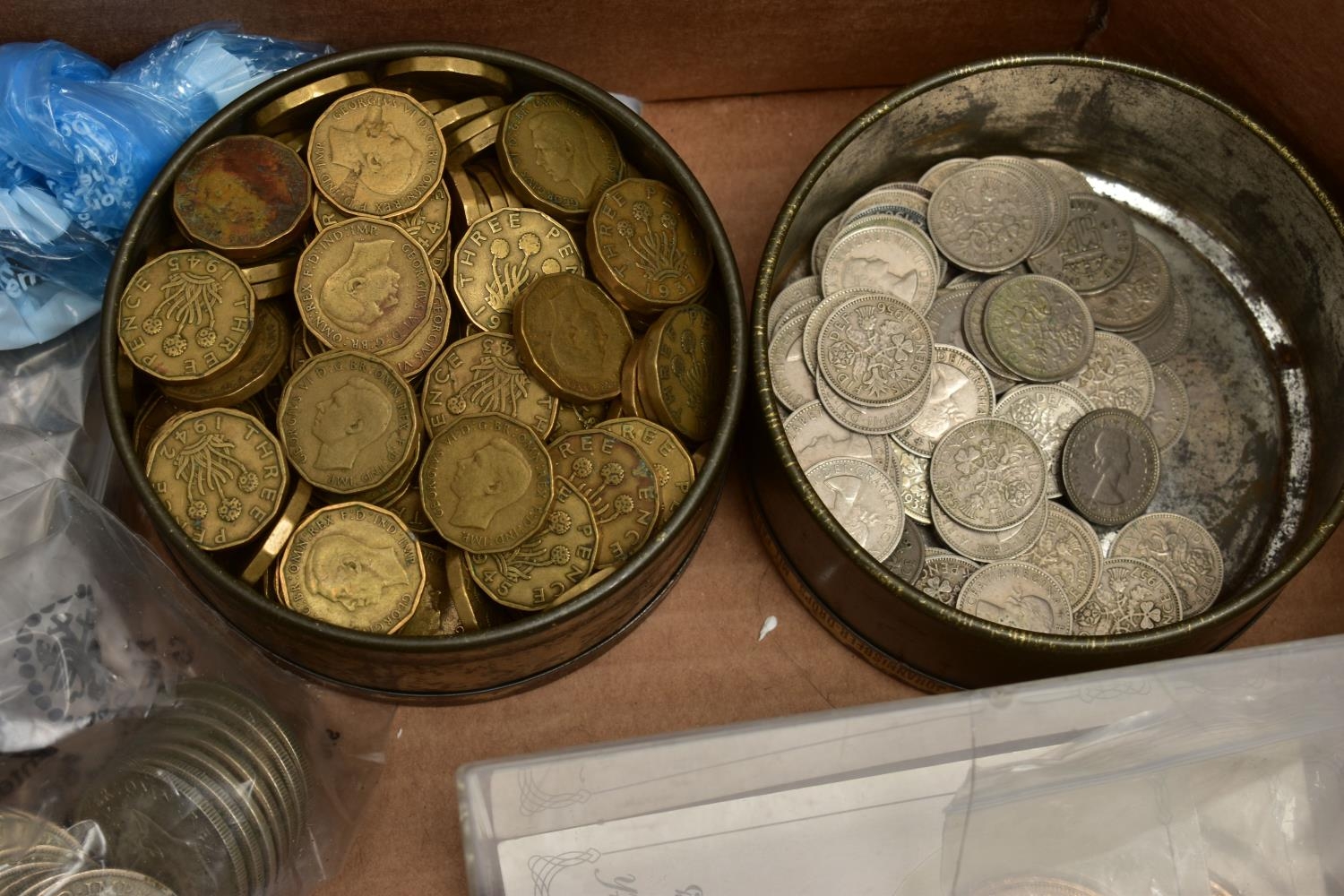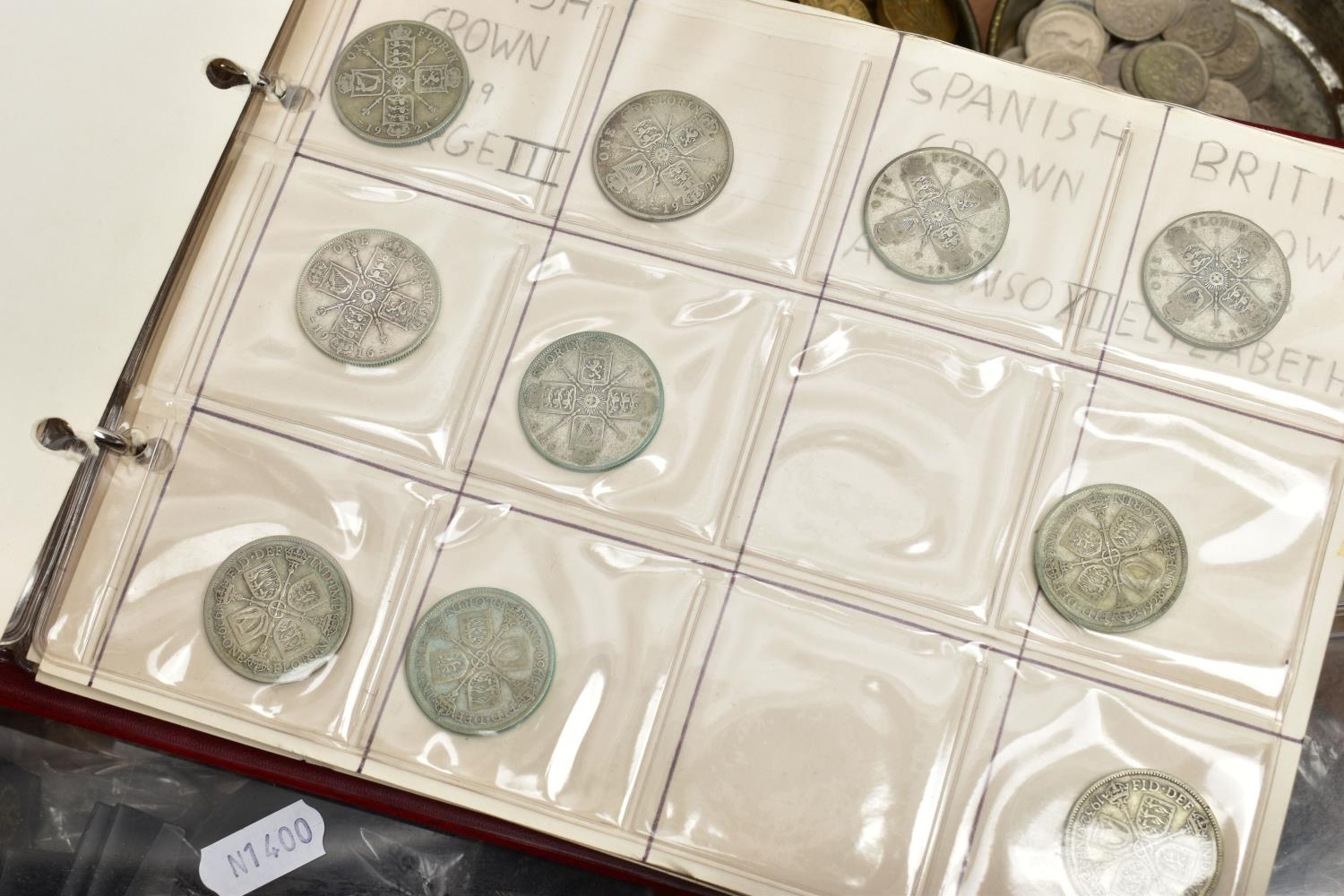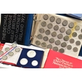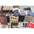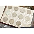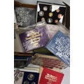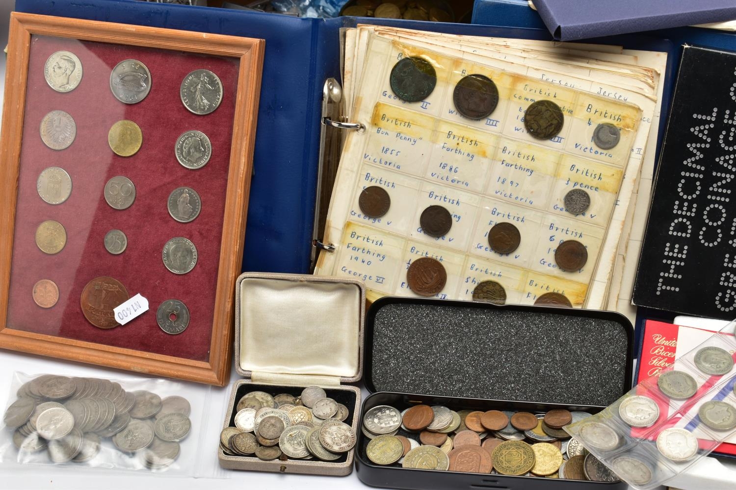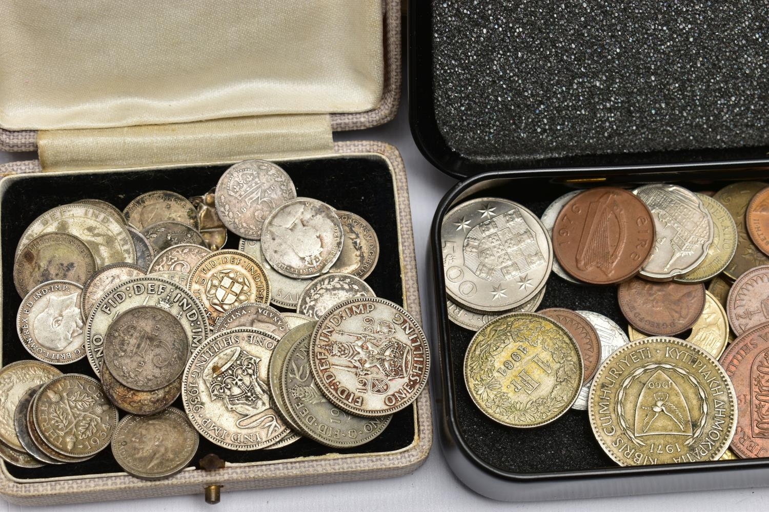 TWO BOXES OF UK AND WORLD COINS SOME LOOSE AND SOME IN THREE ALBUMS, to include a George III crown 1819, Charles II crown 1673, Spain 5 pesetas, 1976 100 pesetas 1885, Morgan Dollar 1921, Victoria good grade penny, 1855,1935,1951 crowns, 1972 Bermuda silver crown, lots of florin shillings sixpence and three pence silver coins, a USA bicentennial silver proof set of coins,1970,71,72,73,74,75,76,77,78,80,81,82 UK year set of coins, four proof coin sets 1983,84,85,86, etc