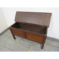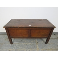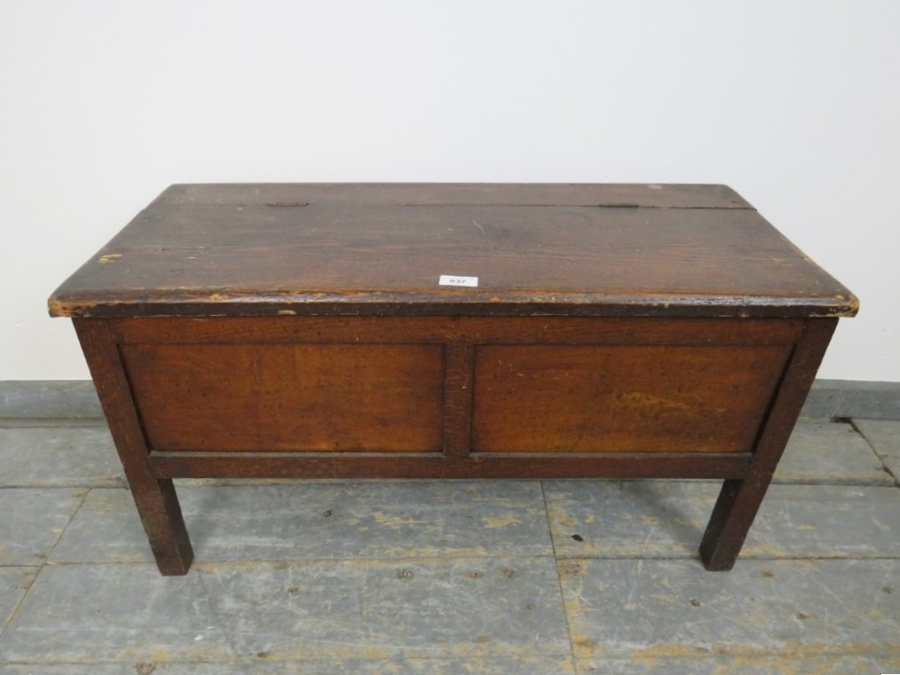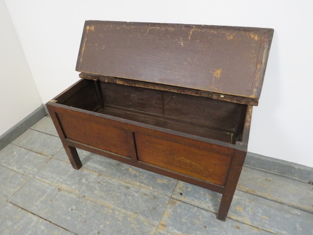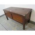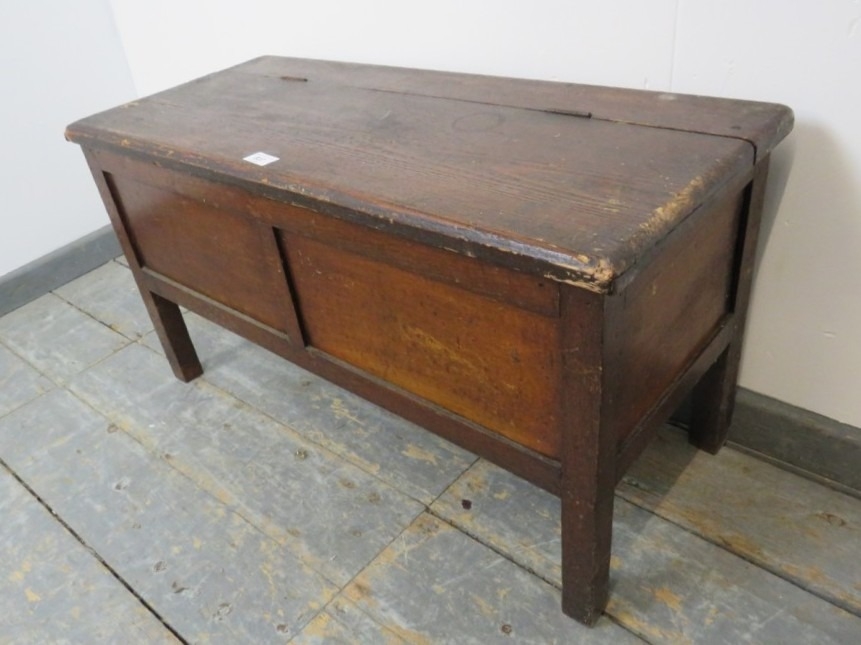 An antique pitch pine coffer upon stile supports. H43cm x W81cm x D35cm approx.
