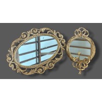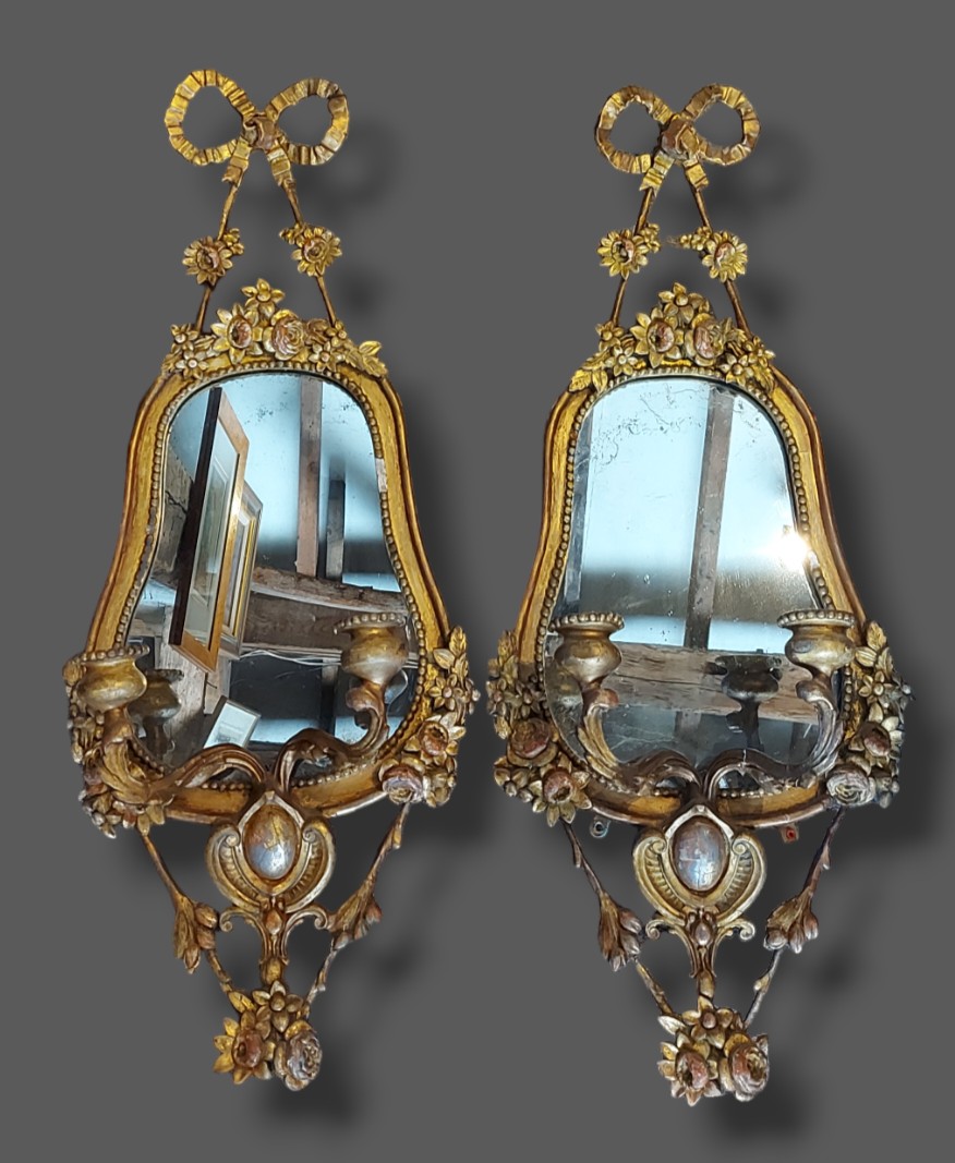 A pair of gilded Girandole of shaped form, each with a bow cresting, 82cms x 35cms