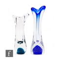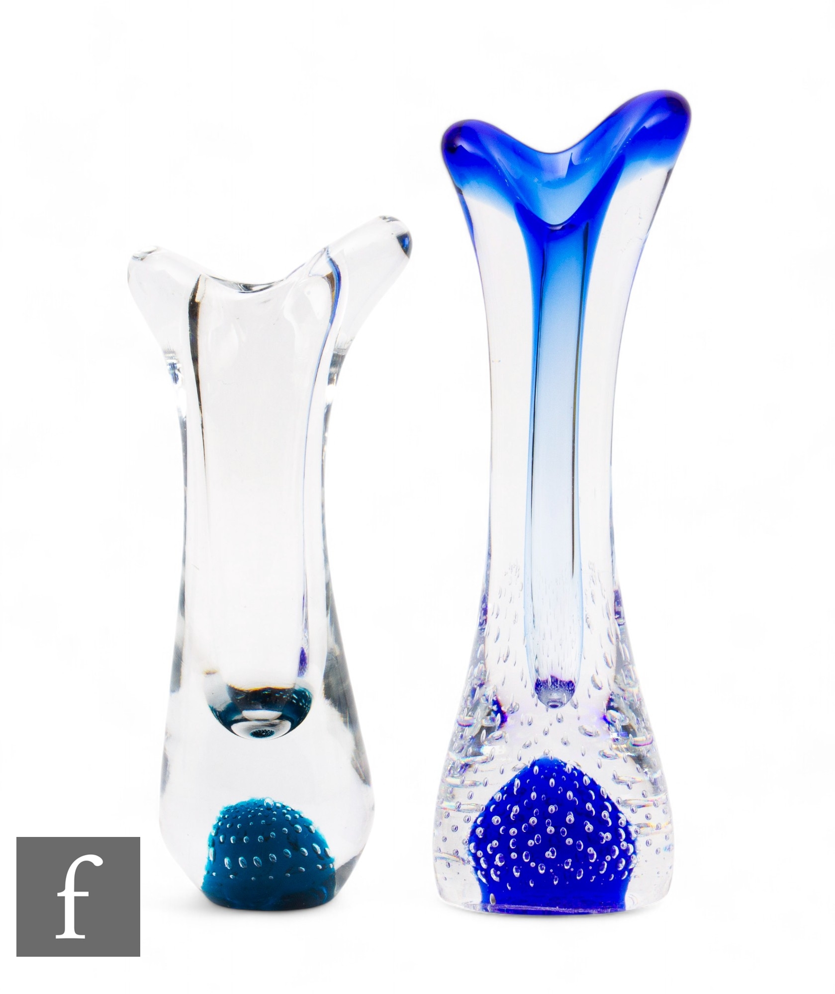David Hammond - Thomas Webb & Sons Flair - A post war Flair range vase of slender waisted form to a pulled rim internally decorated with controlled air bubbles to the blue core all cased in clear crystal, together with a similar smaller example in aqua, tallest 27cm. (2)