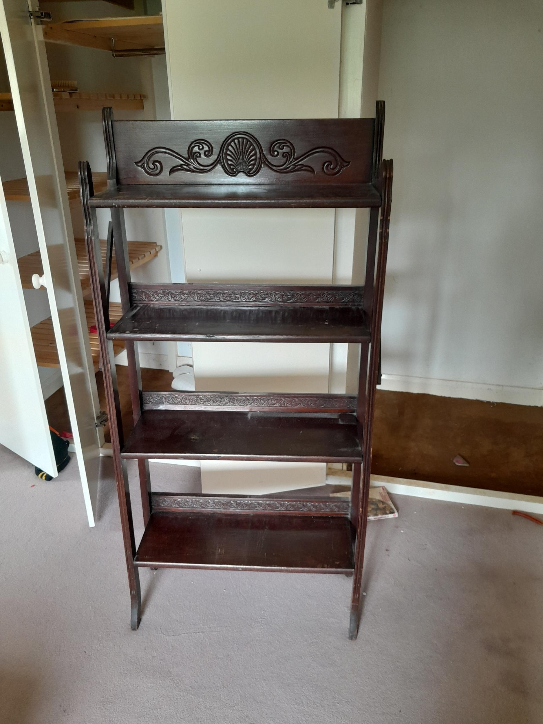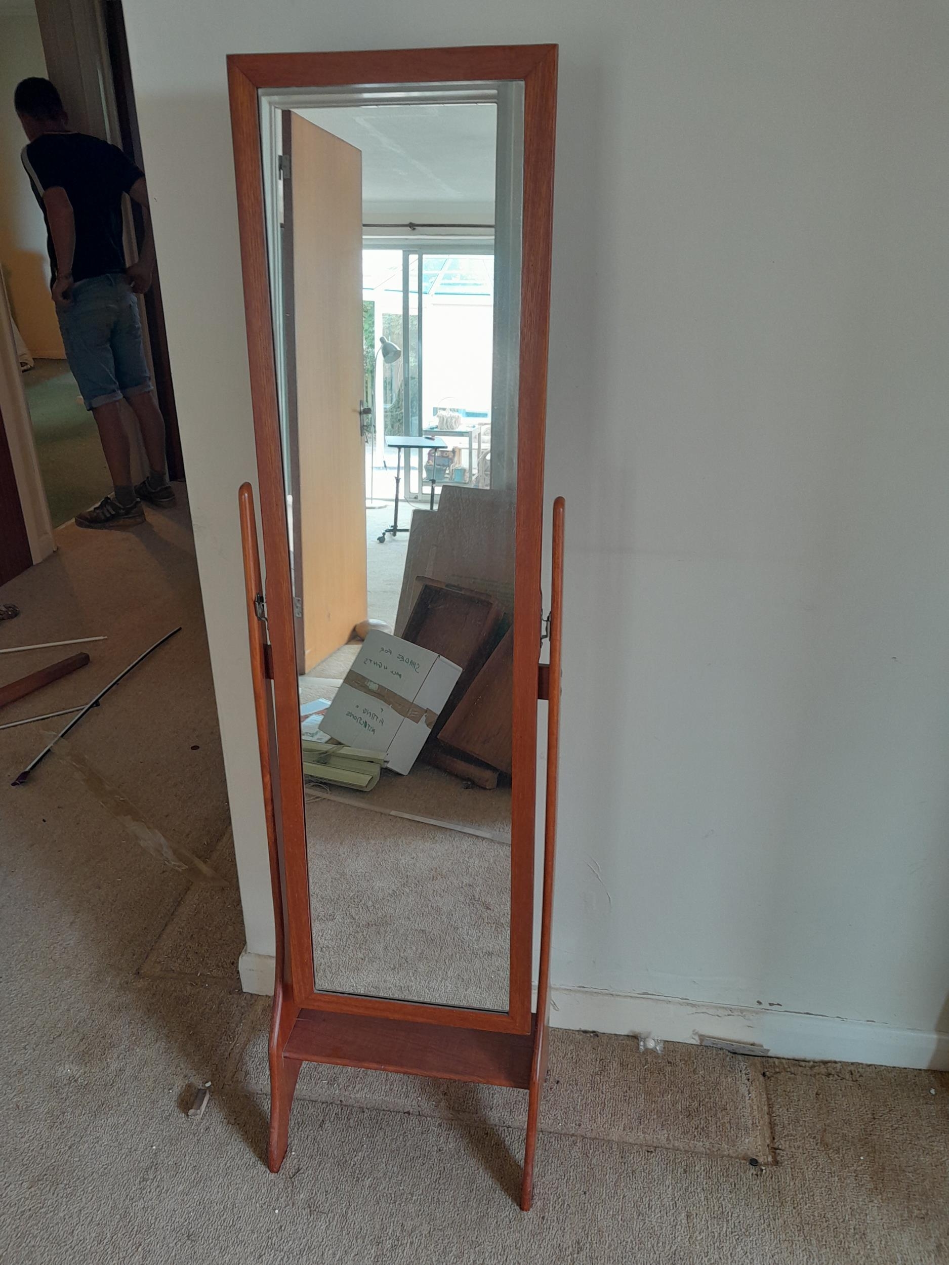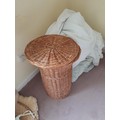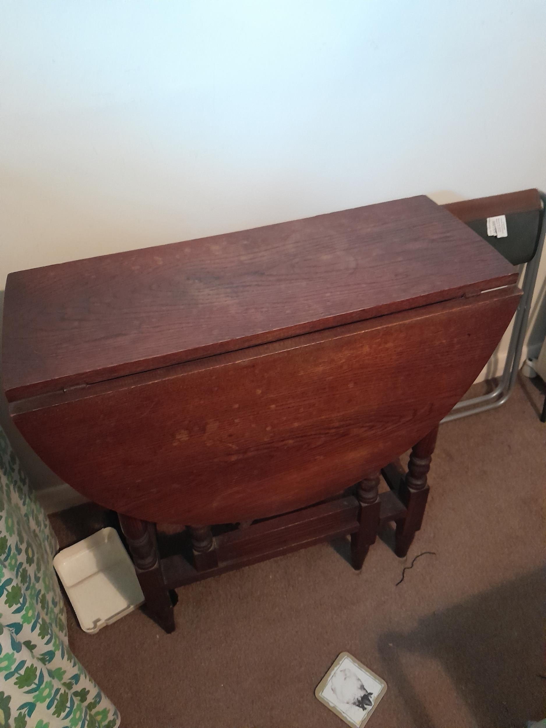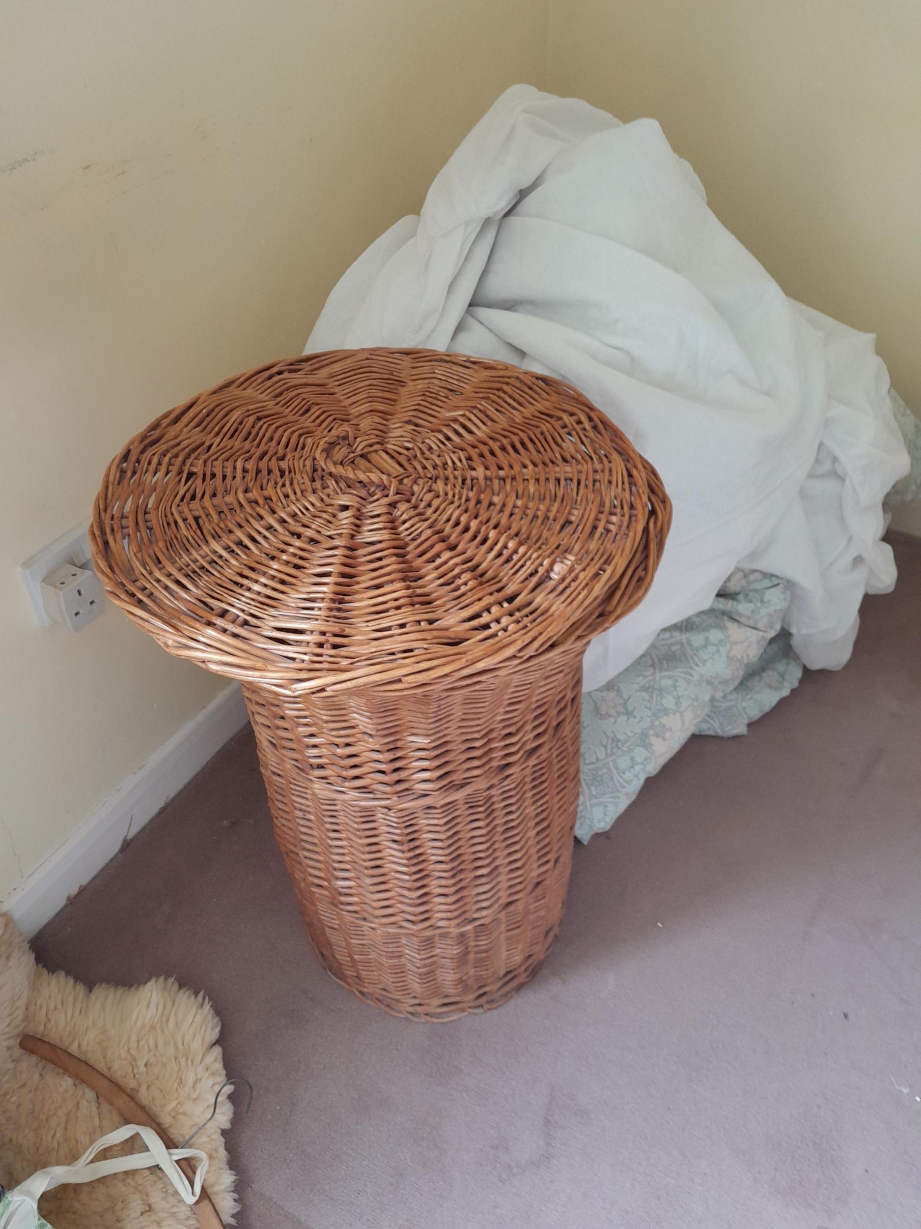 Wicker basket, oak pedestal table, oak gateleg table, cheval mirror and bookcase