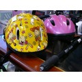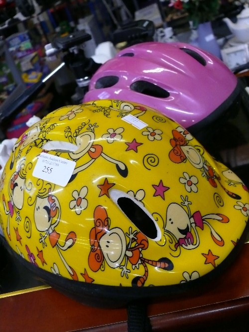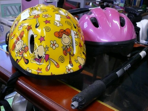 TWO BICYCLE SAFETY HELMETS PLUS A BICYCLE PUMP