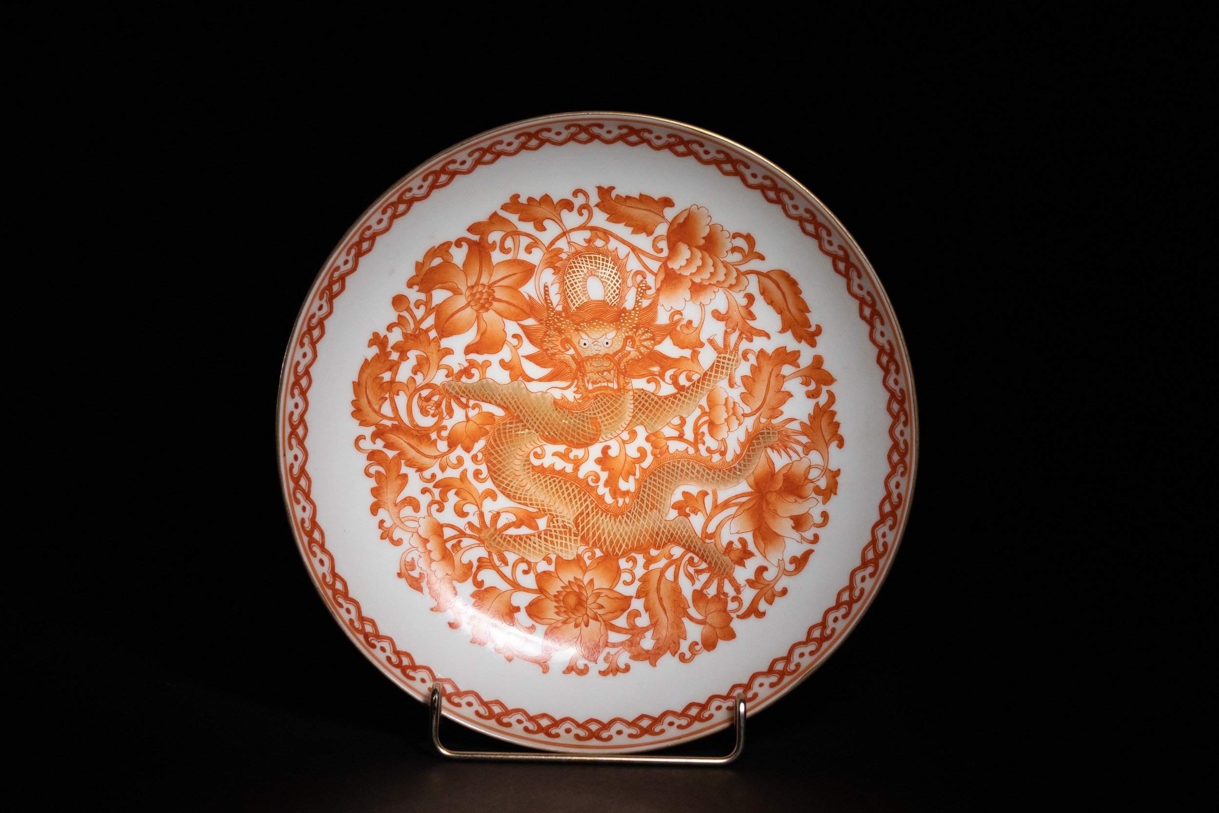 A Chinese Iron-Red and White Porcelain Dish with Dragon and Floral Scrolls.