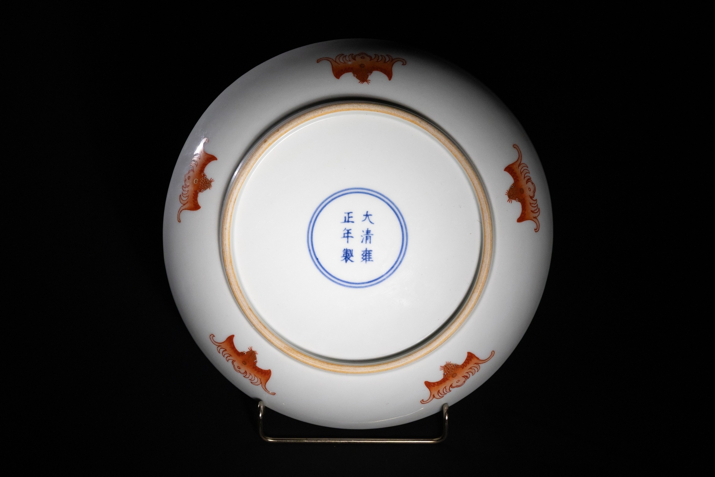 A Chinese porcelain dish decorated in iron-red enamel against a pure white glaze. The central motif features a finely rendered five-clawed dragon amidst peony blossoms and curling foliage, all enclosed within a scrolling border. The reverse is sparsely adorned with four stylised bats in iron red. The six-character reign mark of the Qing dynasty, Da Qing Yongzheng Nian Zhi, possibly indicating the period or origin of the piece.