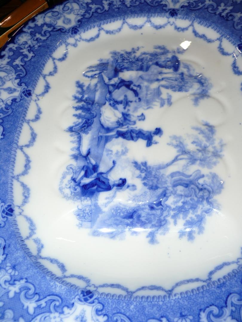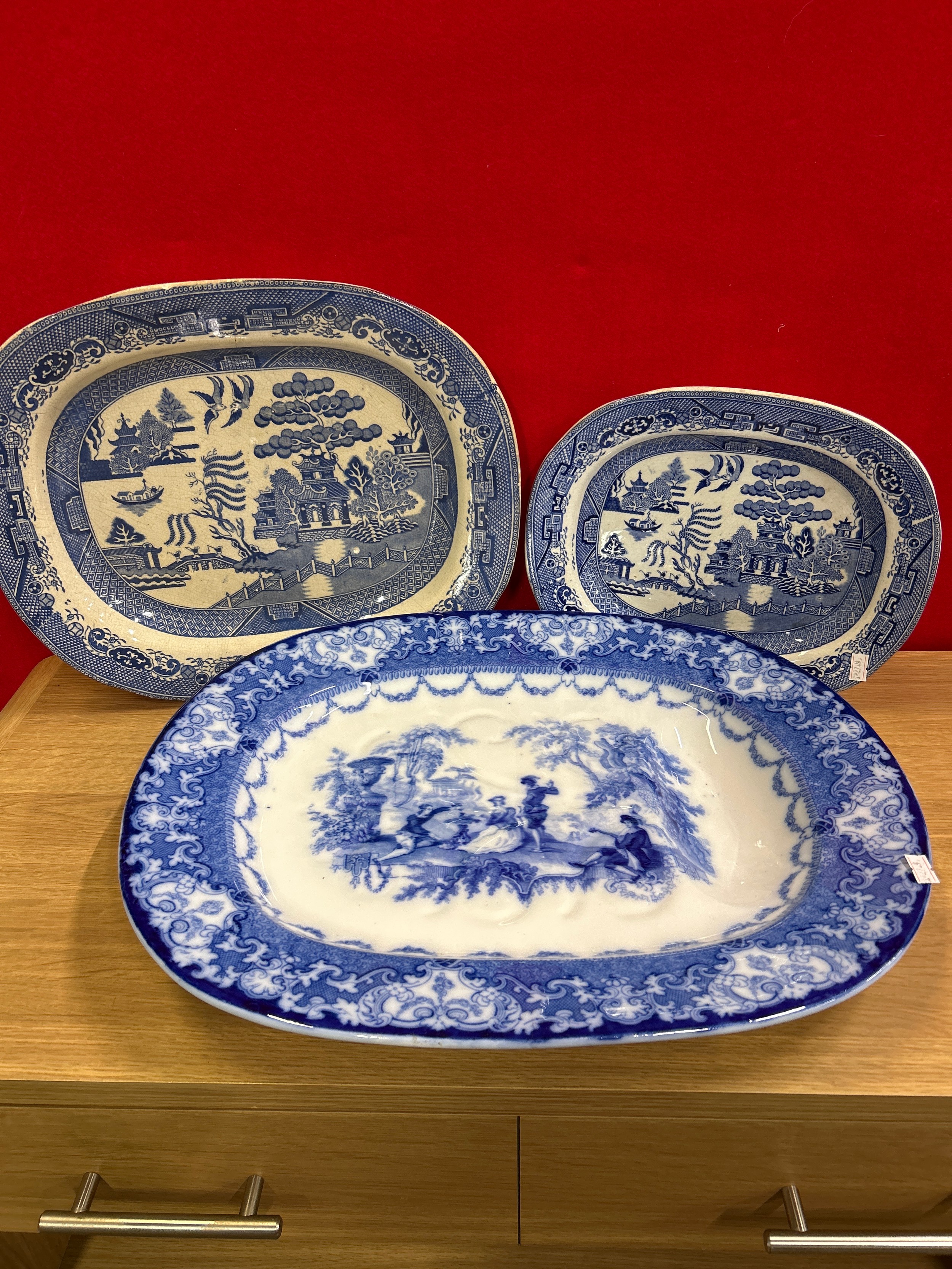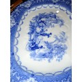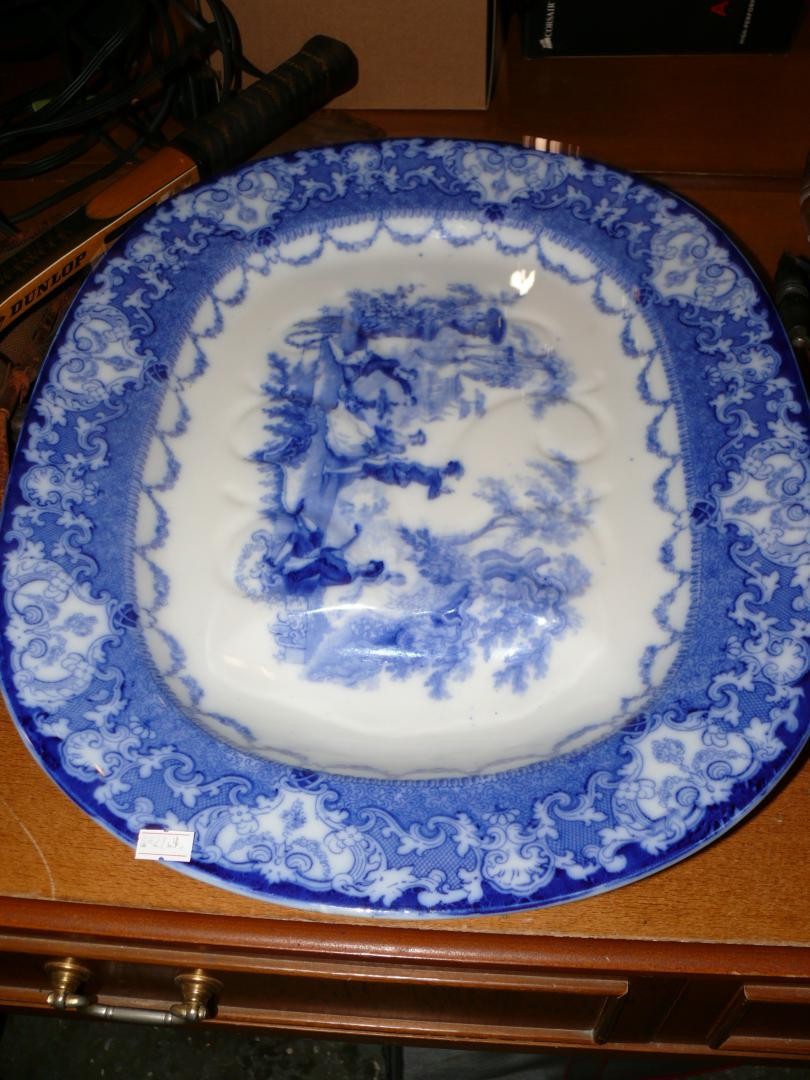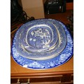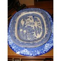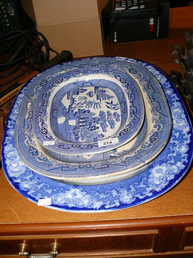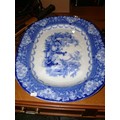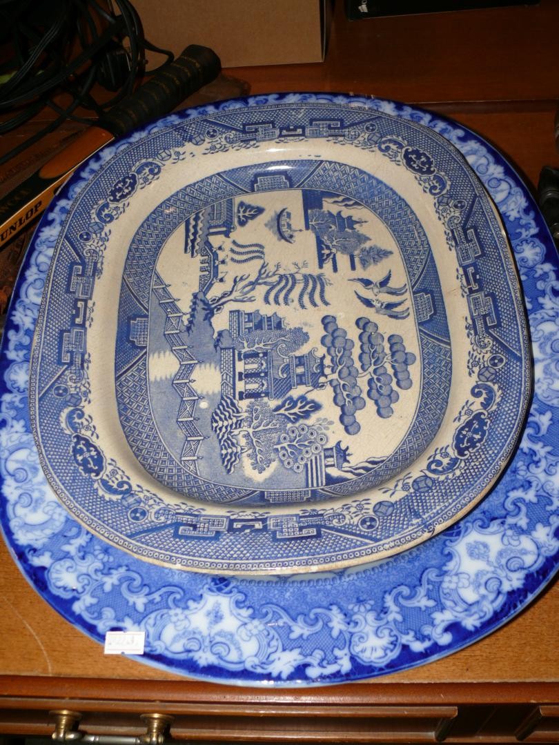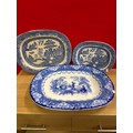 Large Antique flow blue meat platter by Doulton plus 2 blue & white willow pattern platters