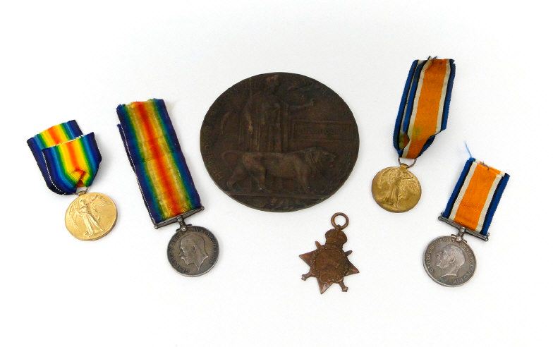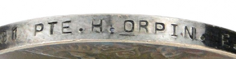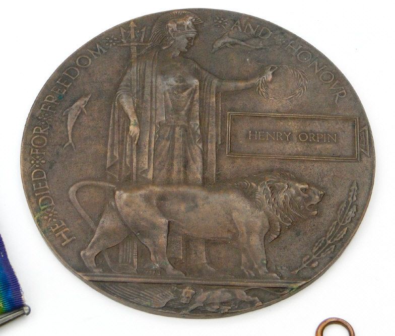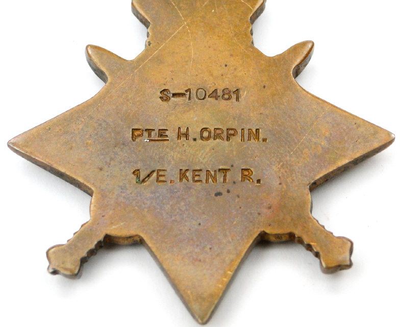World War I British military family medal group comprising 1914-18 War medal, Victory medal and 1914 Star and death plaque, together with another 1914-18 War medal and Victory medal, the former for S-10481 PTE.H.ORPIN.1/E.KENT.R., the latter for 2521 PTE.W.C.ORPIN.E.KENT..R., the medals marked to the rims