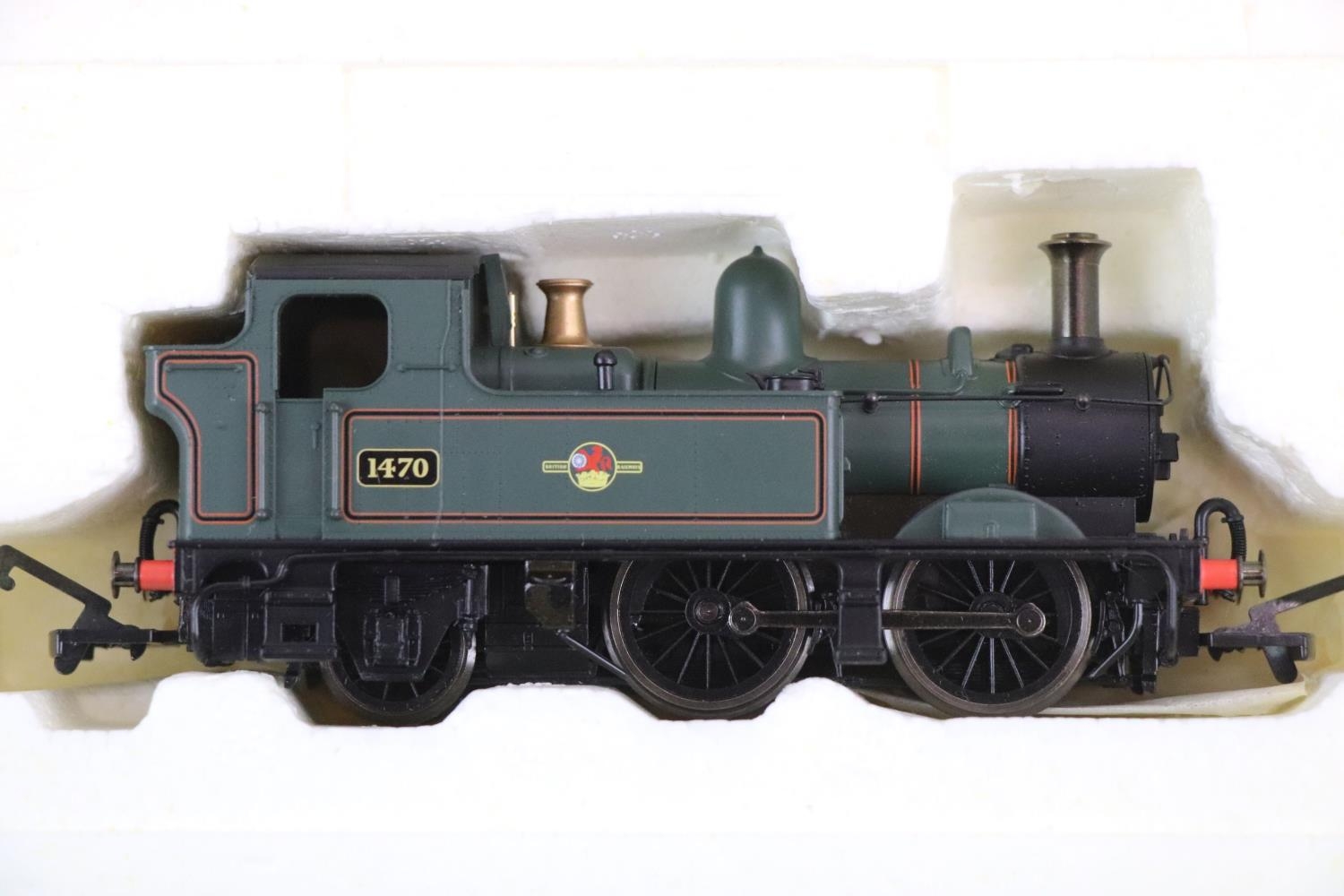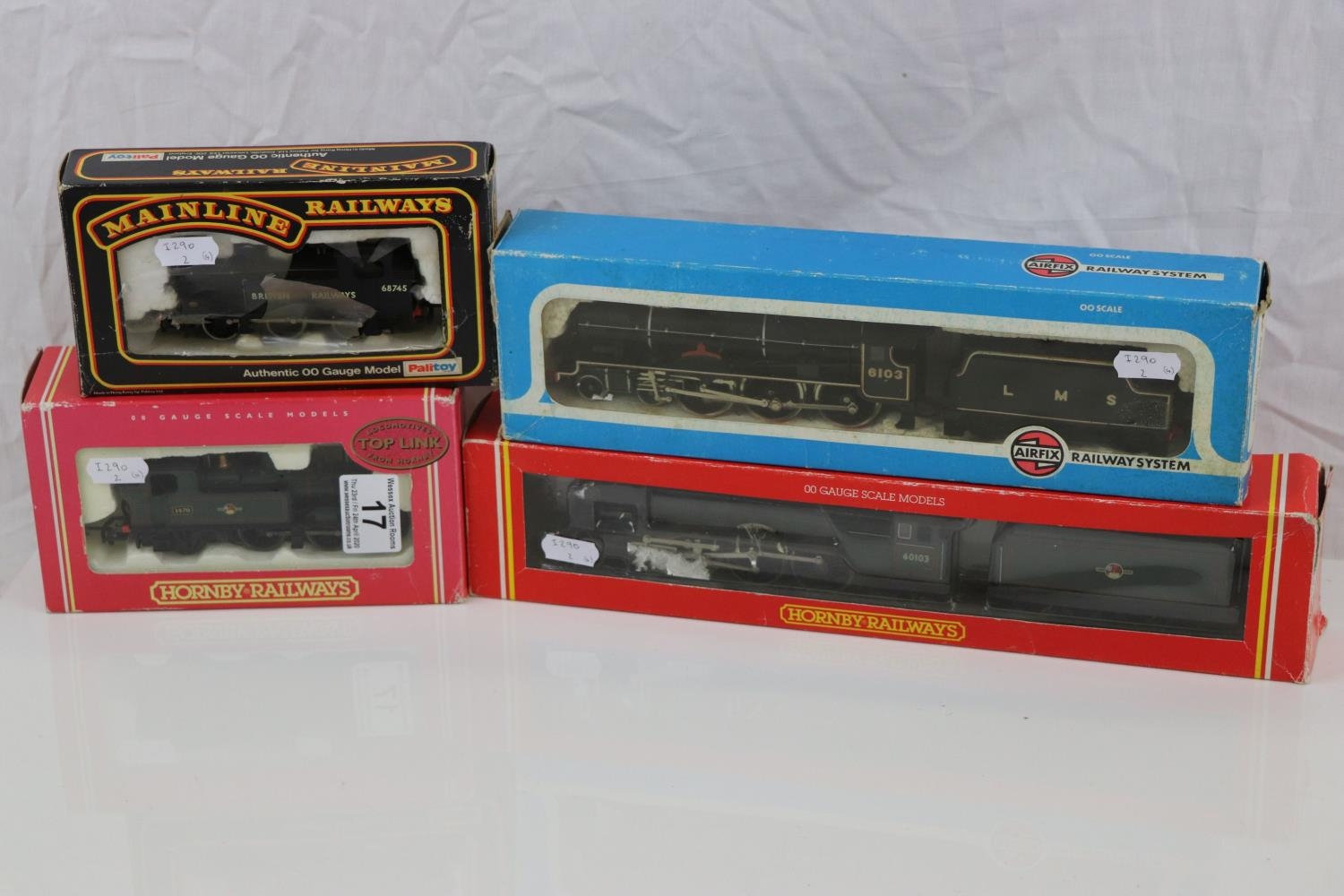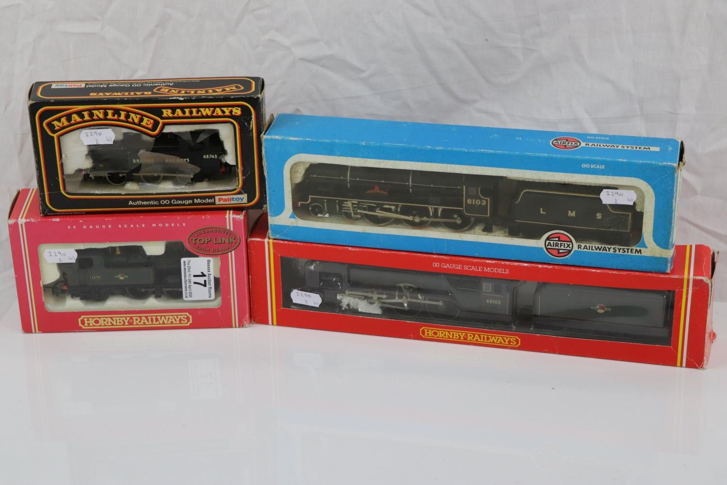 Four boxed OO gauge locomotives to include Hornby R078 BR 4-6-2 Loco Flying Scotsman Class A3, Hornby Top Link R2095B BR 0-4-2T Class 14XX Locomotive 1470, Airfix 54120-0 Royal Scots Fusilier LMS Livery and Mainline 37055 0-6-0T J72 Class Tank Locomotive BR Livery, tatty boxes