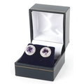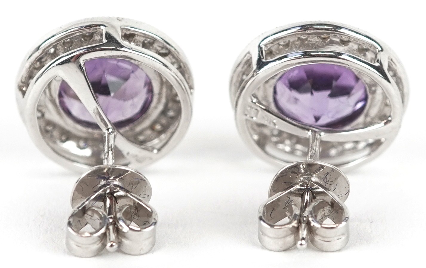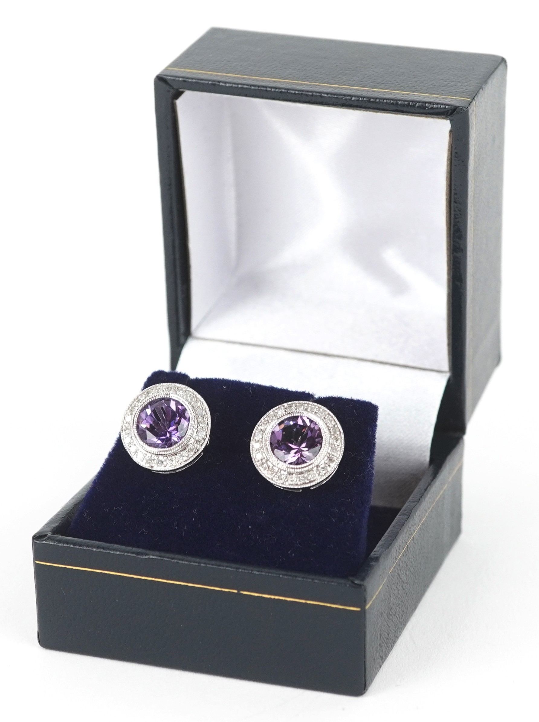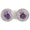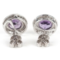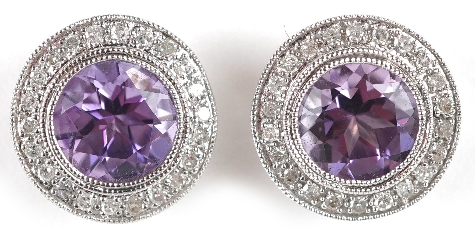 A pair of 9ct white gold amethyst and diamond cluster earrings, total diamond weight approximately 0.40 carat total amethyst weight approximately 2.20 carat, 12.4mm in diameter, total 3.8g.
