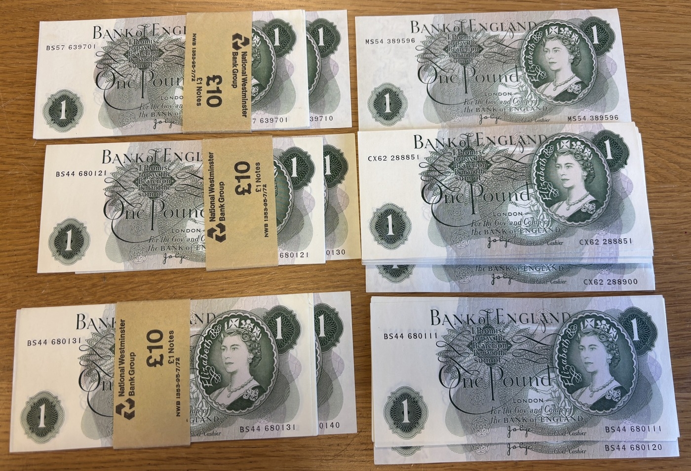 J.B. Page. Range of £1 notes, generally extremely fine with some better, including BS44 680111-140, BS57 639701-710, CX62 288851-900 and MS54. Qty 91. (N)