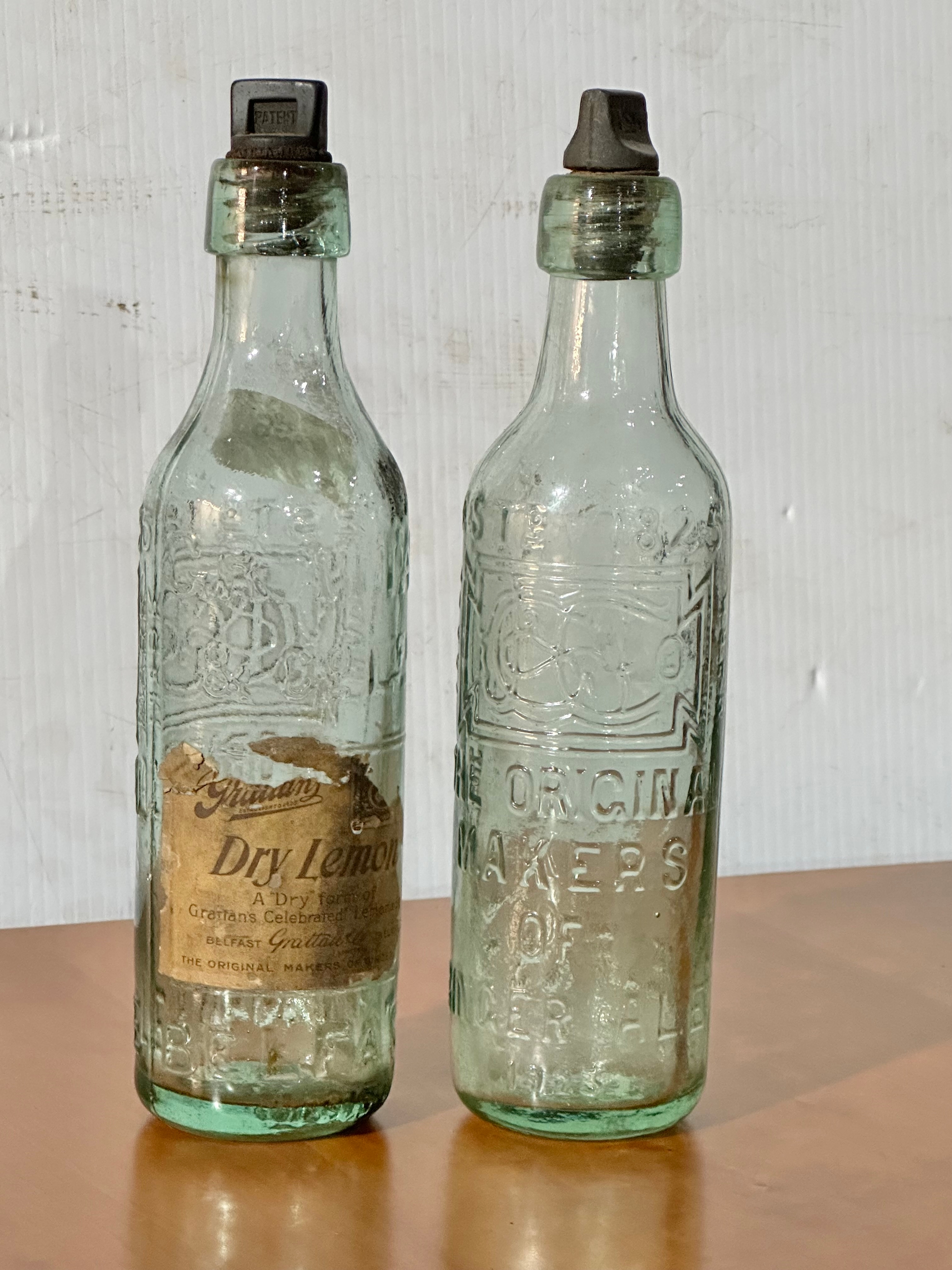 2 vintage Grattan’s glass bottles. Grattan’s Belfast bottle, the original makers of ginger ale. 25cm