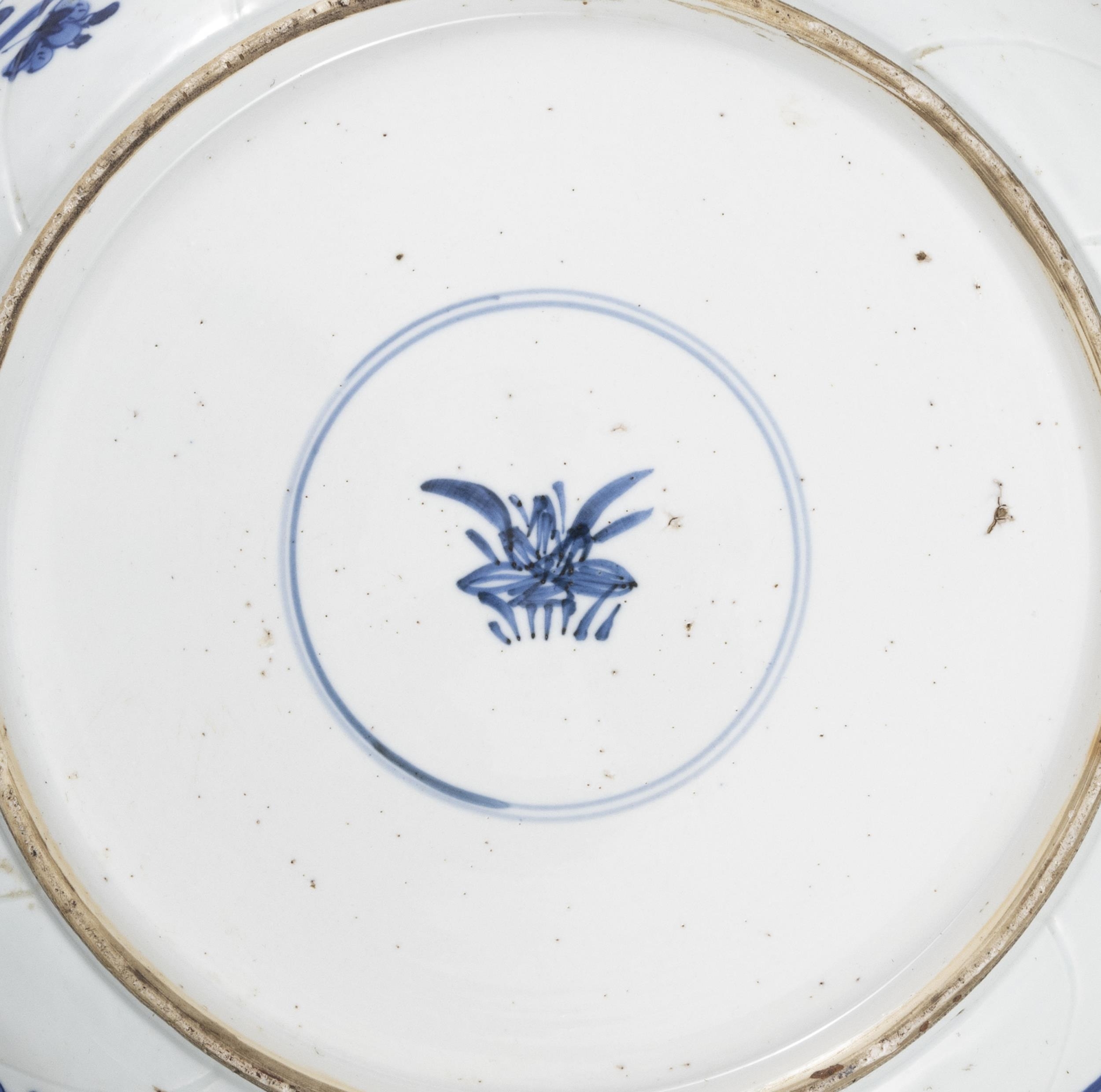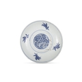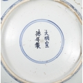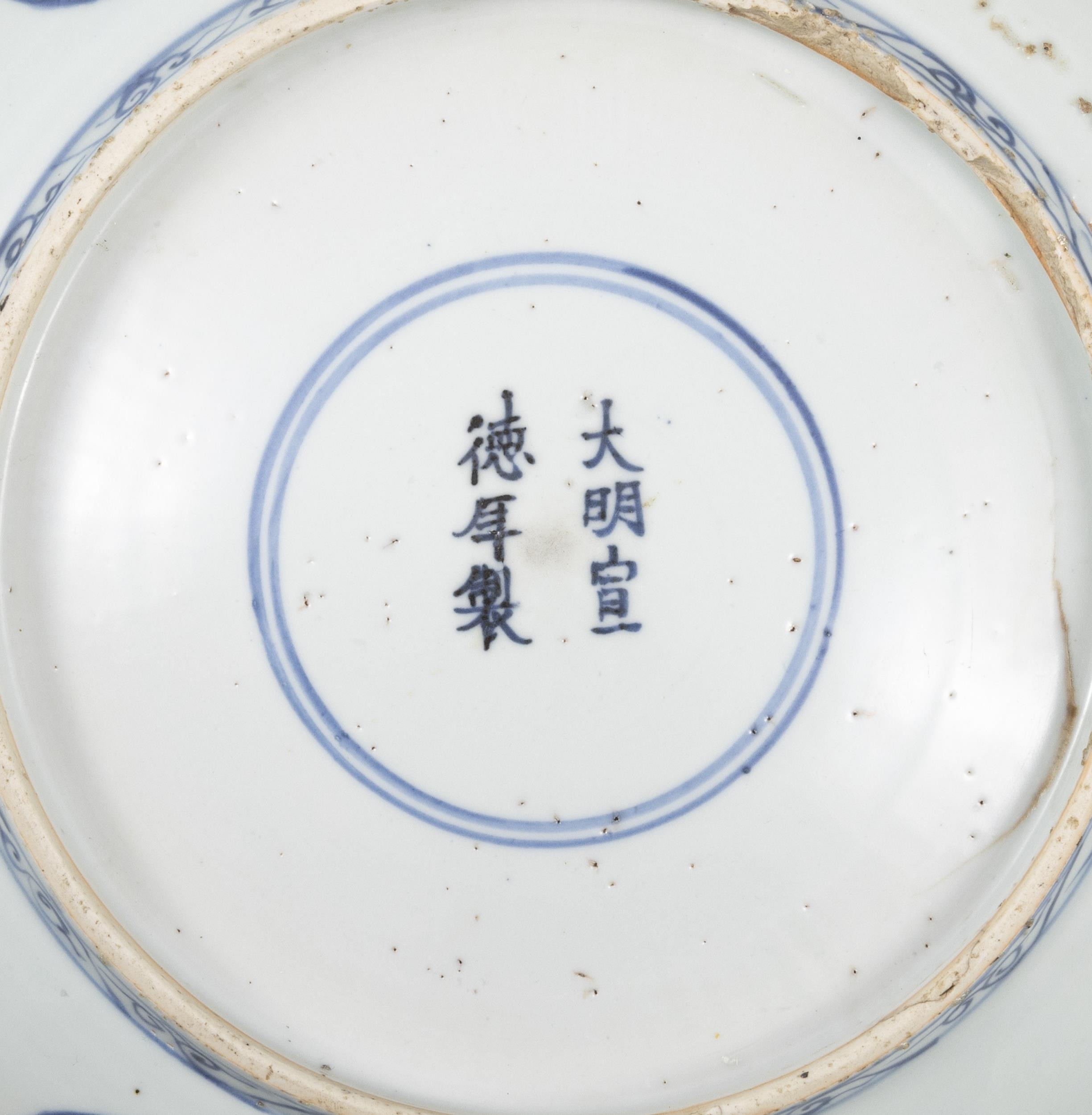 TWO BLUE AND WHITE CHARGERS, ONE FLOWER-SHAPED DECORATED WITH FLOWERS AND LANDSCAPE, MARKED WITH A FLOWER; THE OTHER ONE WITH A DRAGON IN THE CENTER, MARKED XUANDE ?? ???????????????? China, Ming dynasty D: 35cm; 30.5cm Provenance: Northern Irish private collection.