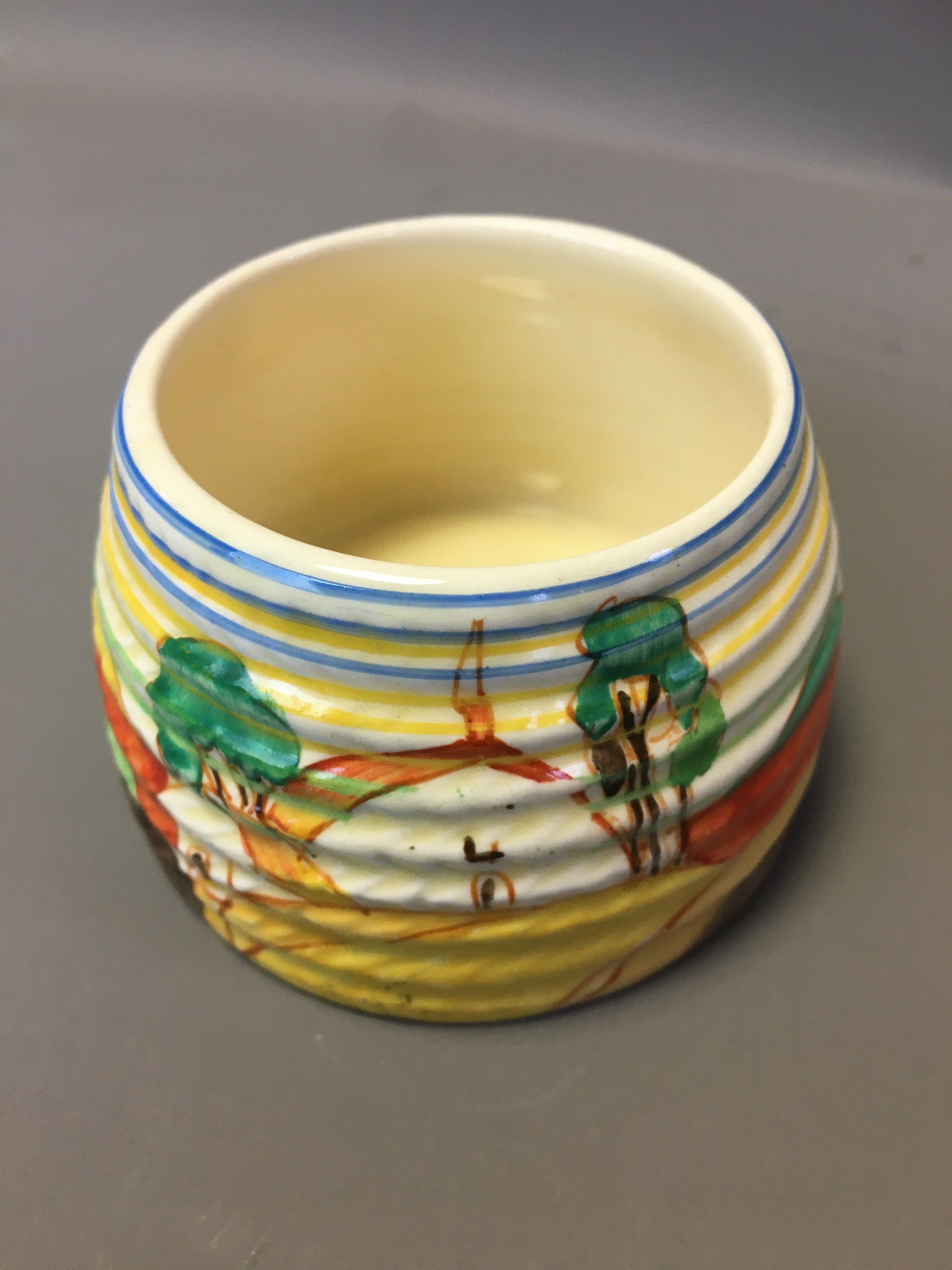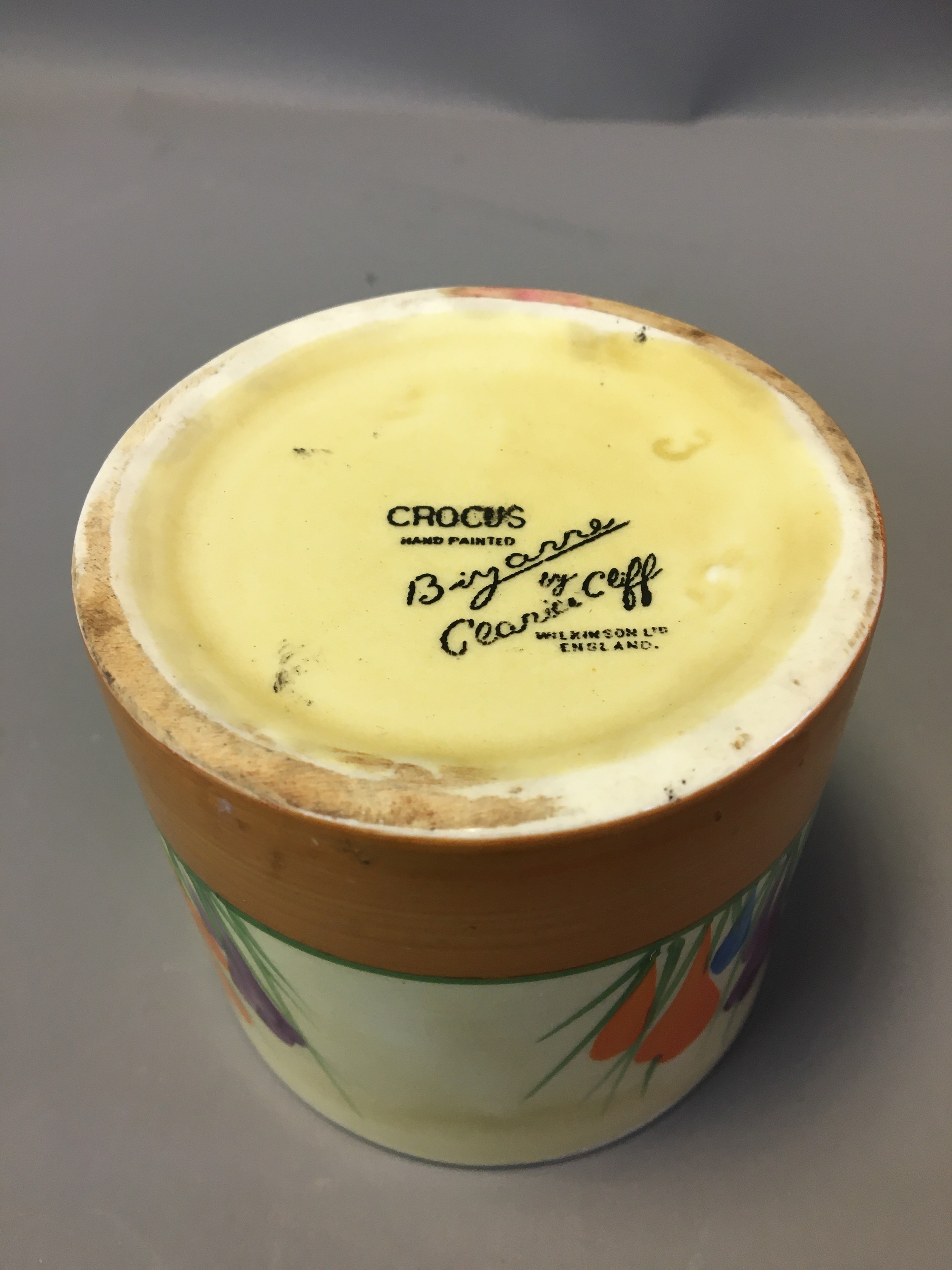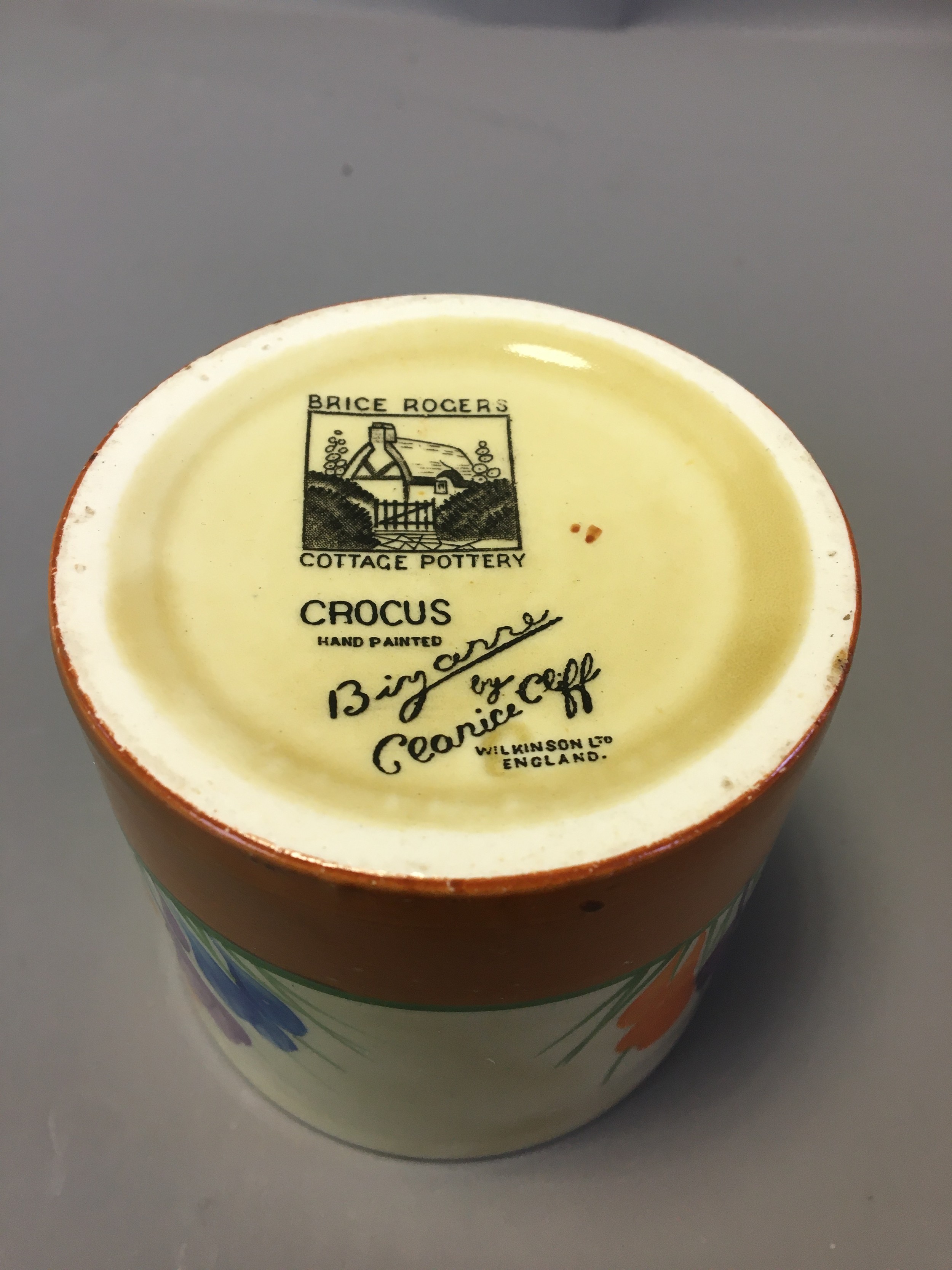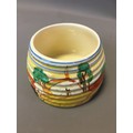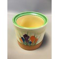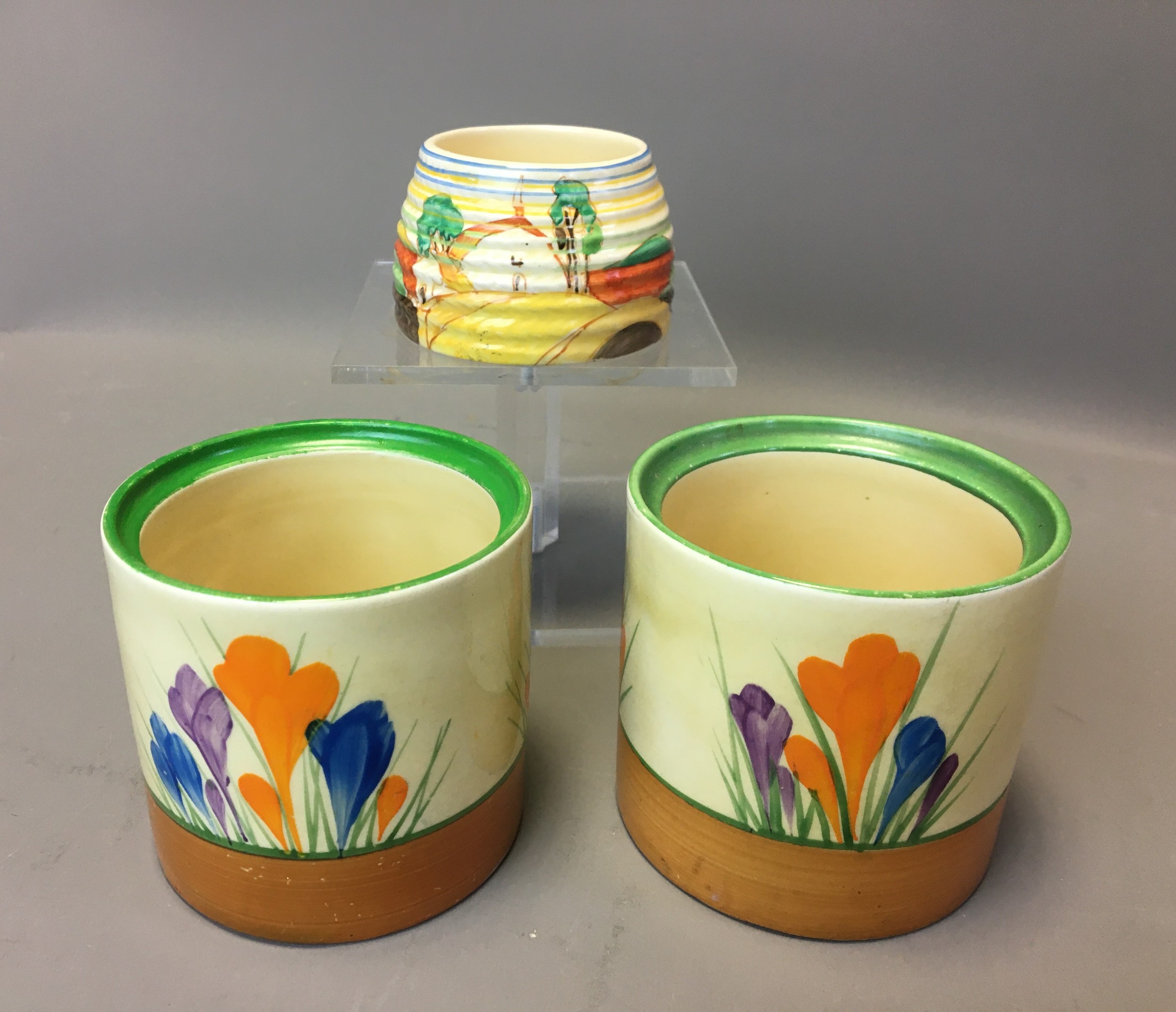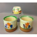 Art Deco Clarice Cliff 3 x Pots (No Lids) 2 x Crocus Pattern on with the Bruce Roger Cottage Pottery Mark and a Ribbed cottage Scene Honey Pot (Would have had the Bee Lid).