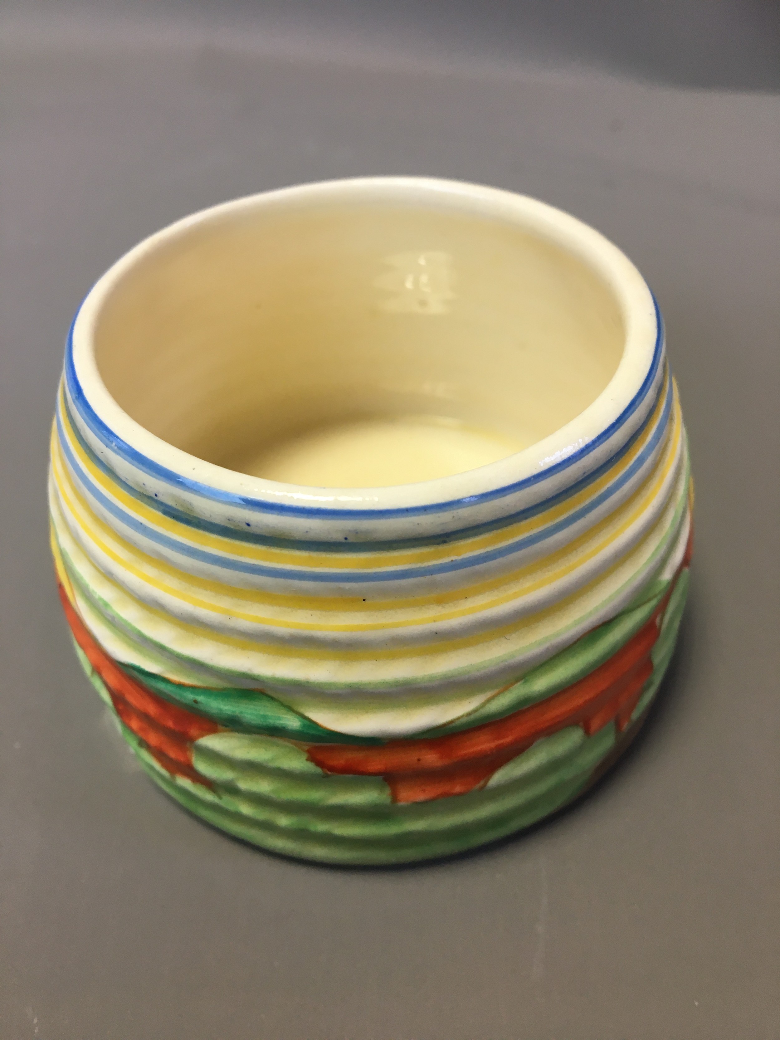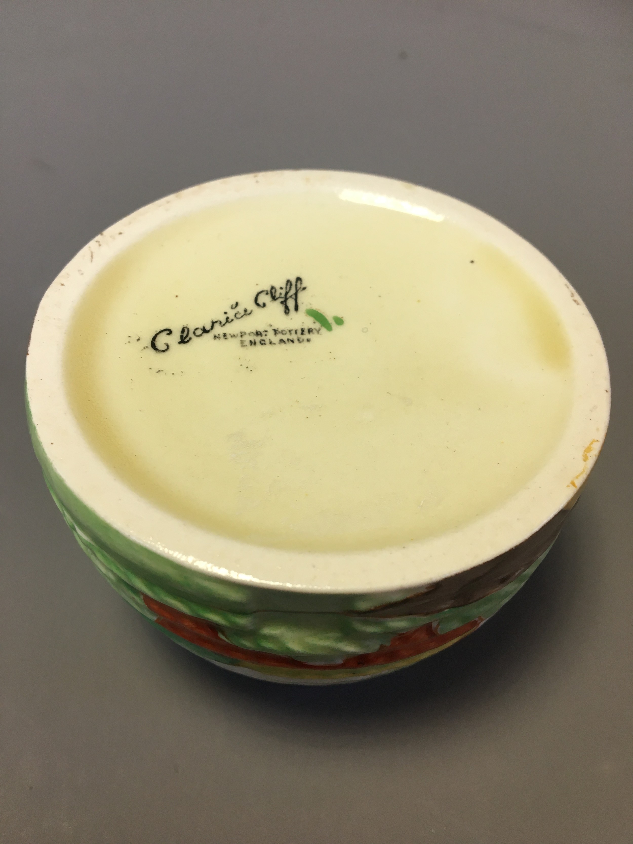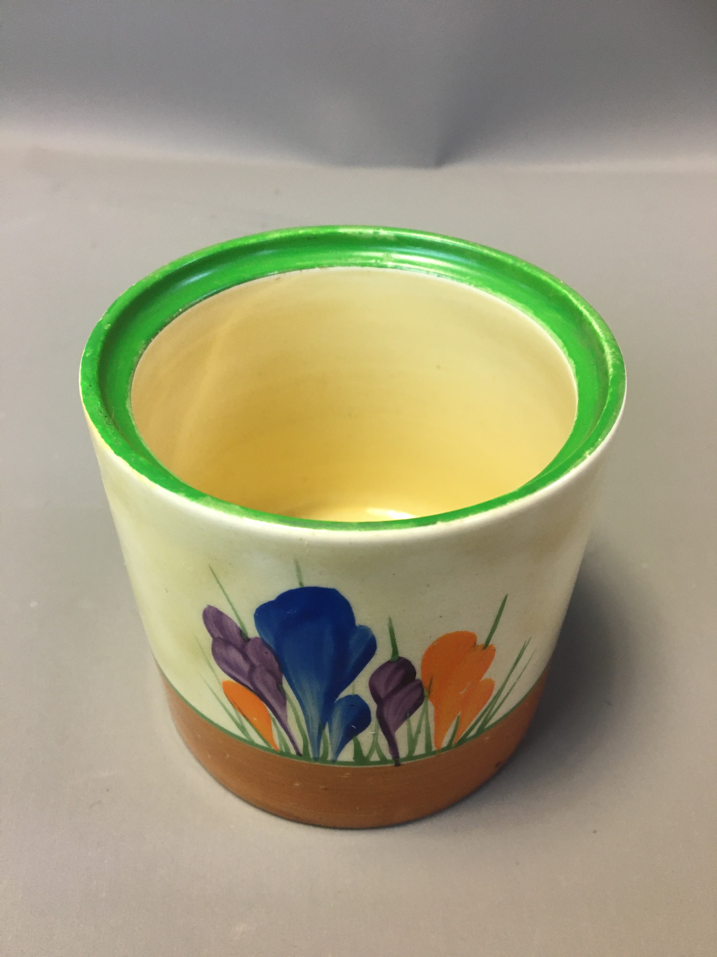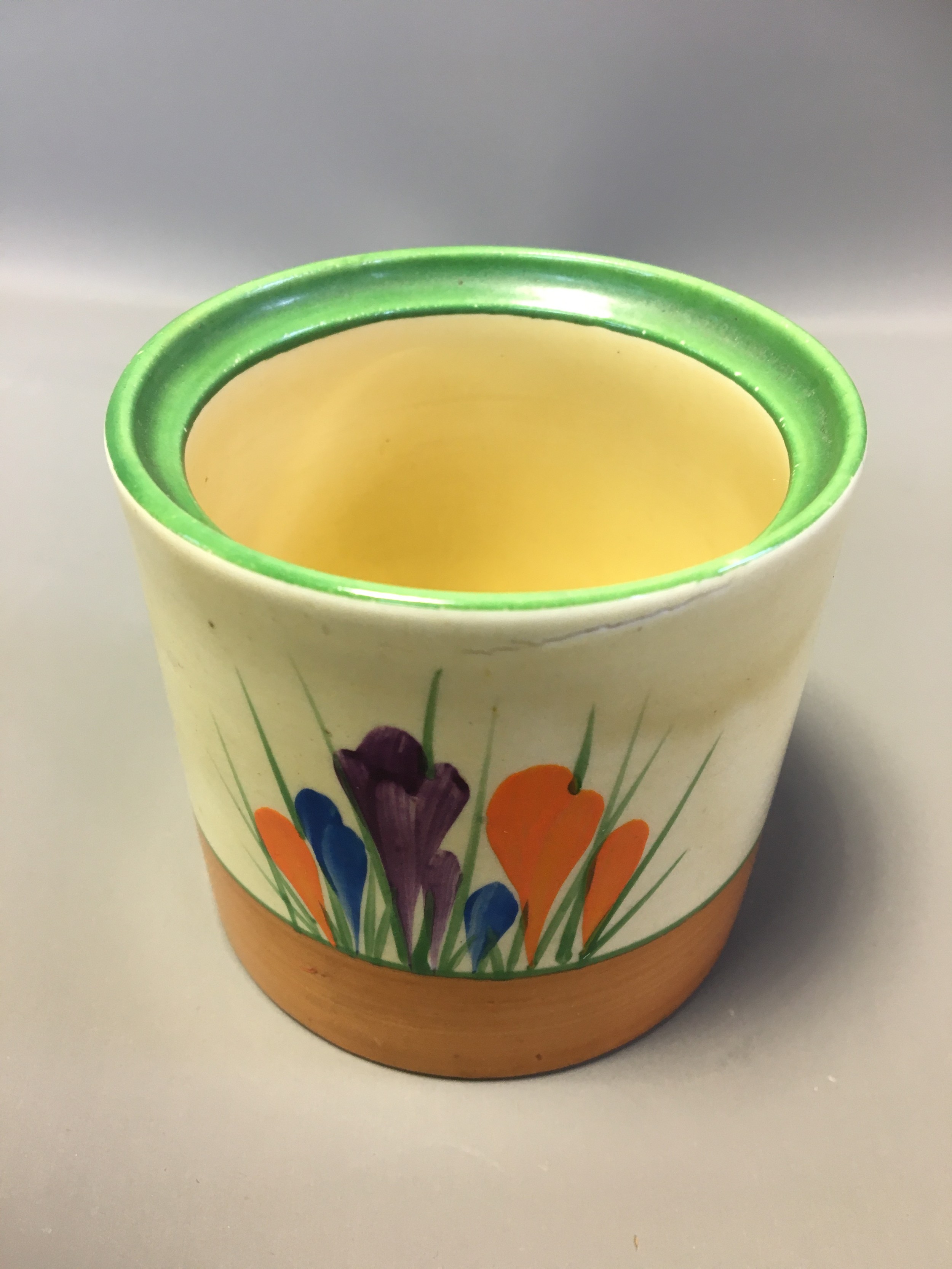 Art Deco Clarice Cliff 3 x Pots (No Lids) 2 x Crocus Pattern on with the Bruce Roger Cottage Pottery Mark and a Ribbed cottage Scene Honey Pot (Would have had the Bee Lid).