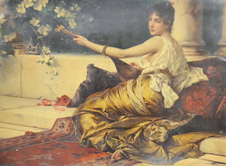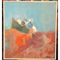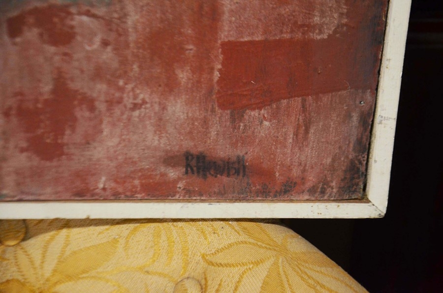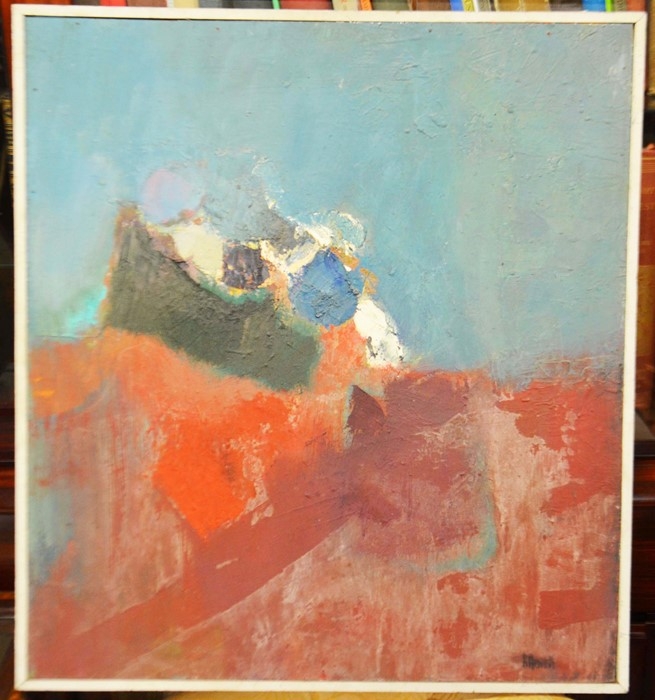 Roy Hewish (b.1929), Abstract Study - Hill Cluster, oil on board, signed, 64cm x 58cm, together with two 19th century oils of landscapes, and a print of a Classical maiden, all framed (4)