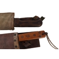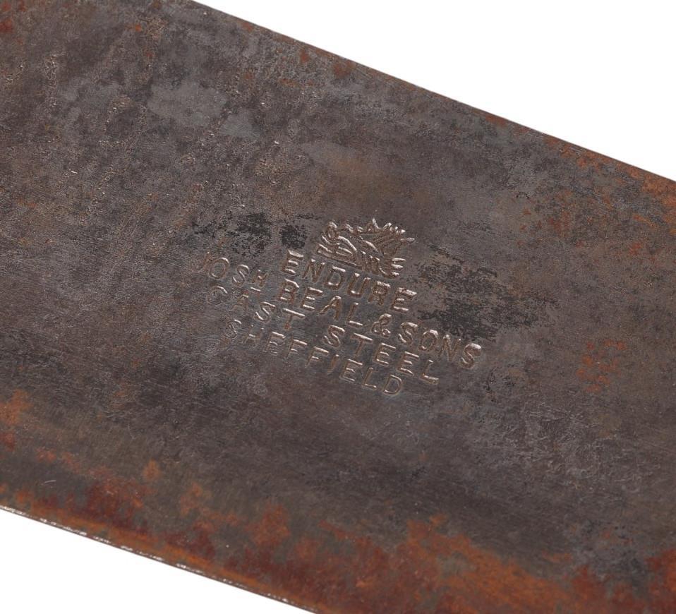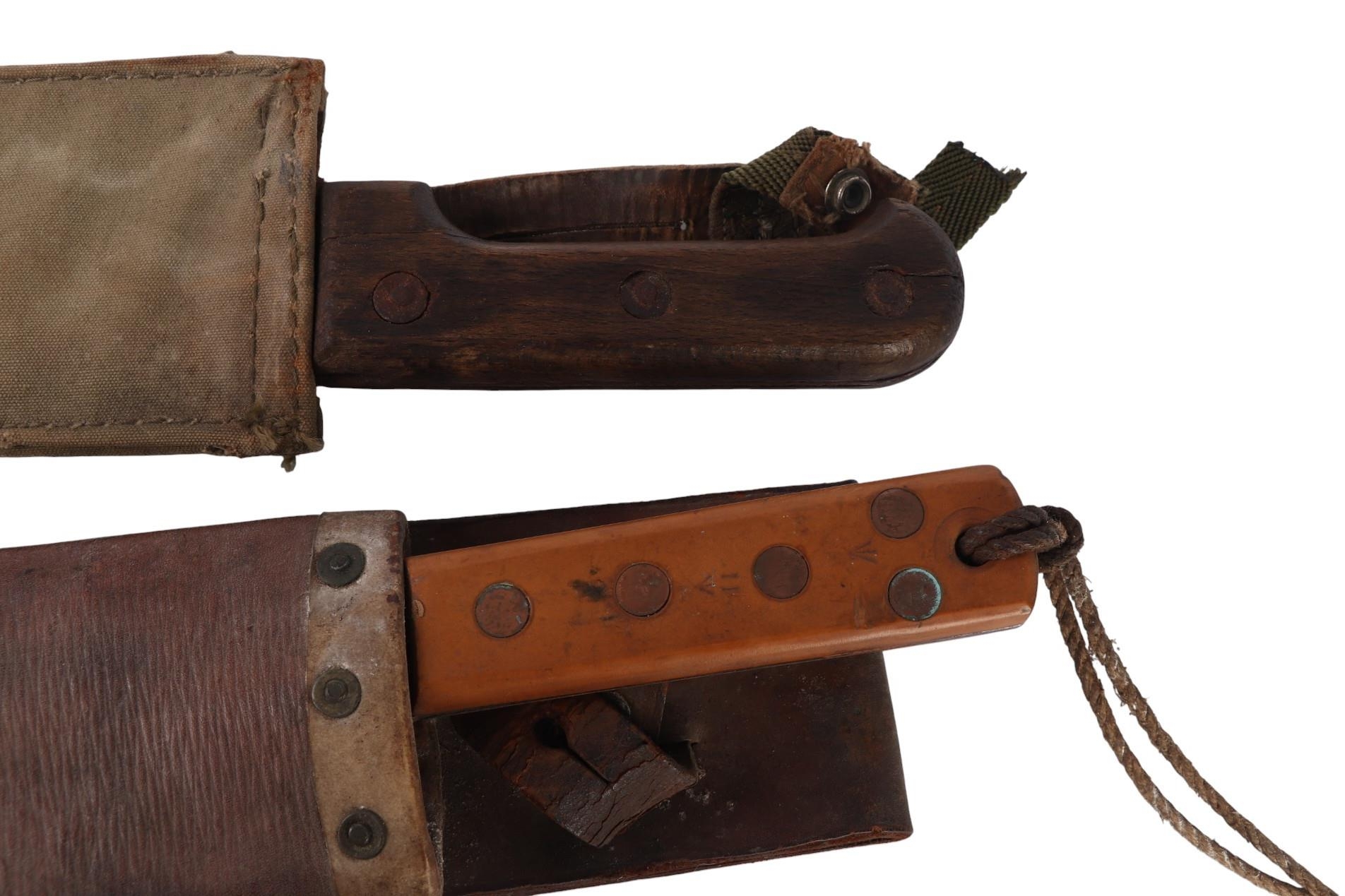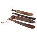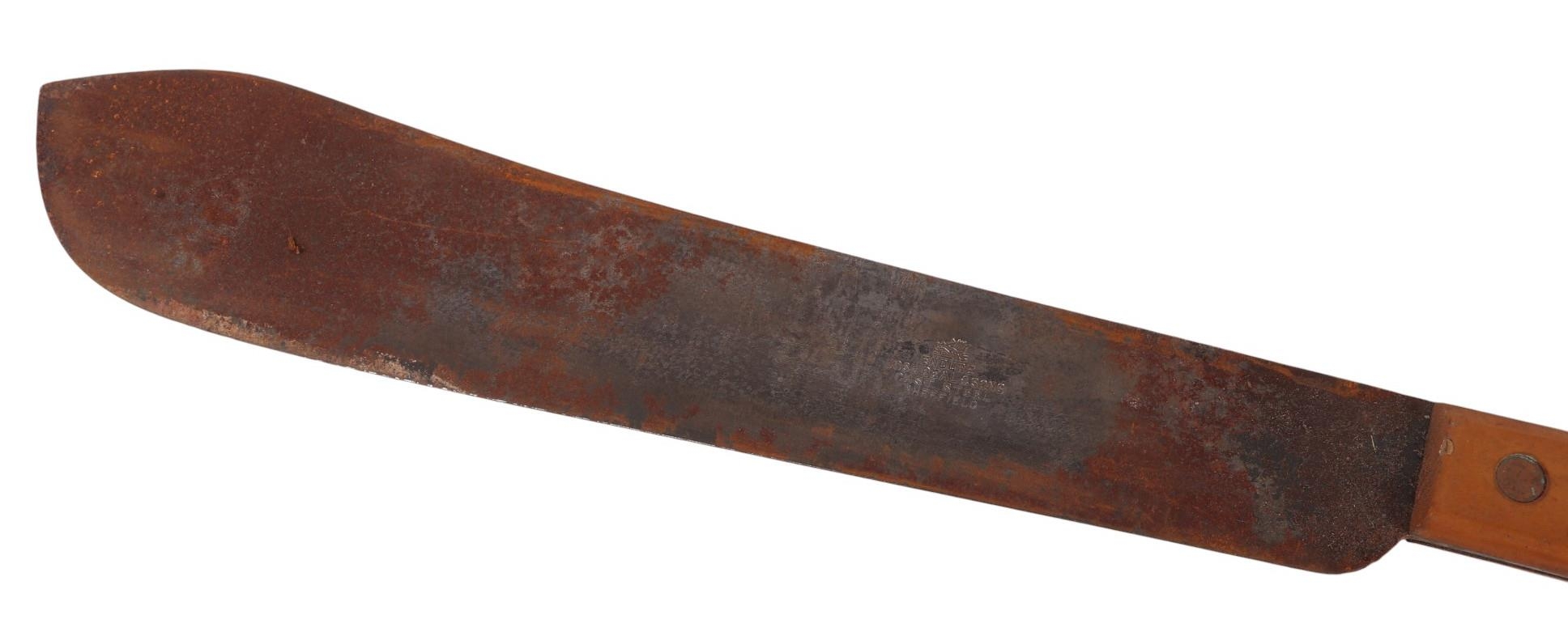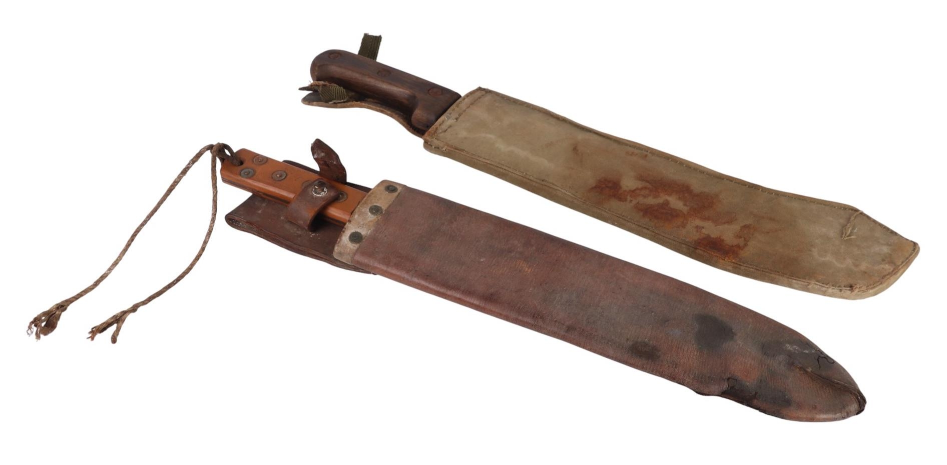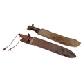 A French West Africa colonial army Panga Machette in its canvas scabbard. Having a 40cms Talbot Brand blade, together with a British Army machete with composite grips which are marked with the War Department Arrow above “11”, the blade is marked: ENDURE JOSHs BEAL & SONS CAST STEEL SHEFFIELD, in its leather scabbard which is impressed with the WD Arrow F.LTD. 1939. Blade length 37.5cms. (2)