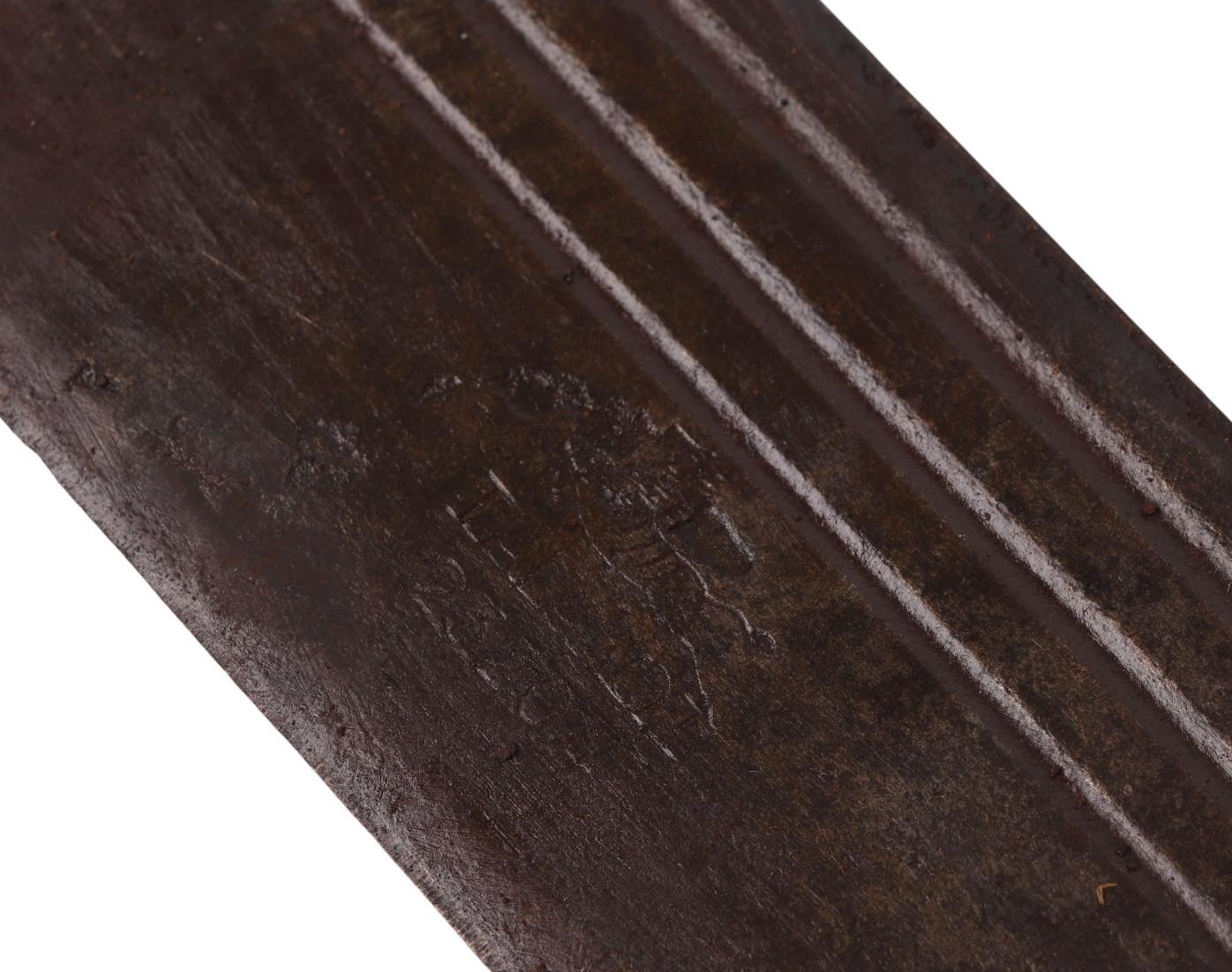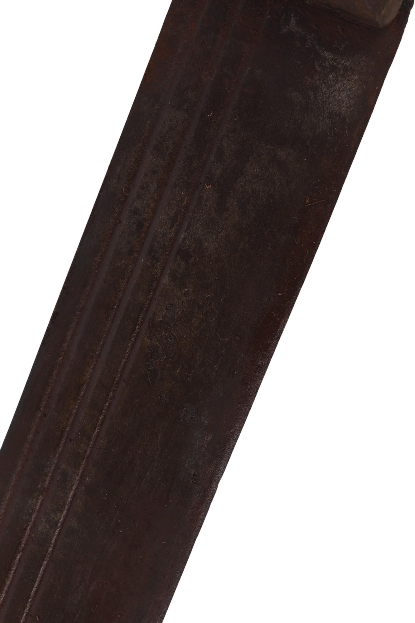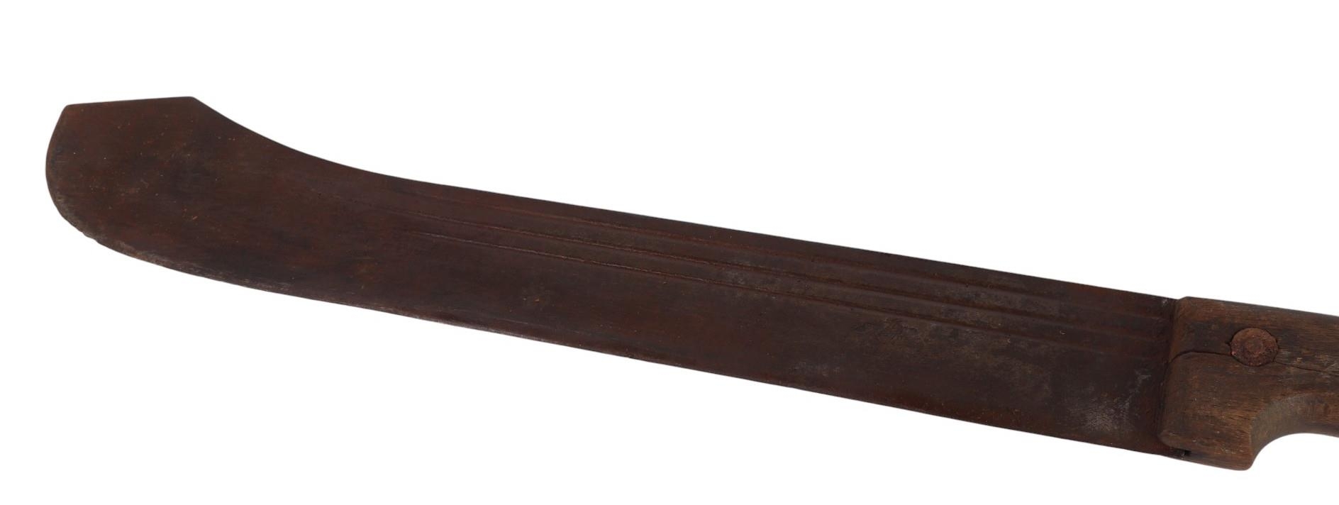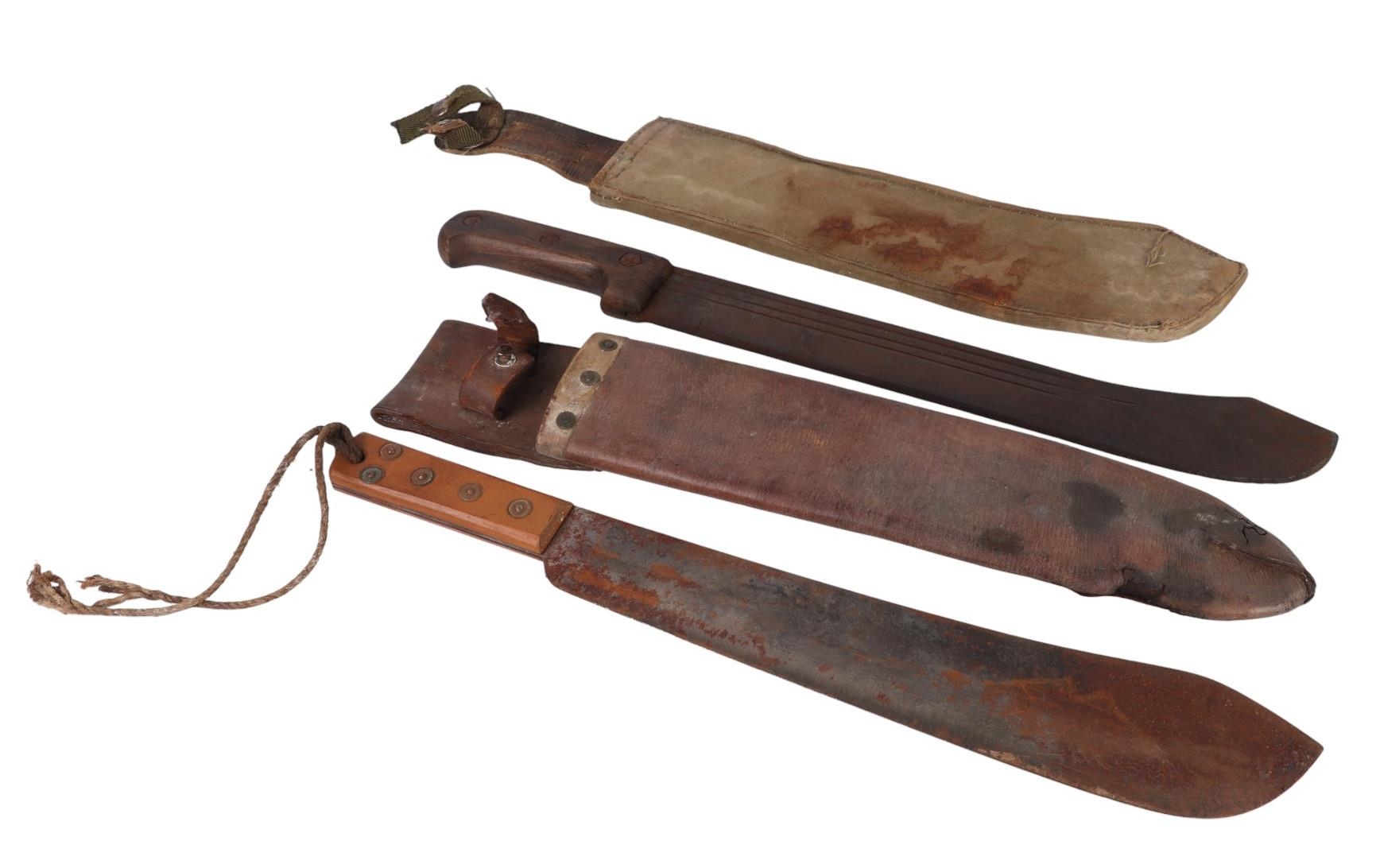 A French West Africa colonial army Panga Machette in its canvas scabbard. Having a 40cms Talbot Brand blade, together with a British Army machete with composite grips which are marked with the War Department Arrow above “11”, the blade is marked: ENDURE JOSHs BEAL & SONS CAST STEEL SHEFFIELD, in its leather scabbard which is impressed with the WD Arrow F.LTD. 1939. Blade length 37.5cms. (2)