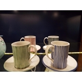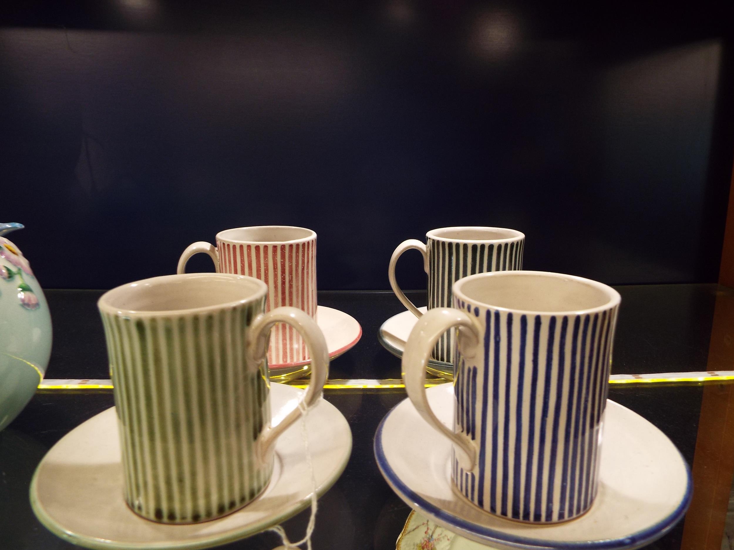 A set of four Rye pottery candy stripe coffee cans and saucers