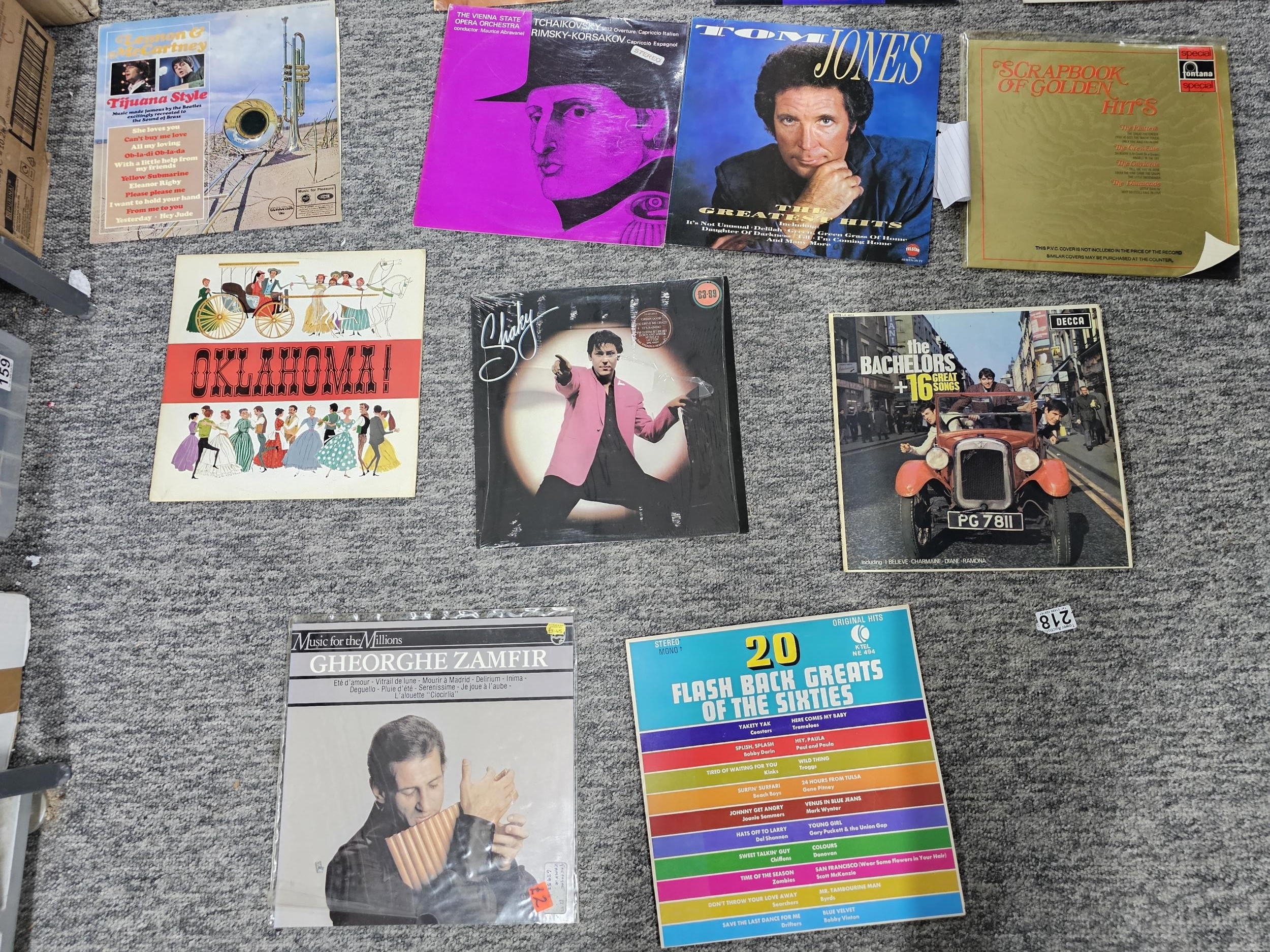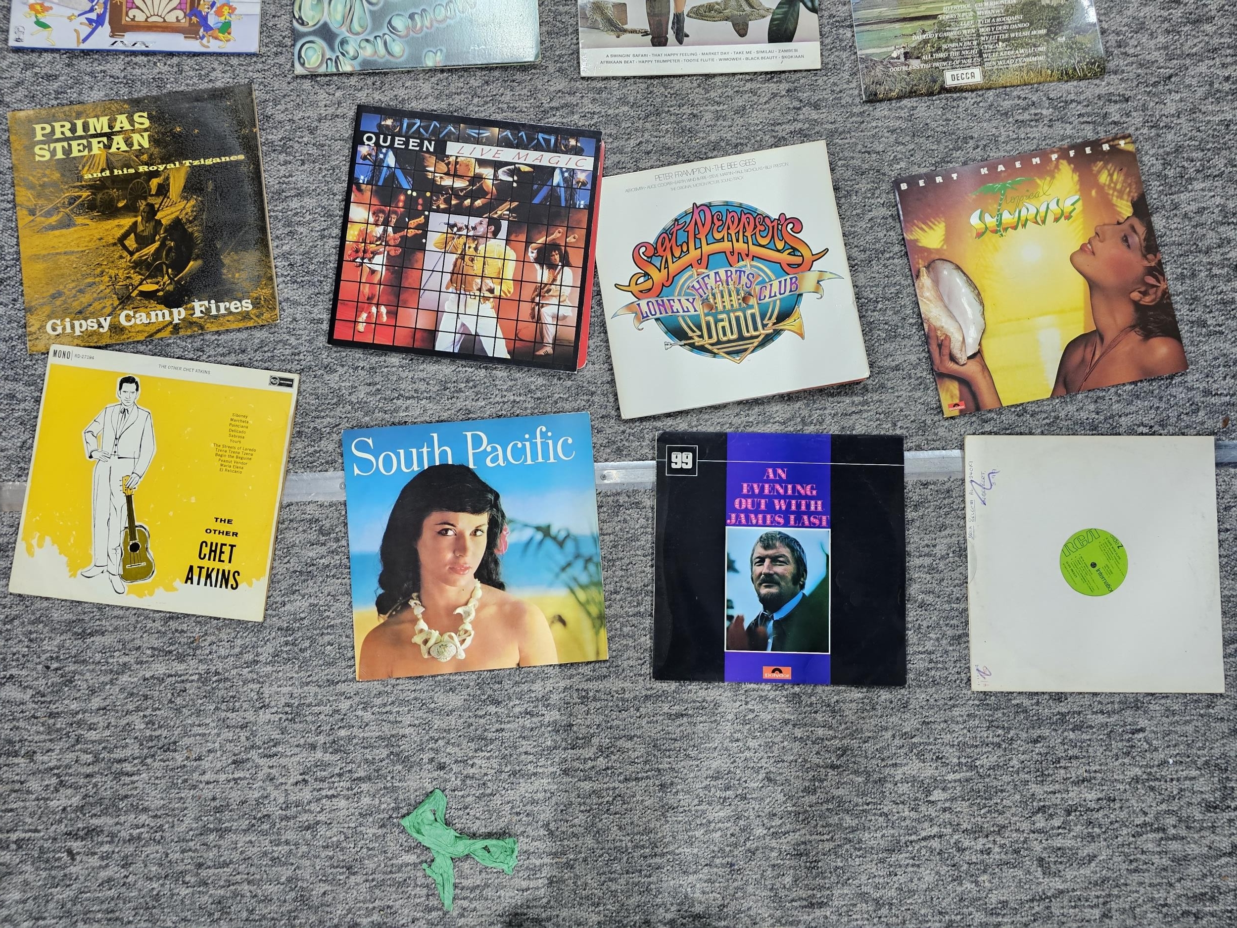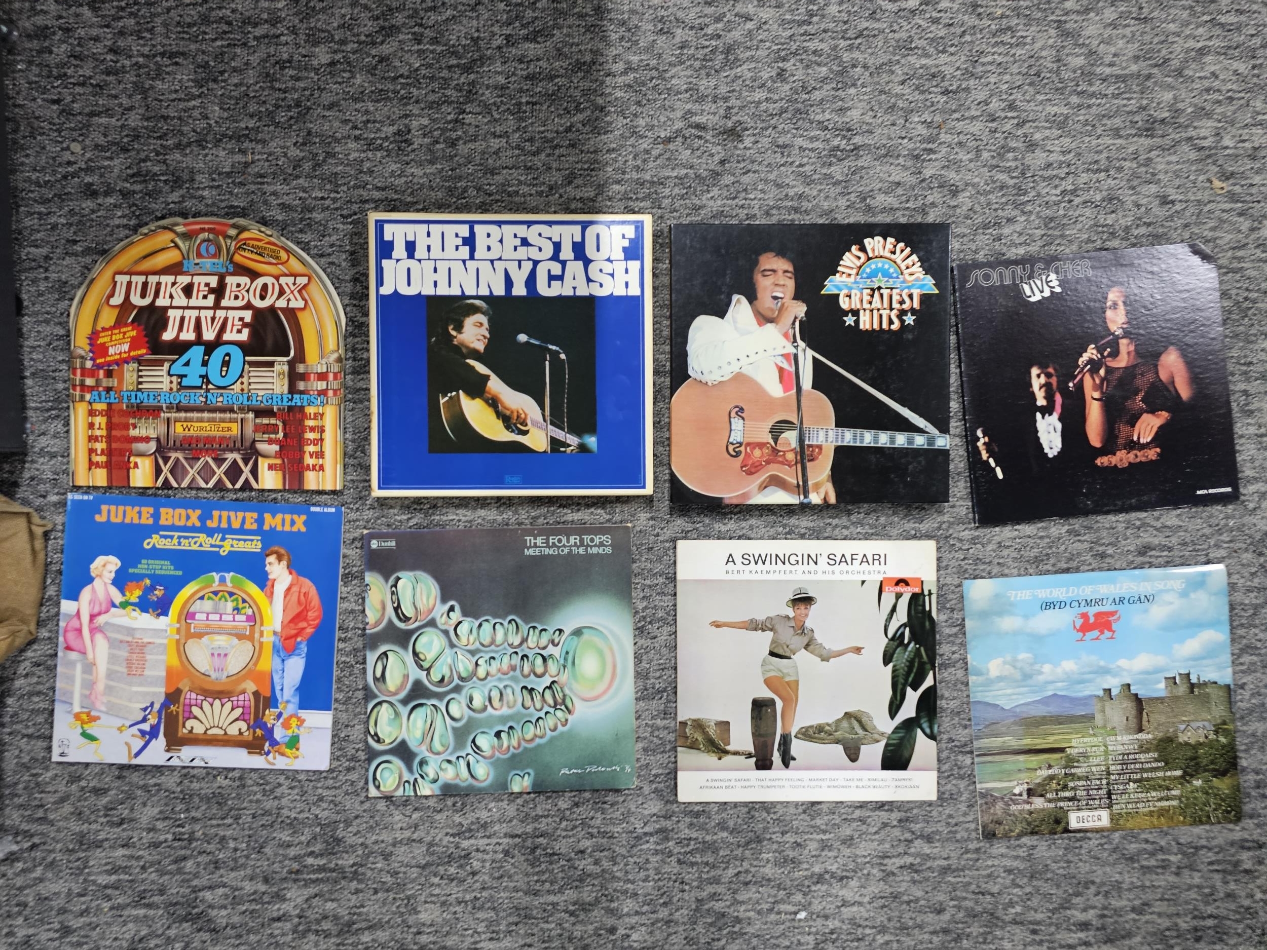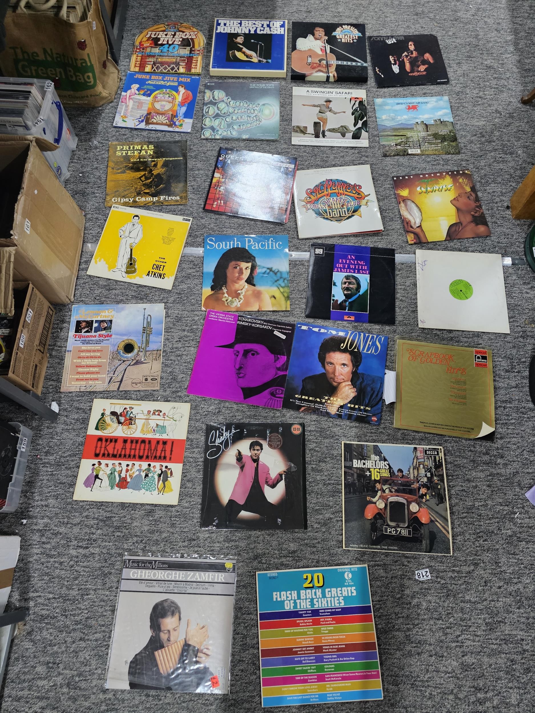 A selection of LP vinyl records to include albums by Tom Jones, Shakin Stevens, Queen, Chet Atkins, etc, along with 2 box sets by Johnny Cash and Elvis Presley. Please see photos for what is fully included.