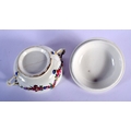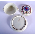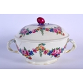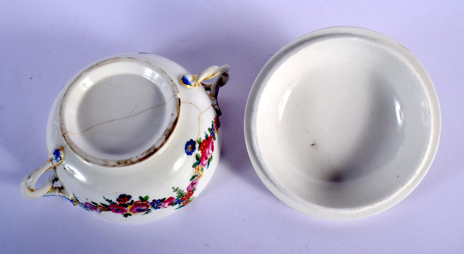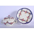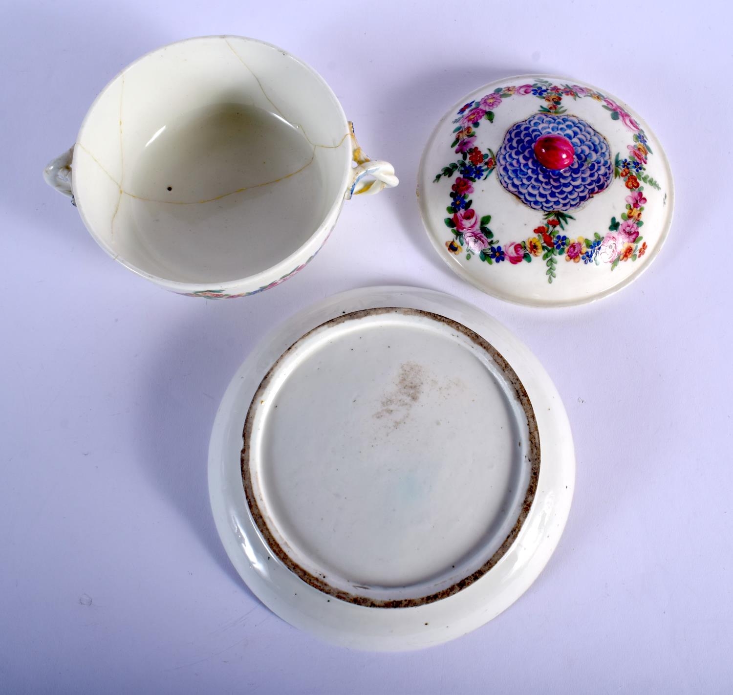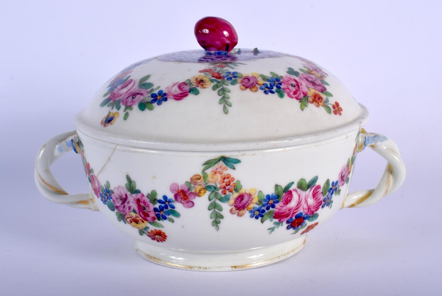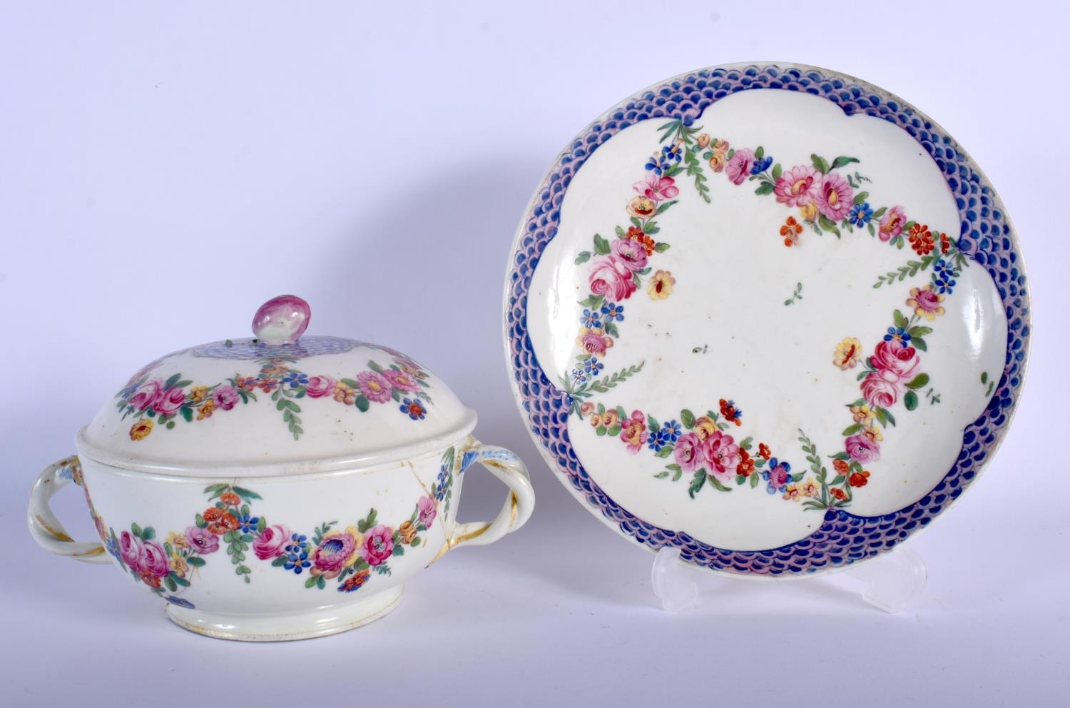 18TH C. ECUELLE COVER AND STAND PAINTED WITH SWAGS OF FLOWERS AND LILAC SCALE IN THE STYLE OF EARLY SEVRES, UNMARKED. Saucer 18cm diameter, Ecuelle 10.5cm high (2)