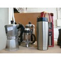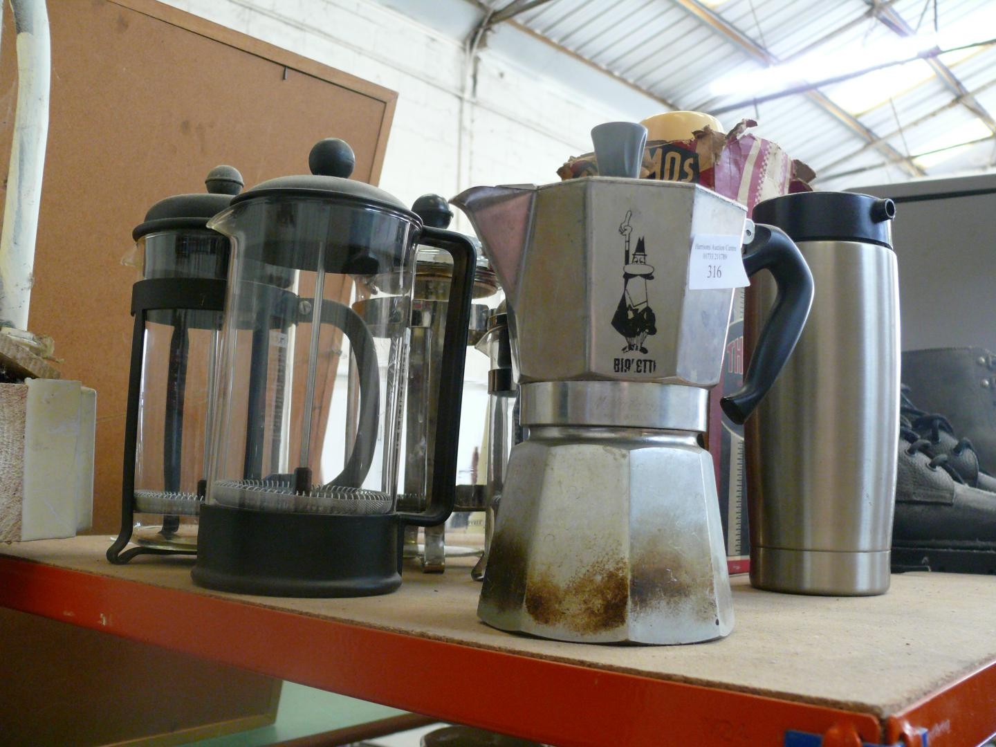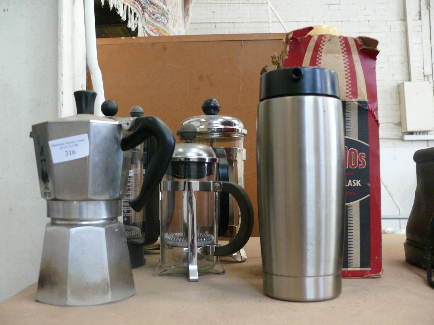 Collection of cafetieres and coffee pots plus a Thermos flask