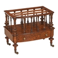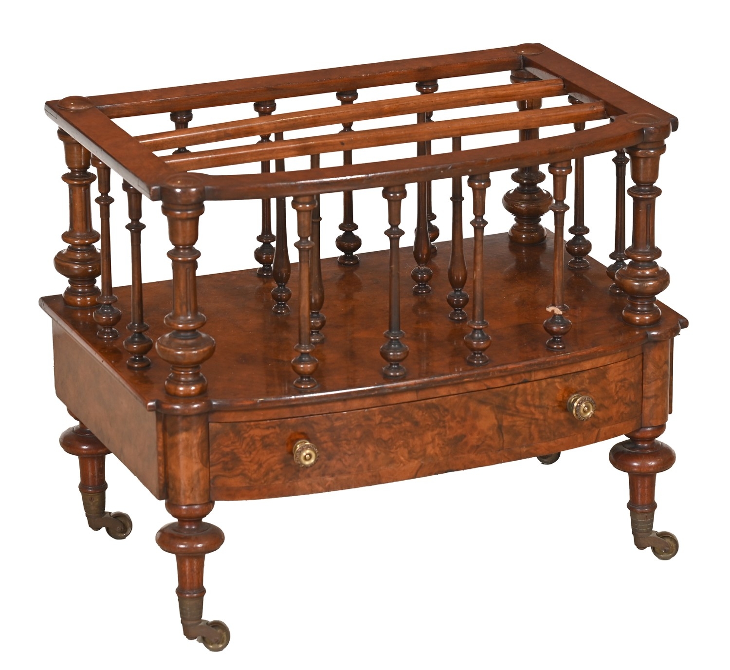 A Victorian walnut canterbury, bow fronted, on brass castors, 50cm h; 38 x 58cm