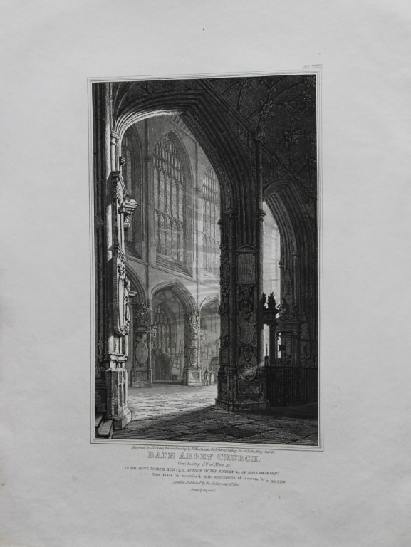 F Mackenzie - The Abbey Church, Bath engraved by J Le Keux 1825. Original engraving of the South West view of the nave in Bath Abbey Church by J Le Keux from a drawing by G Shepherd after a sketch by F Mackenzie. Published by John Britton, London 1825.