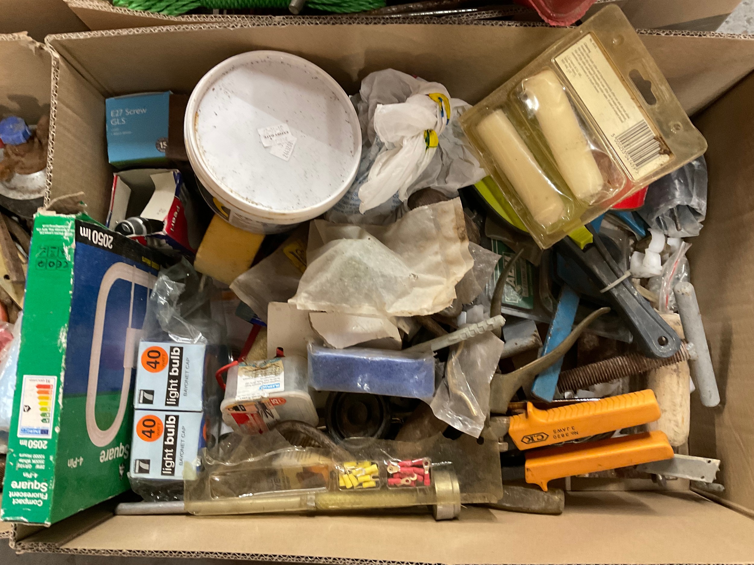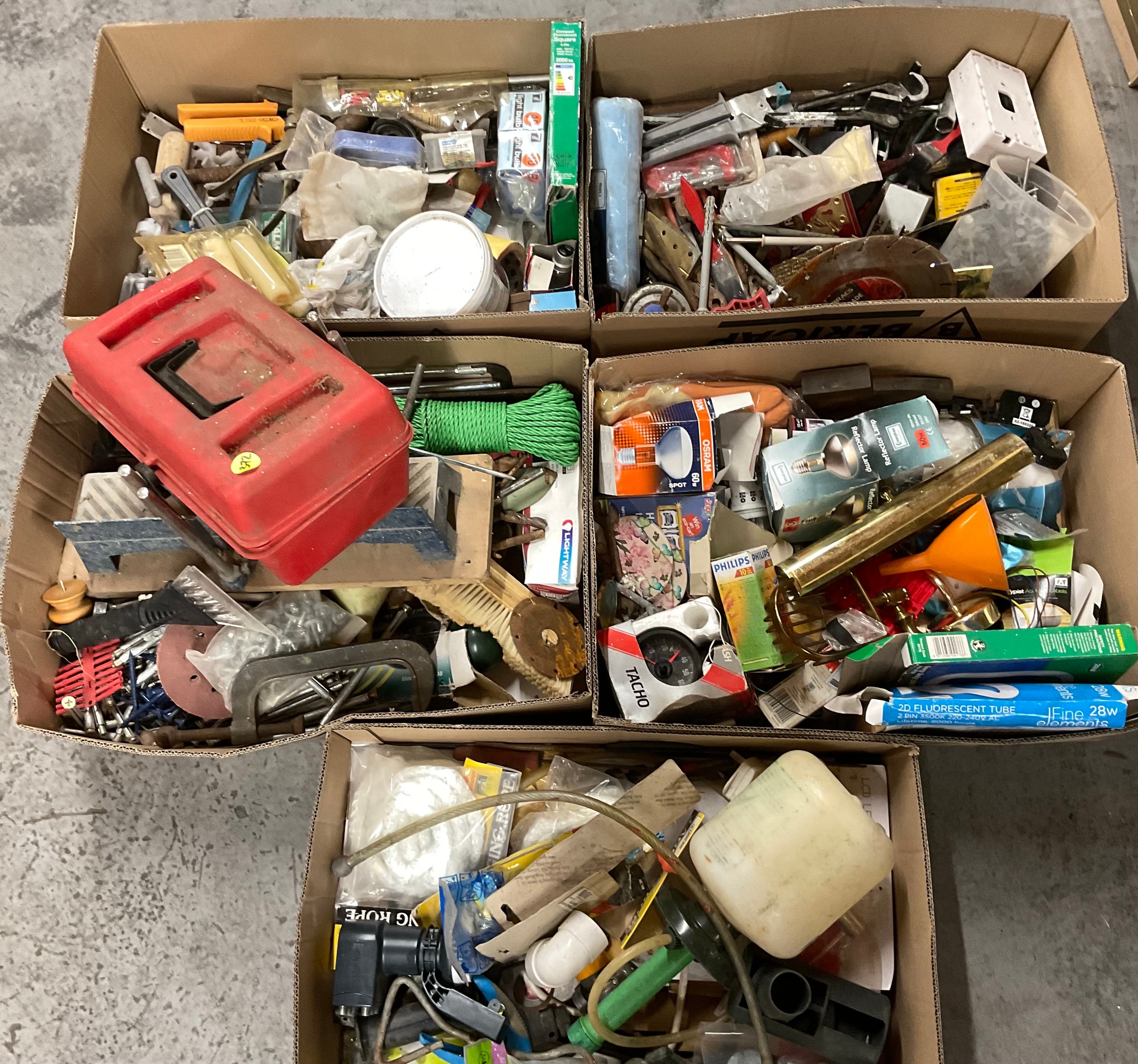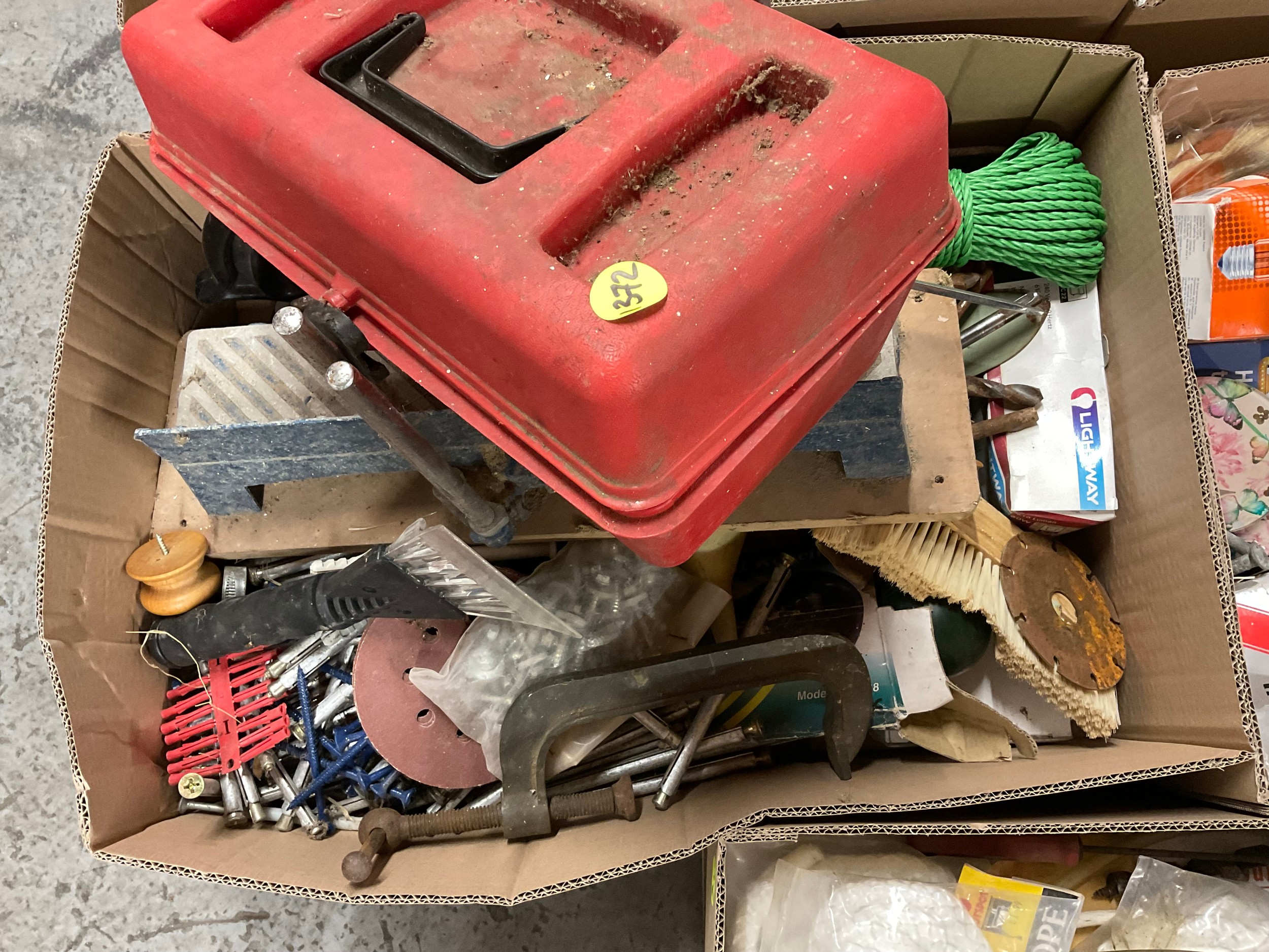 5 BOXES OF WORKSHOP GARAGE TOOLS AND HARDWARE TO INLCLUDE MITRE SAW, HAND TOOLS , CLAMPS ETC