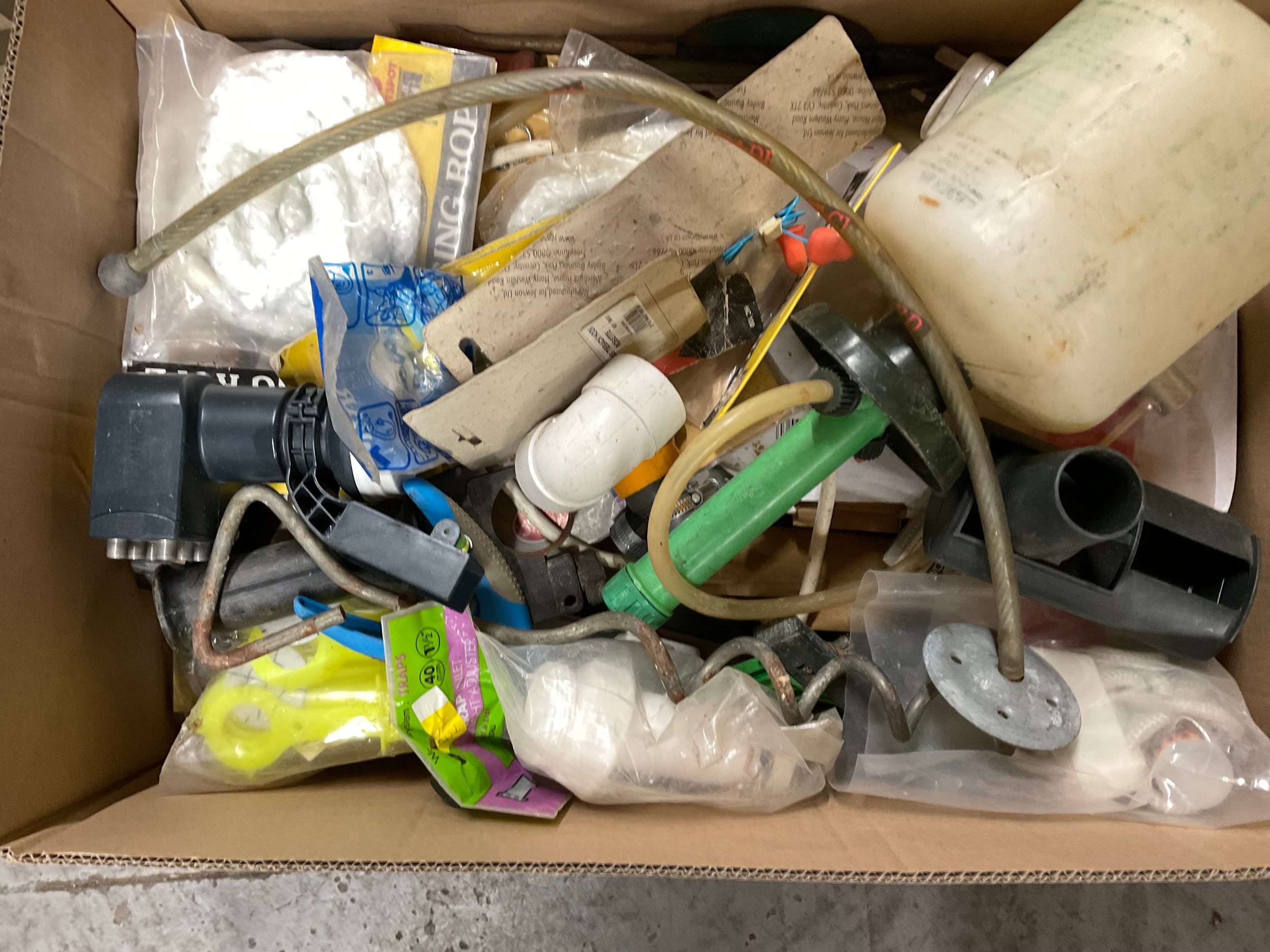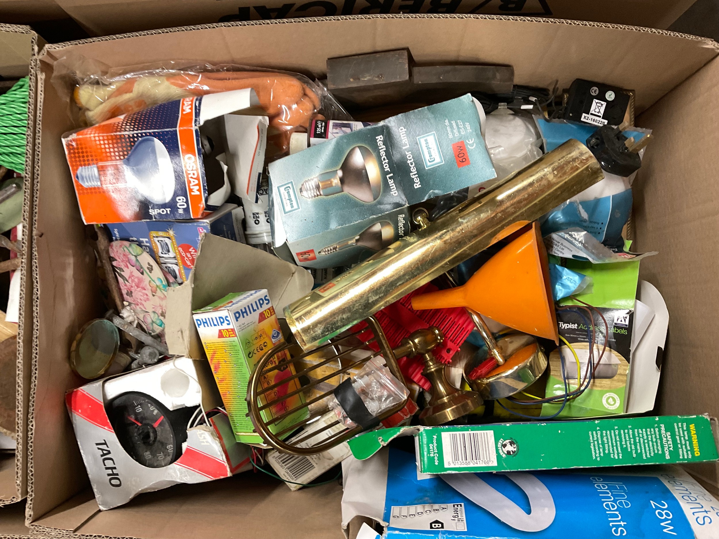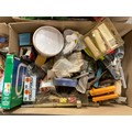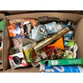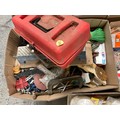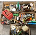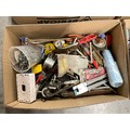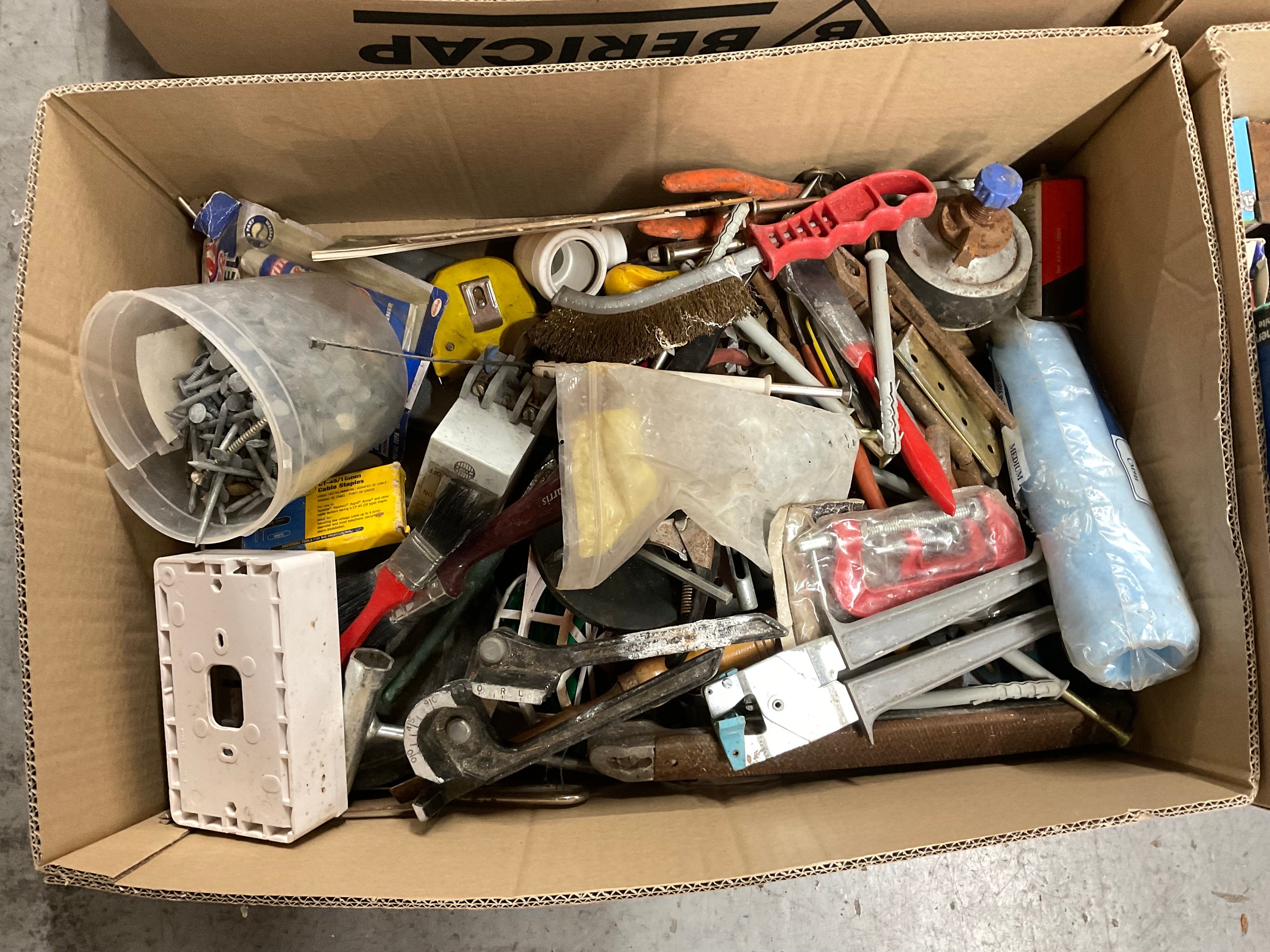 5 BOXES OF WORKSHOP GARAGE TOOLS AND HARDWARE TO INLCLUDE MITRE SAW, HAND TOOLS , CLAMPS ETC