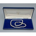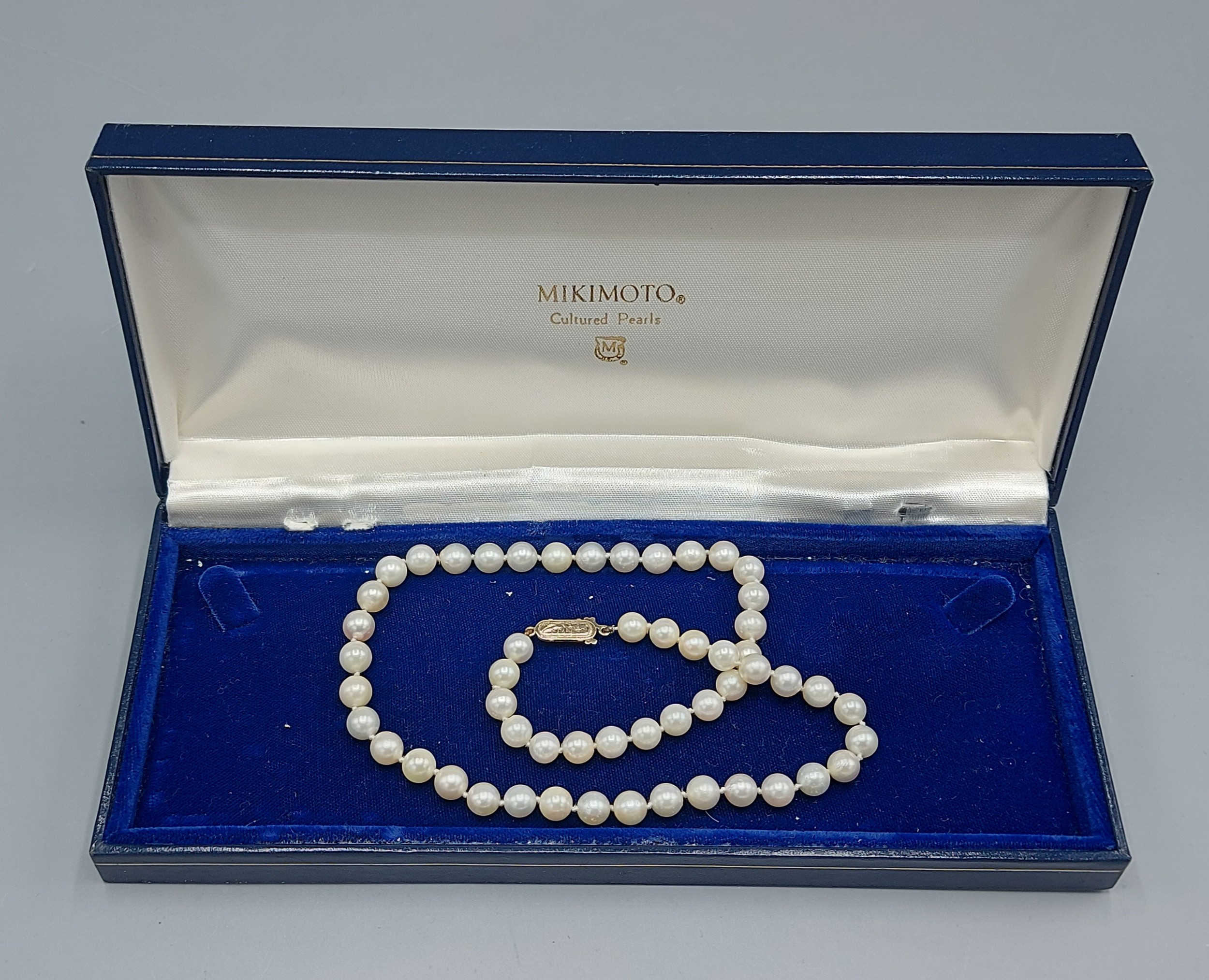 A single row cultured Pearl necklace by Mikimoto with 9ct gold clasp, 40cms long