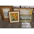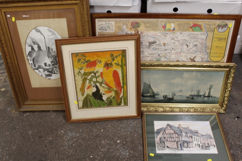 A FRAMED & GLAZED VINTAGE PRINT ENTITLED A DOG NOVEL TOGETHER WITH A COLLECTION OF FIVE PRINTS TO INCLUDE THE POTTERY'S ETC