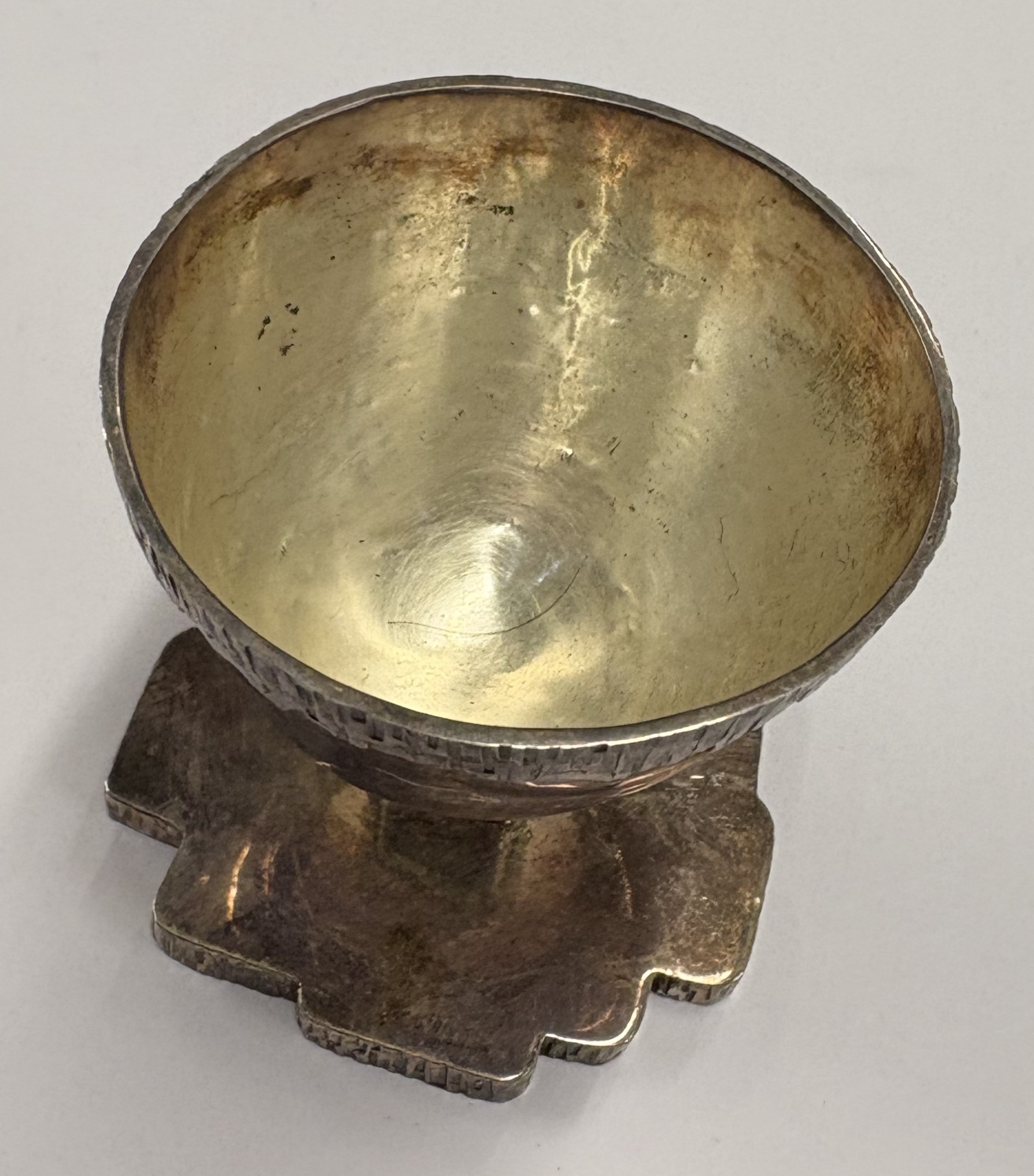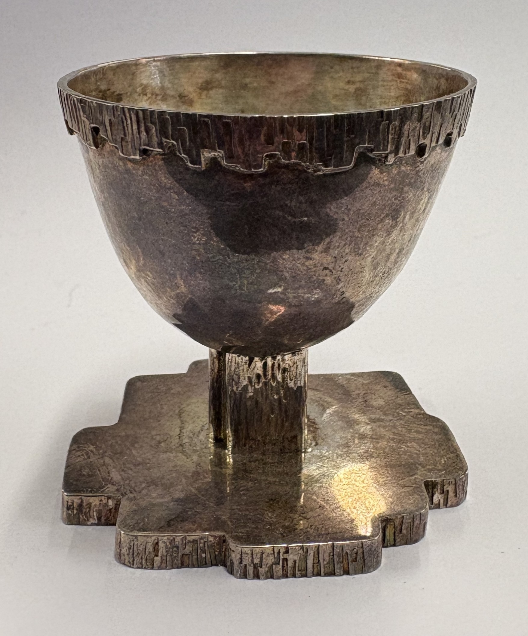 An unusual modernistic silver egg cup with bark decoration. London 1972. By VT. Approx. 58 grams. Est. £100 - £150.