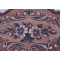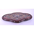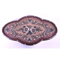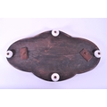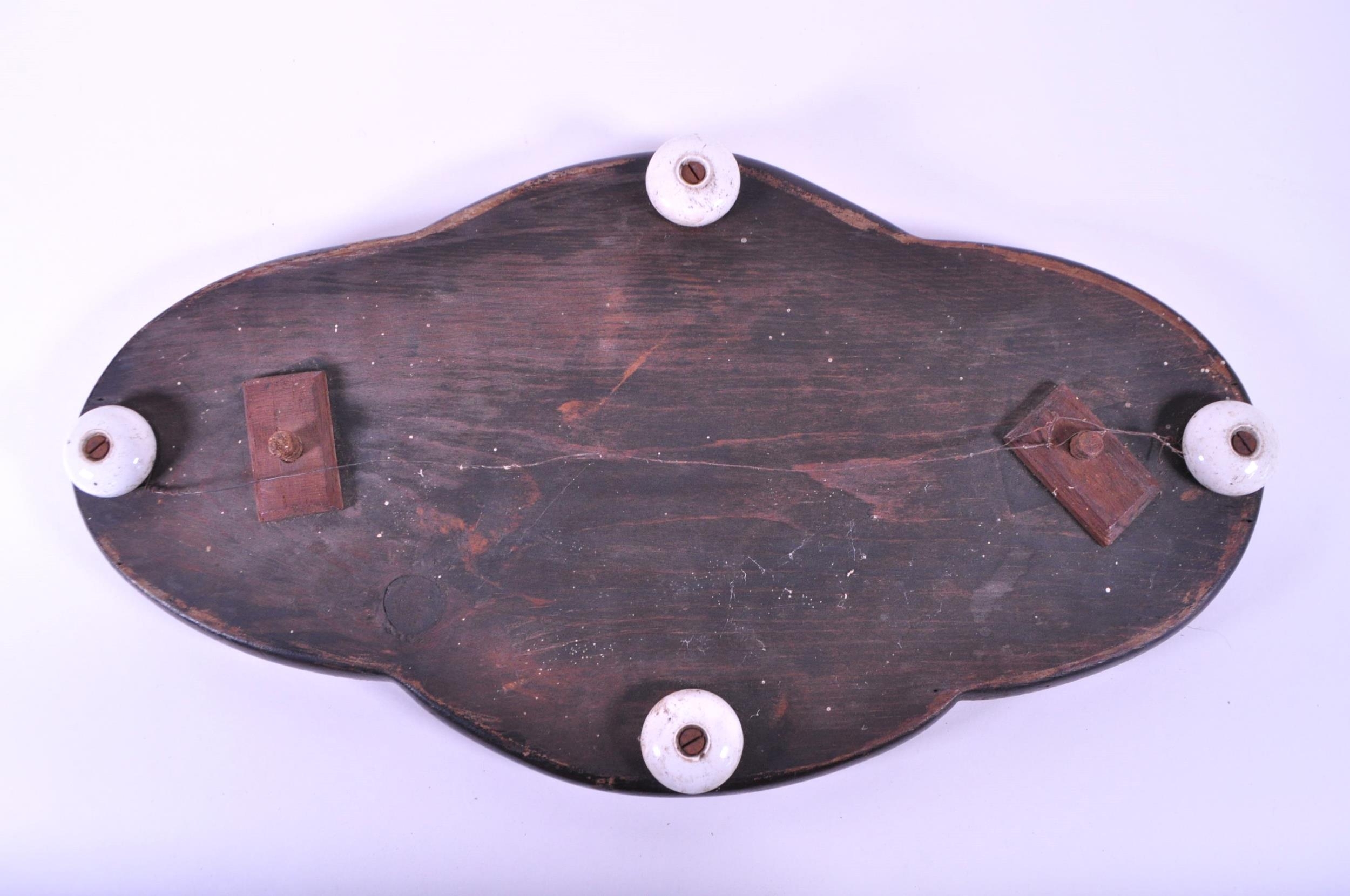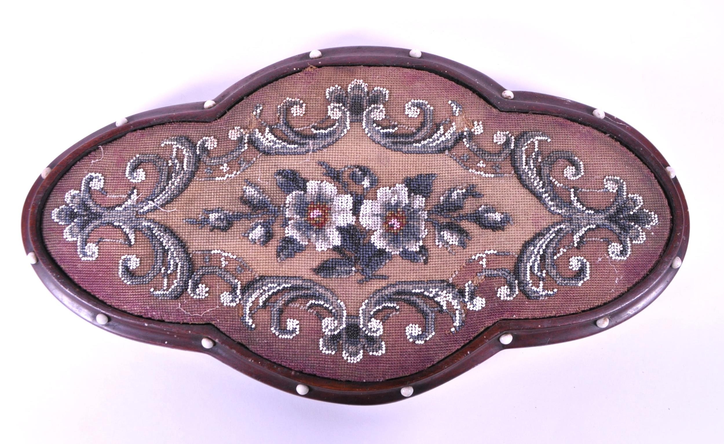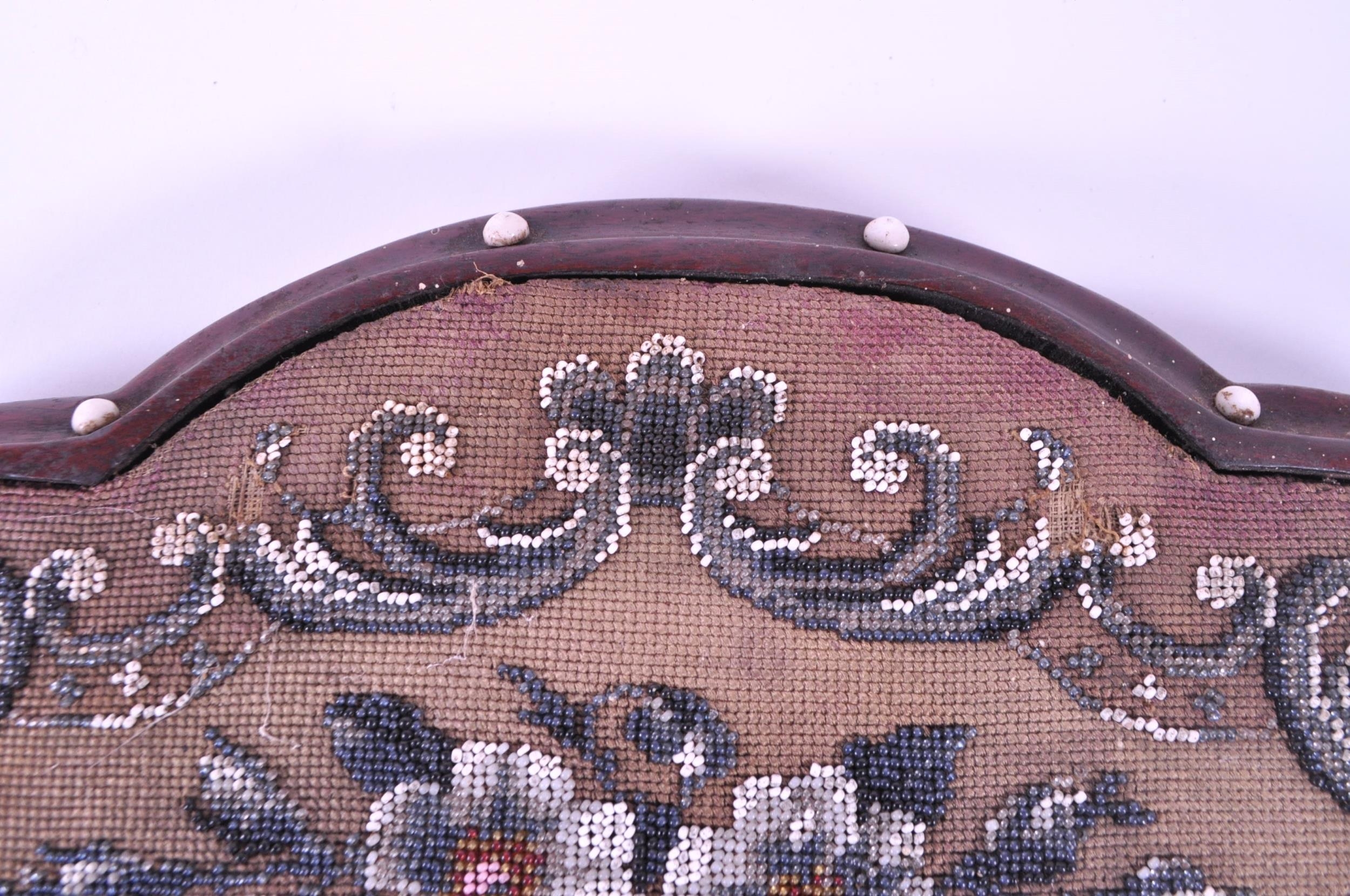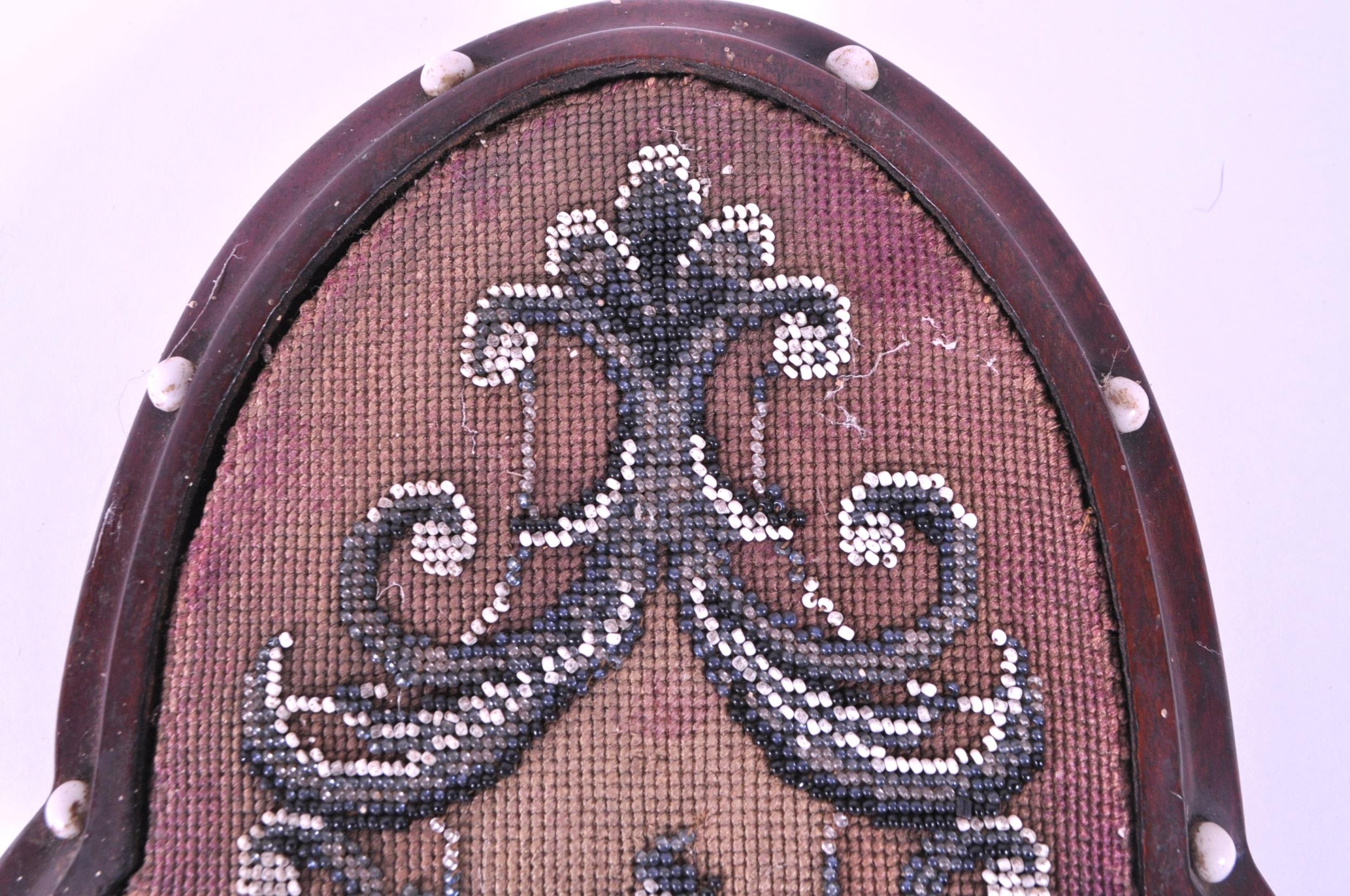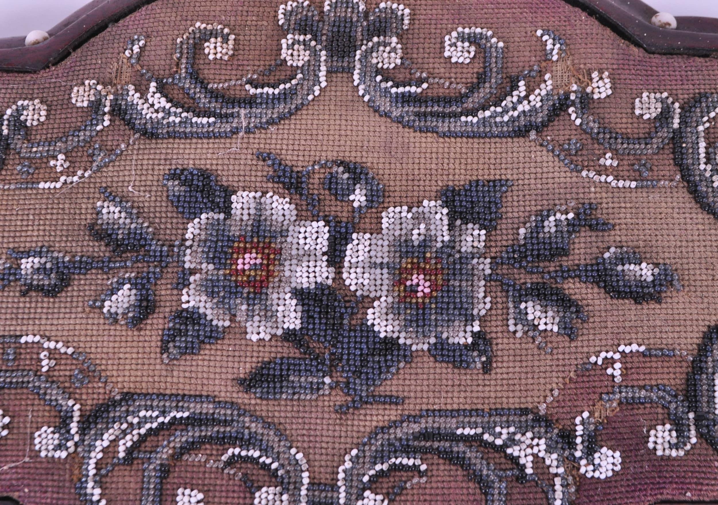 Victorian 19th century mahogany framed beadwork wall hanging / table top piece with four ceramic bun feet. Beadwork in a green and brown colourway depicting floral motifs. Measuring approx. 49cm x 27cm x 5cm.
