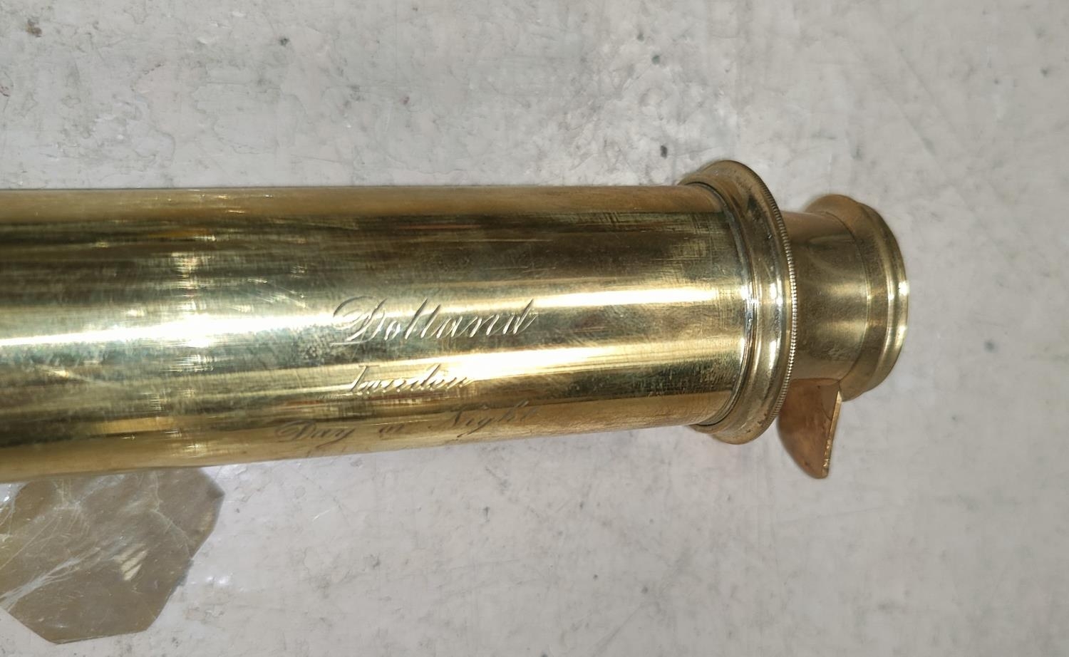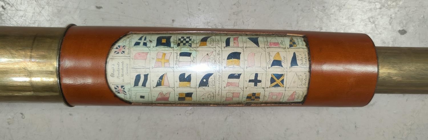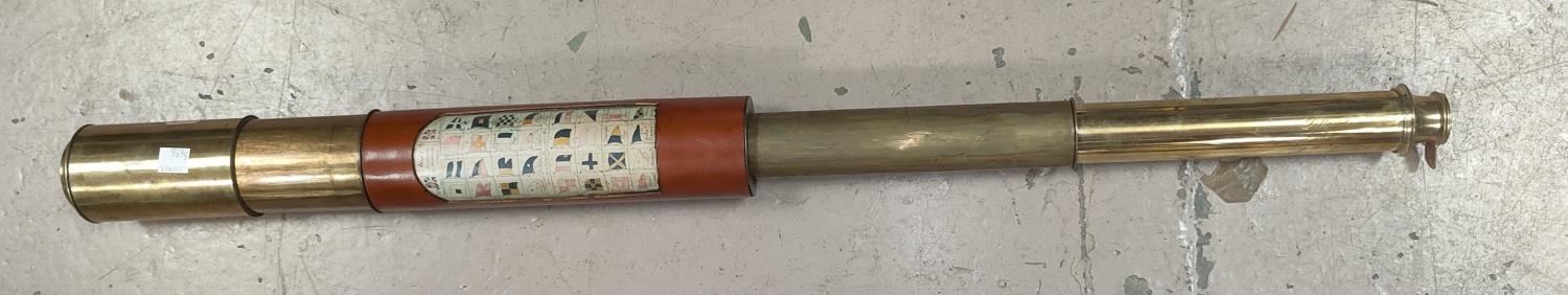 A brass & leather three section telescope by Dolland London, inset with "Flags & Pendants in Merchant Service" unextended length 38cm.