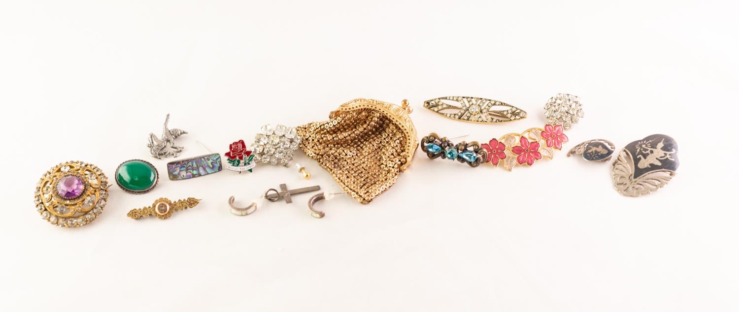 SMALL, LADY'S GILT METAL PURSE, a selection of Siamese Sterling silver and other COSTUME BROOCHES, etc
