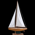 A wood-hulled model pond yacht with sails, on wood stand, overall height 139cm