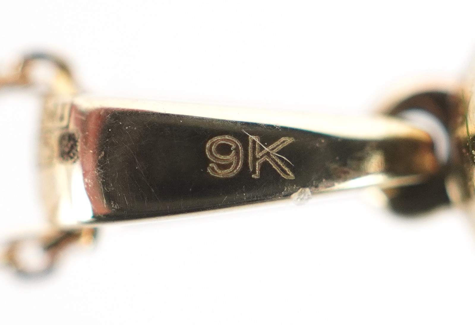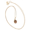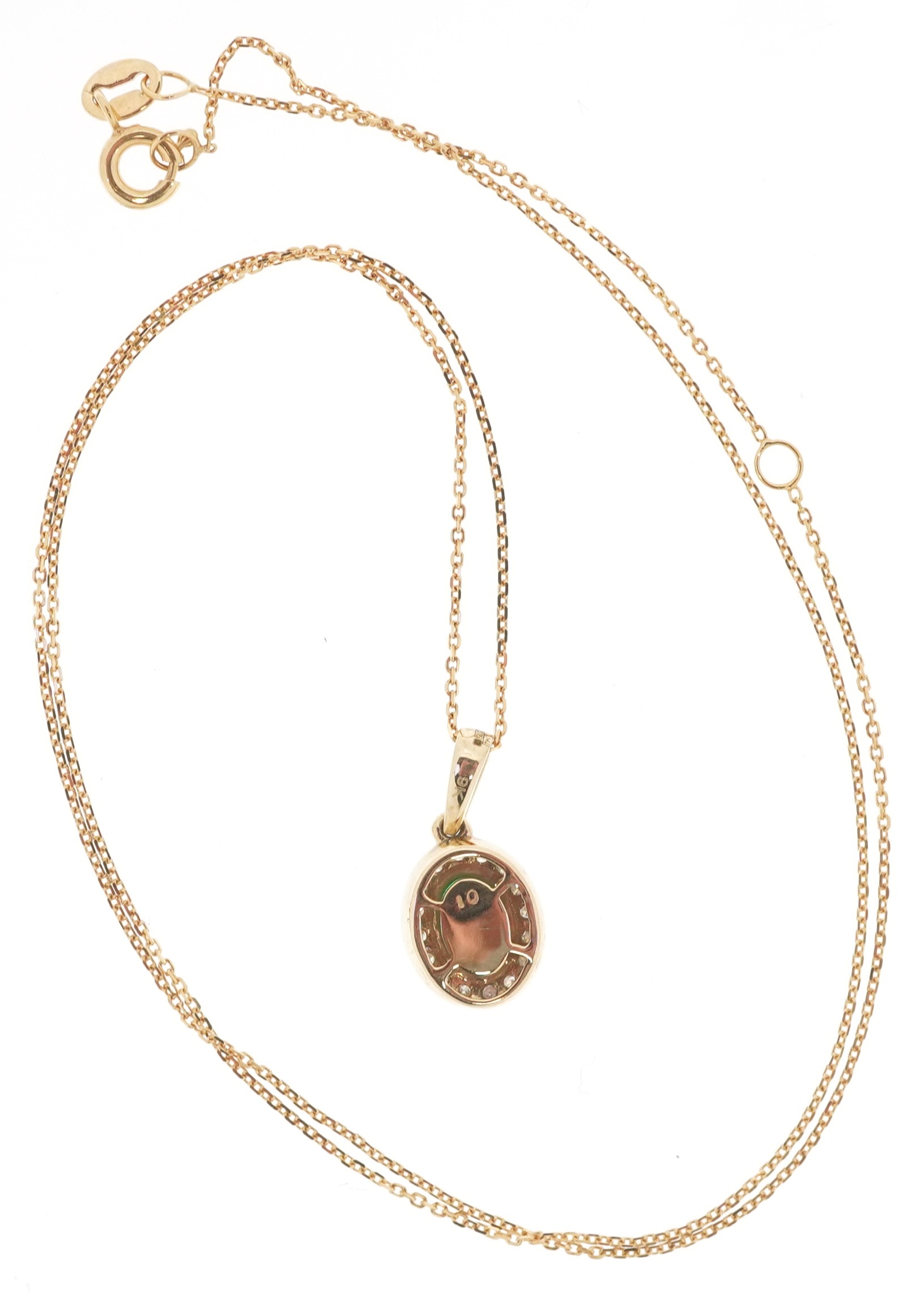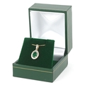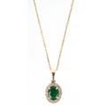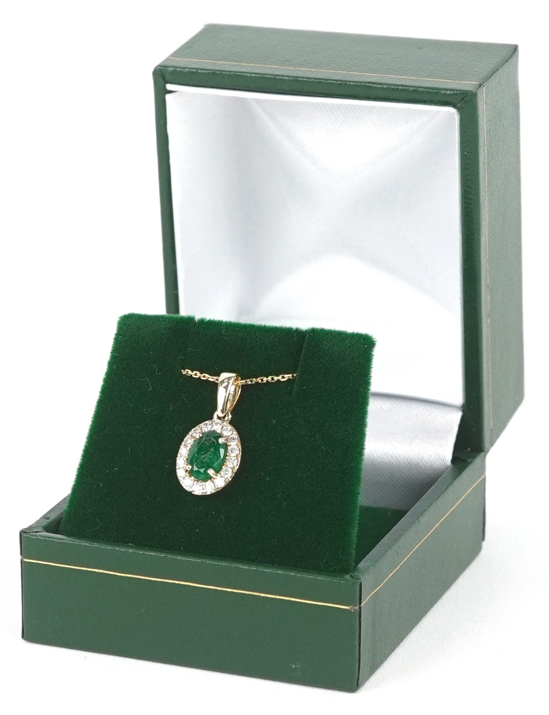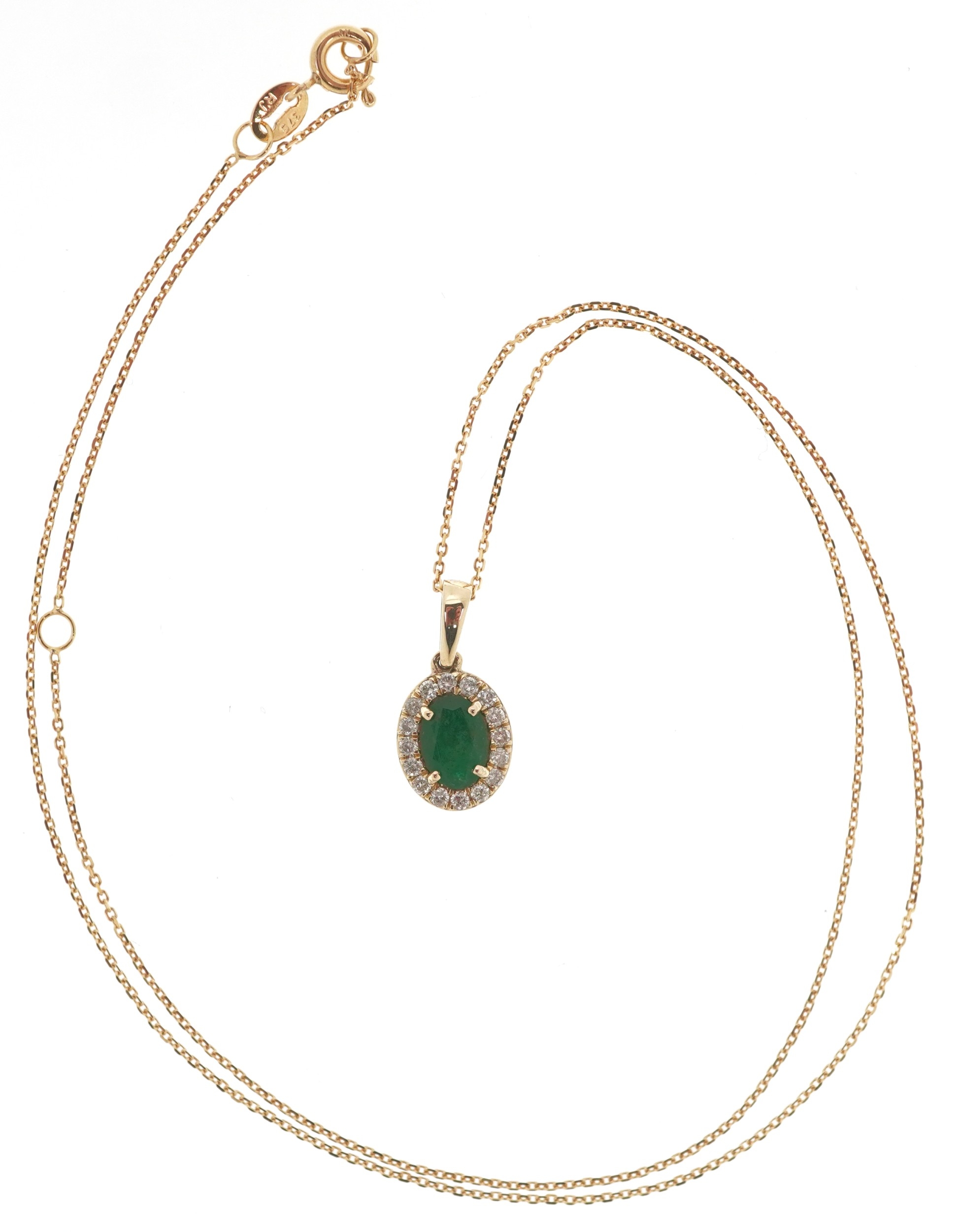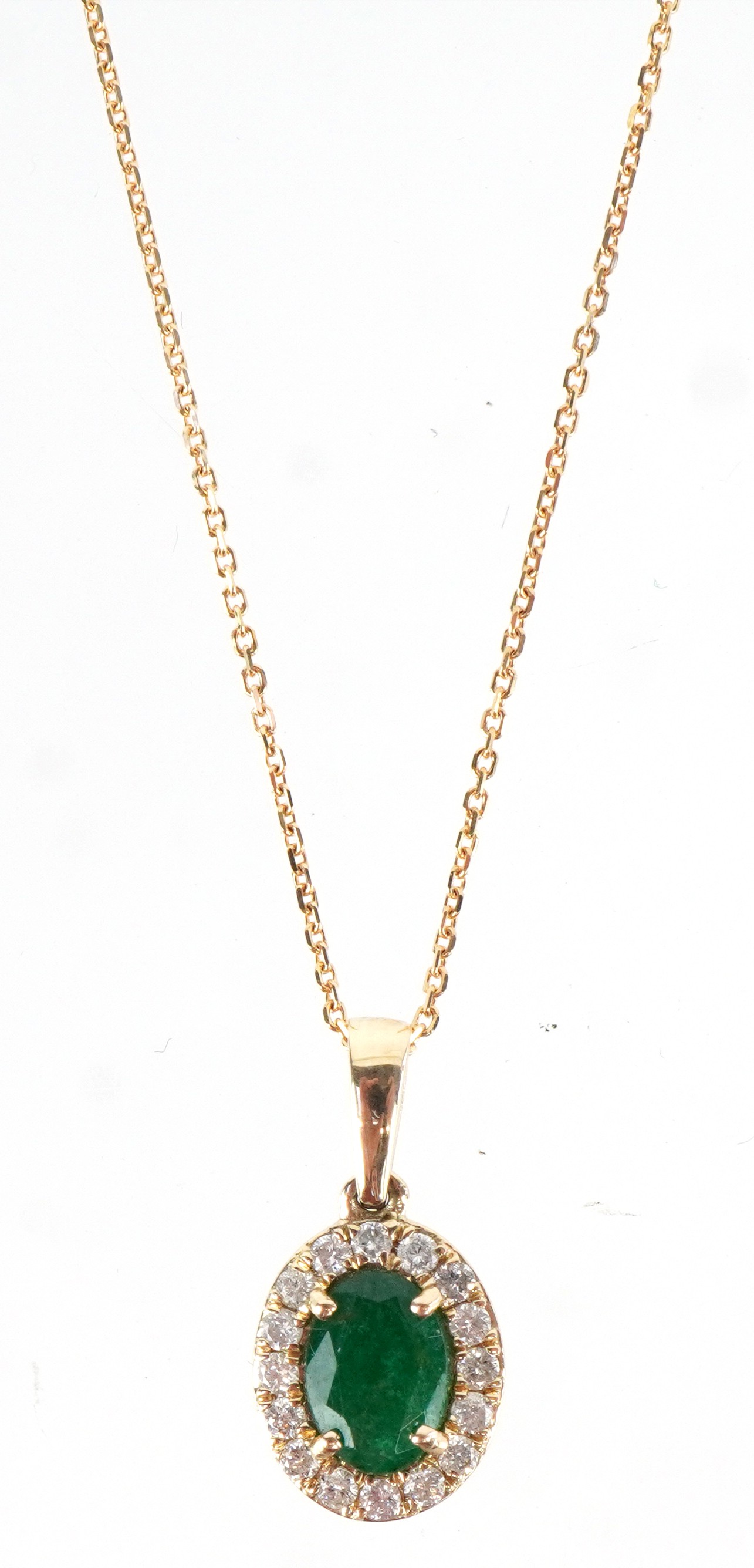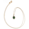 A 9K gold emerald and diamond cluster pendant on a 9K gold necklace, total diamond weight 0.19 carat, the emerald 0.76 carat, 1.6cm high and 44cm in length, total 2.1g.