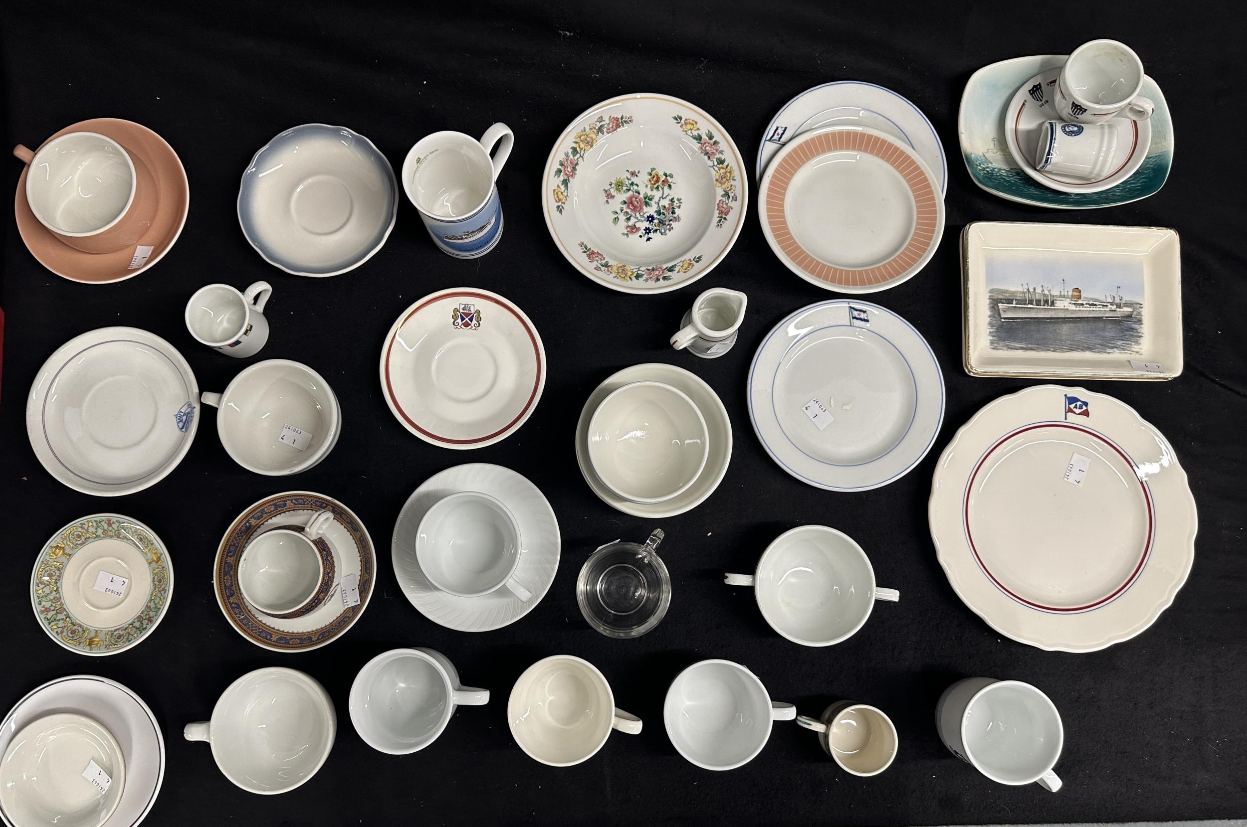 OCEAN LINER: Collection of cups and saucers and associated items including 1930s United States lines, American Mail Line, etc.
