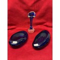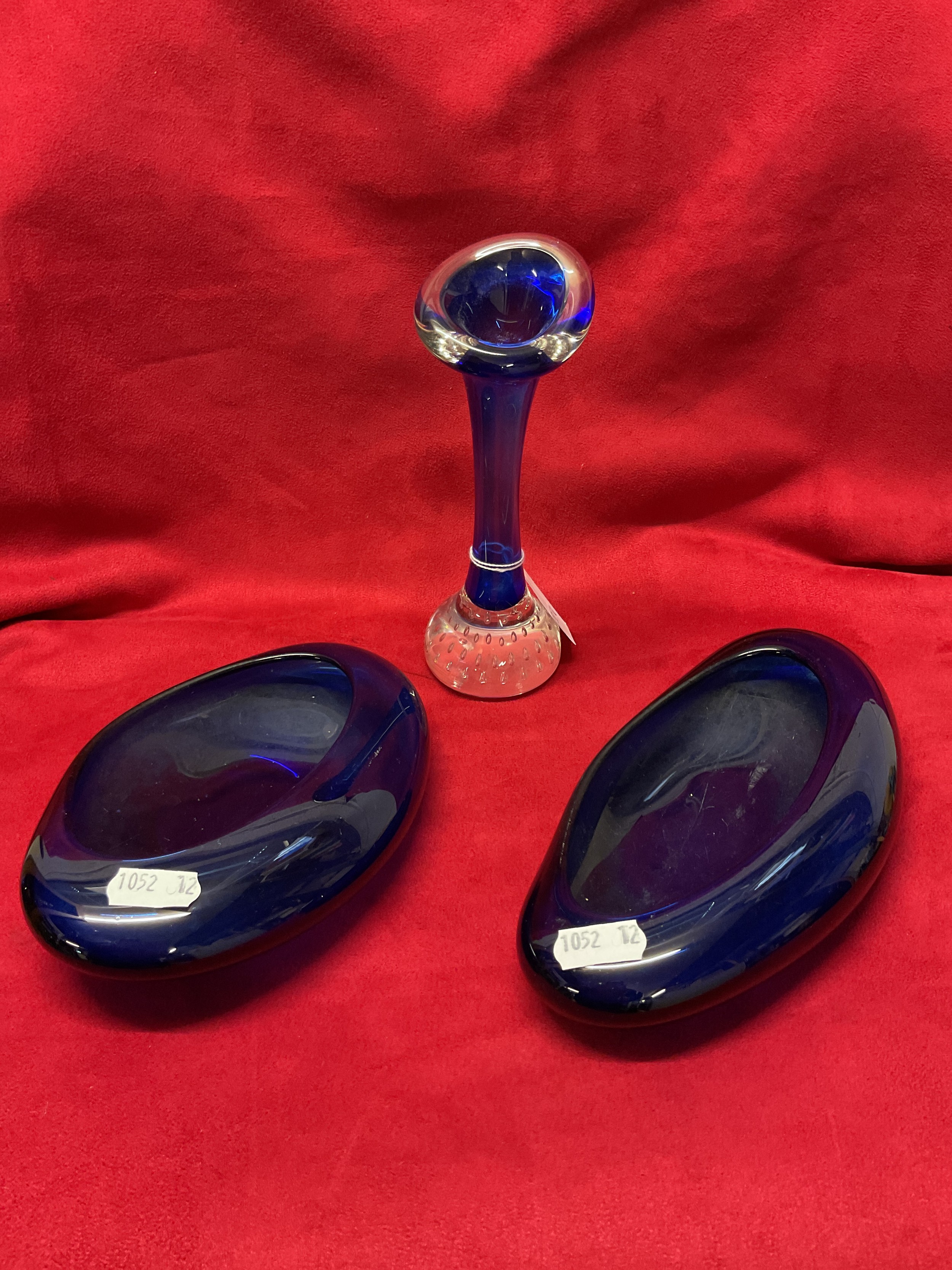 Two vintage blue glass dishes and a blue glass bud vase with bubble inclusions