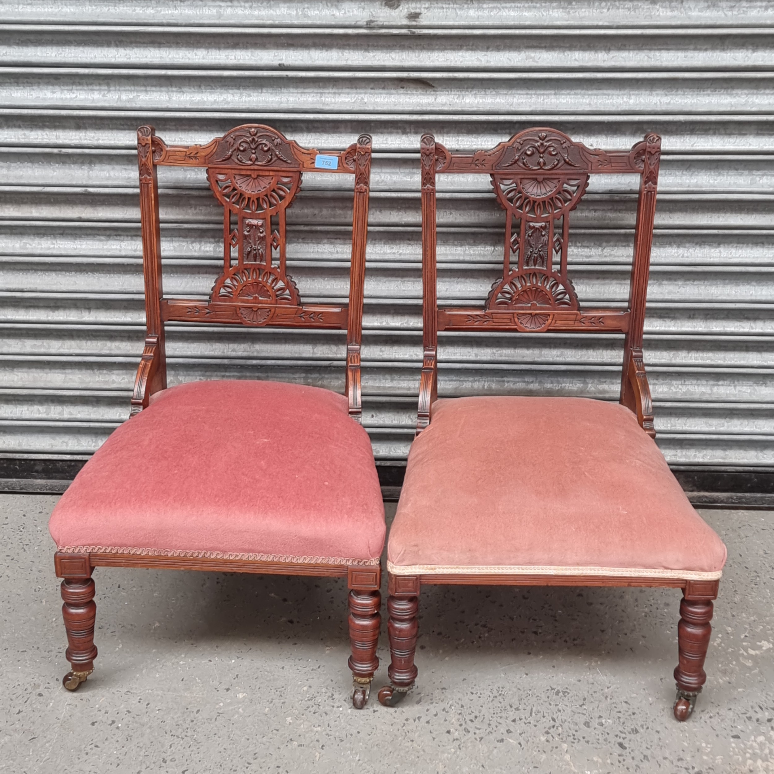 A pair of upholstered Edwardian nursing chairs on casters.