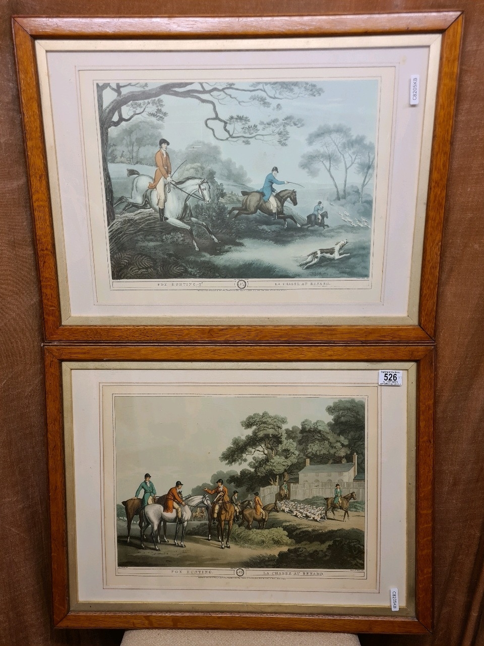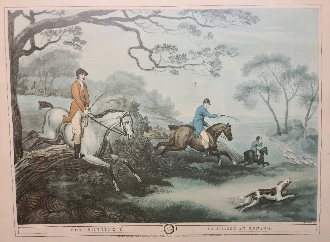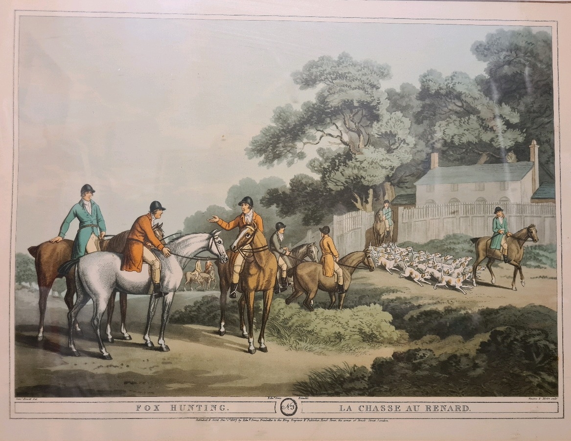 Pair of wooden framed Fox Hunting prints by Samuel Howitt. Frames measure 49.5cm x 65.5cm