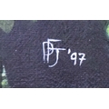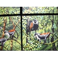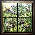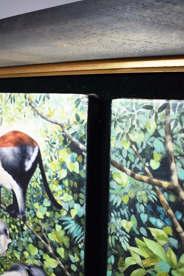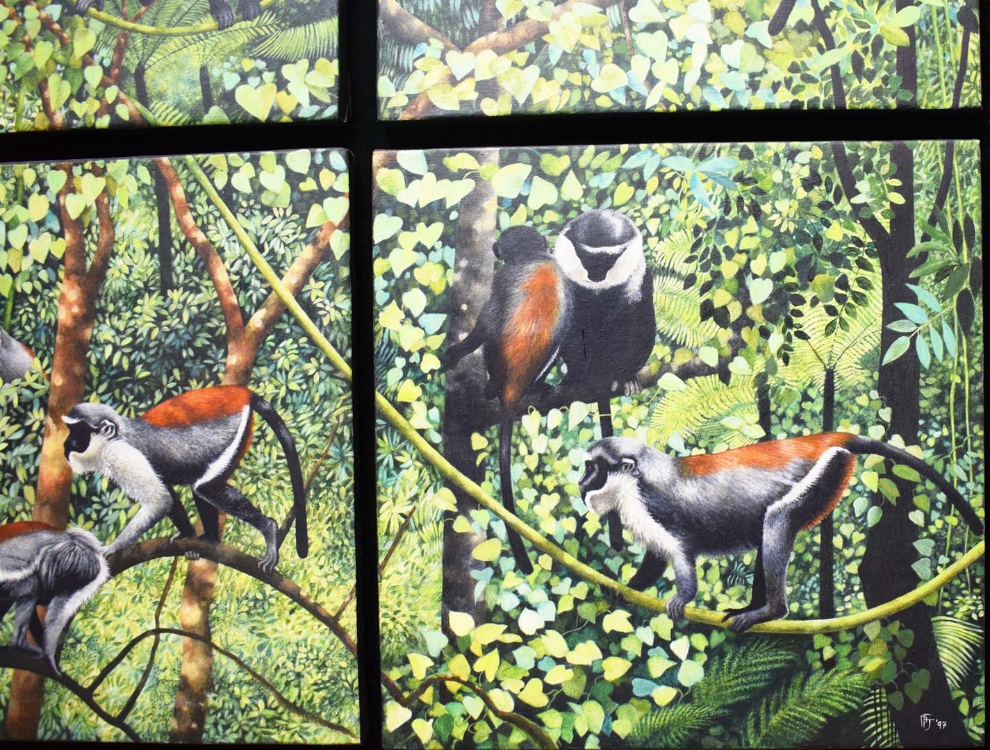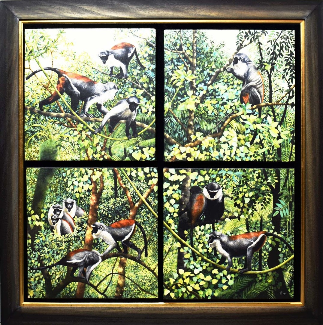PENELOPE FULLJAMES (BRITISH, B. 1949). ROLOWAY MONKEYS. (d) oil on canvas, four panels framed as one, signed 'PFJ 97', 95cm x 95cm overall, framed.
