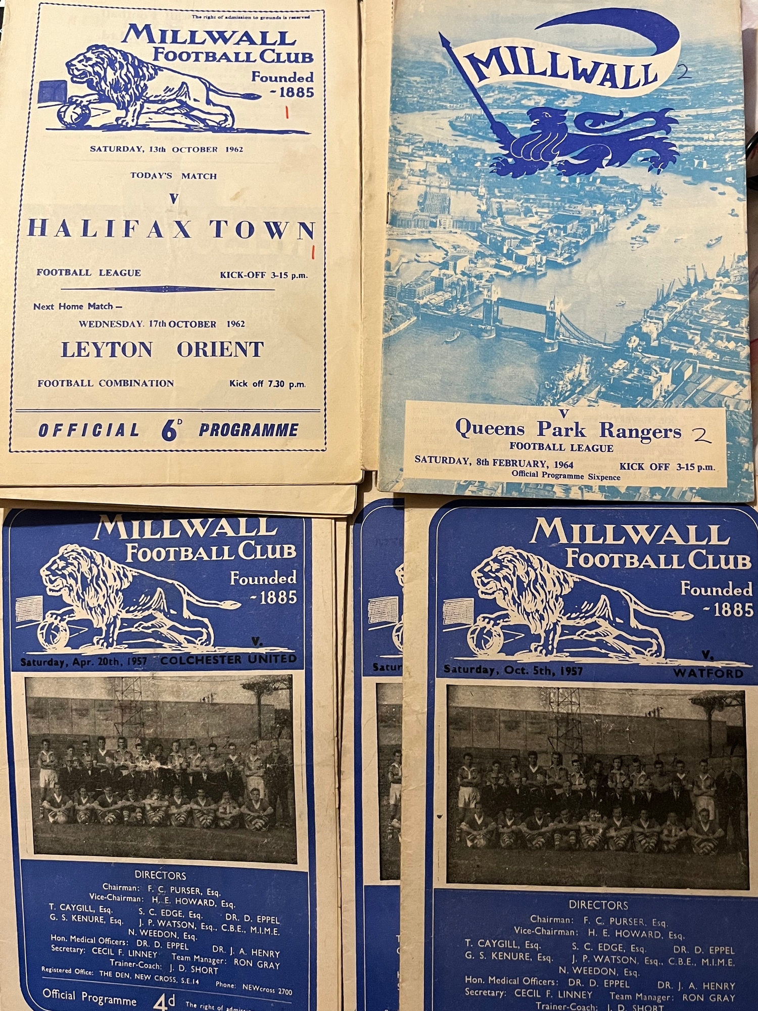 Pack of 10 Millwall, 1956/57 Exeter, Shrewsbury, Colchester, 57/58 Watford and Brentford, 58/59 Aldershot (Gd), 62/63 Northampton, Halifax, Margate, 1963/64 QPR, All apart from Aldershot have writing inside or on cover.