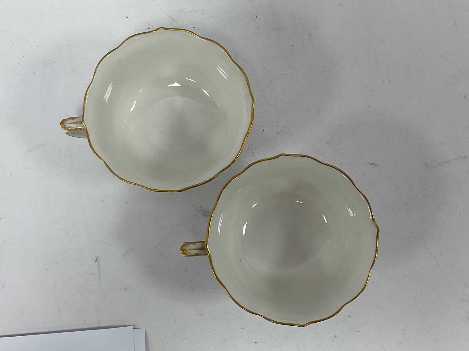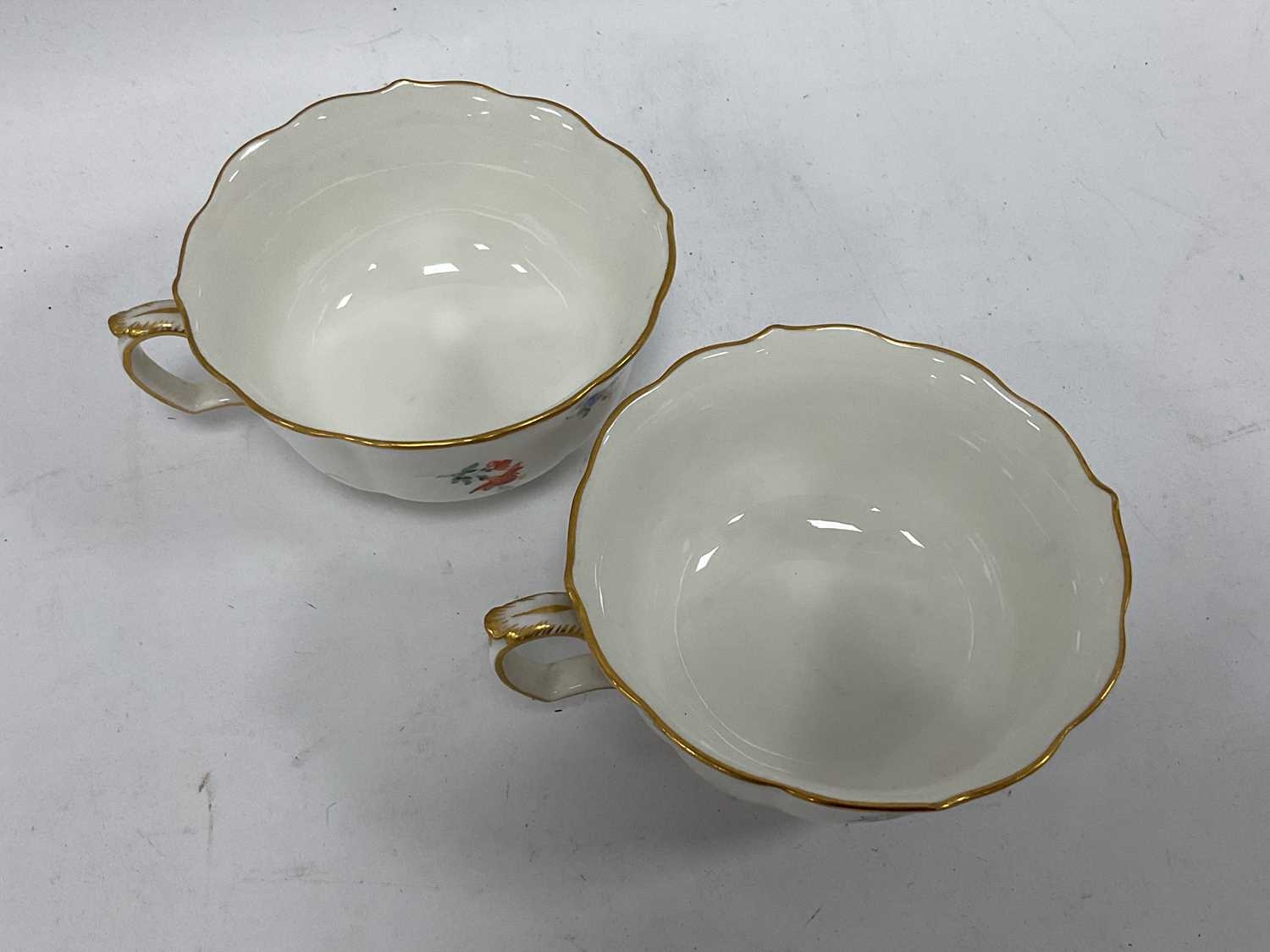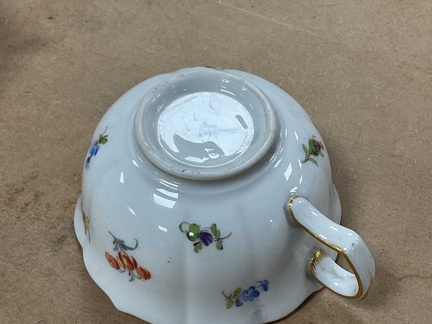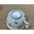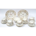 A Meissen Porcelain Tea Service, decorated with floral sprigs, gilt rims, cross swords marks, comprising: two cake plates with pierced borders, sugar bowl, twelve teacups and saucers. (27)
