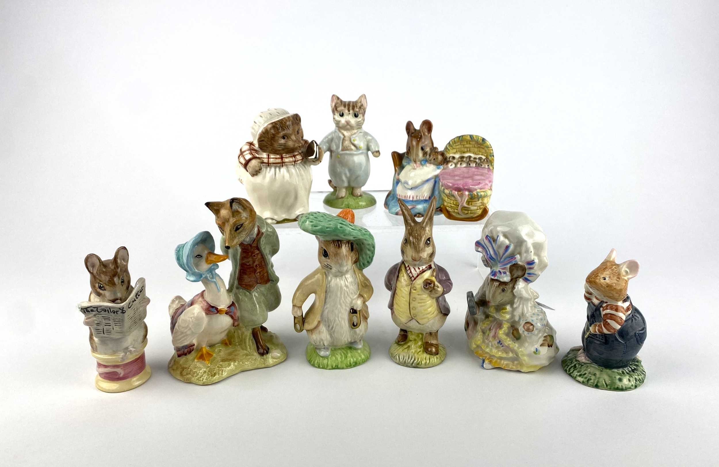 A collection of Beswick, Doulton and Royal Albert Beatrix Potter figures to include Lady Mouse, Hunca Munca and Mrs Tiggy-Winkle