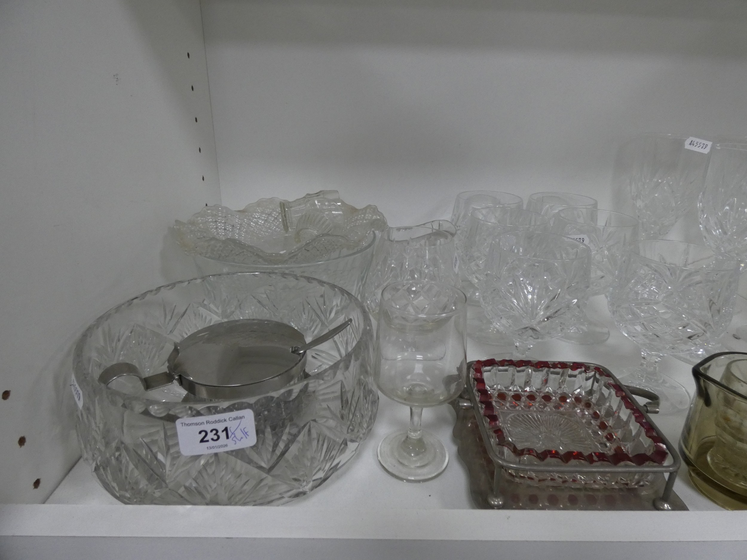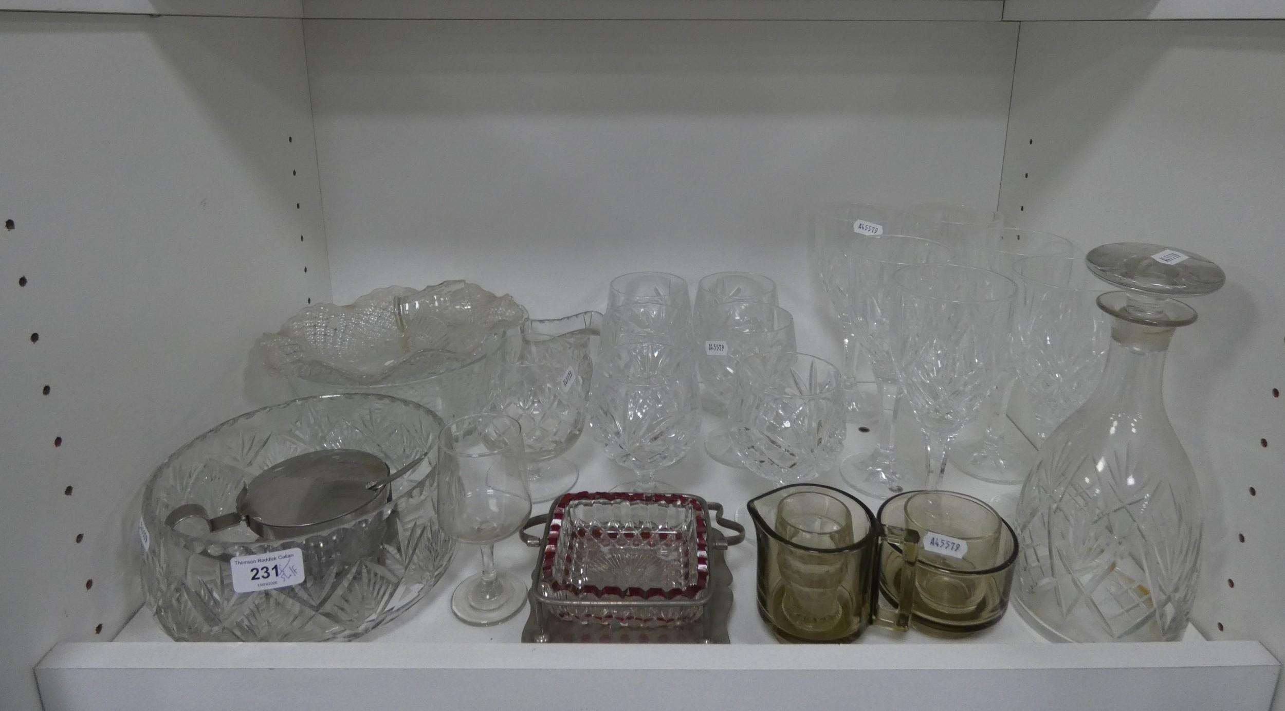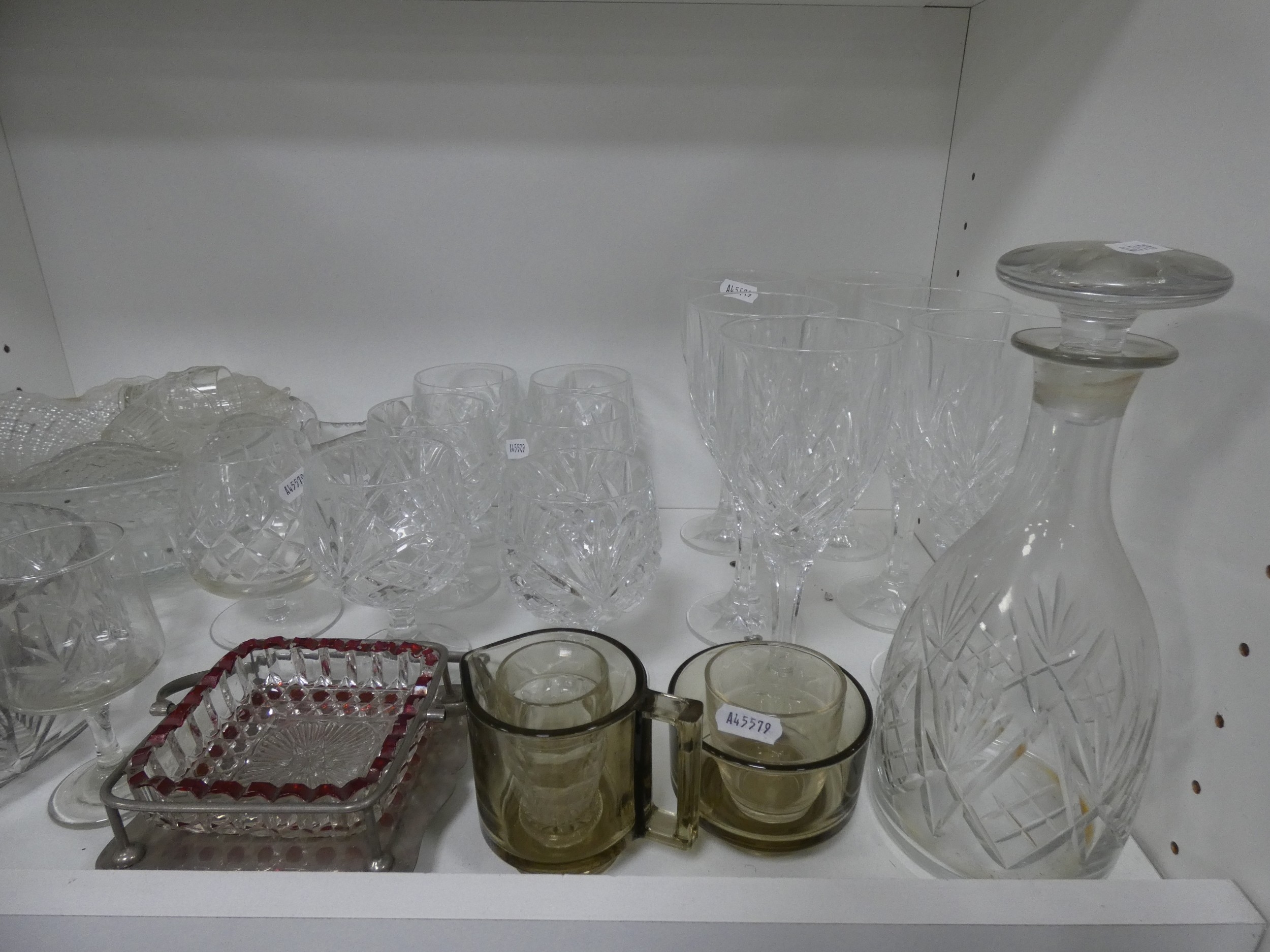 Cut crystal and glassware to include bowls, glasses, decanter etc (one shelf).