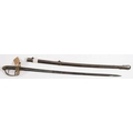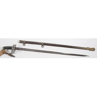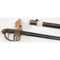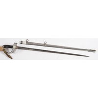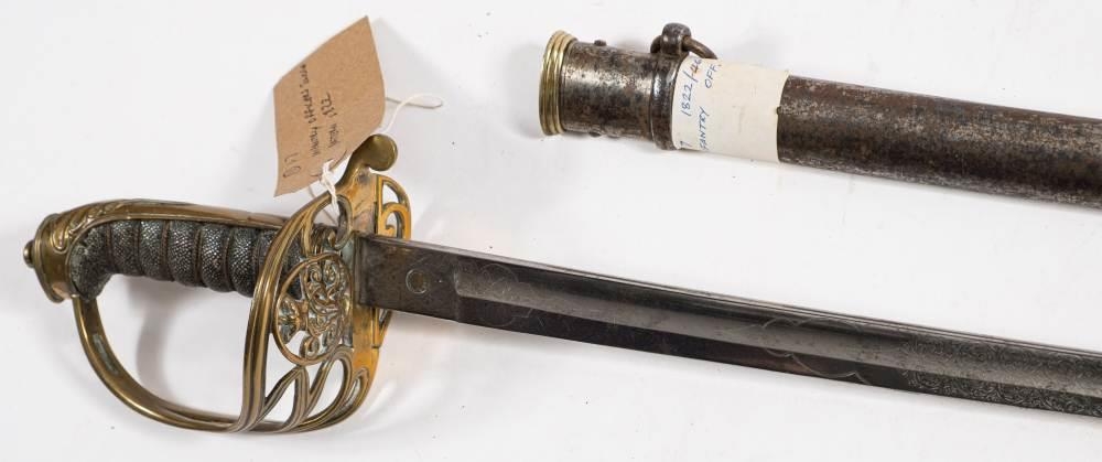 A Victorian 1822 pattern Light Infantry Officers sword by Pillin for Stevens of London: the straight single edged blade with acid etched decoration, crown and 'VR' cipher , makers marks a to shoulder as per title, gilt brass three bar guard with single quillon and folding hilt decorated en suite, wire bound fish skin grip, together with a steel scabbard with double suspension loops, blade length 83cm.