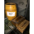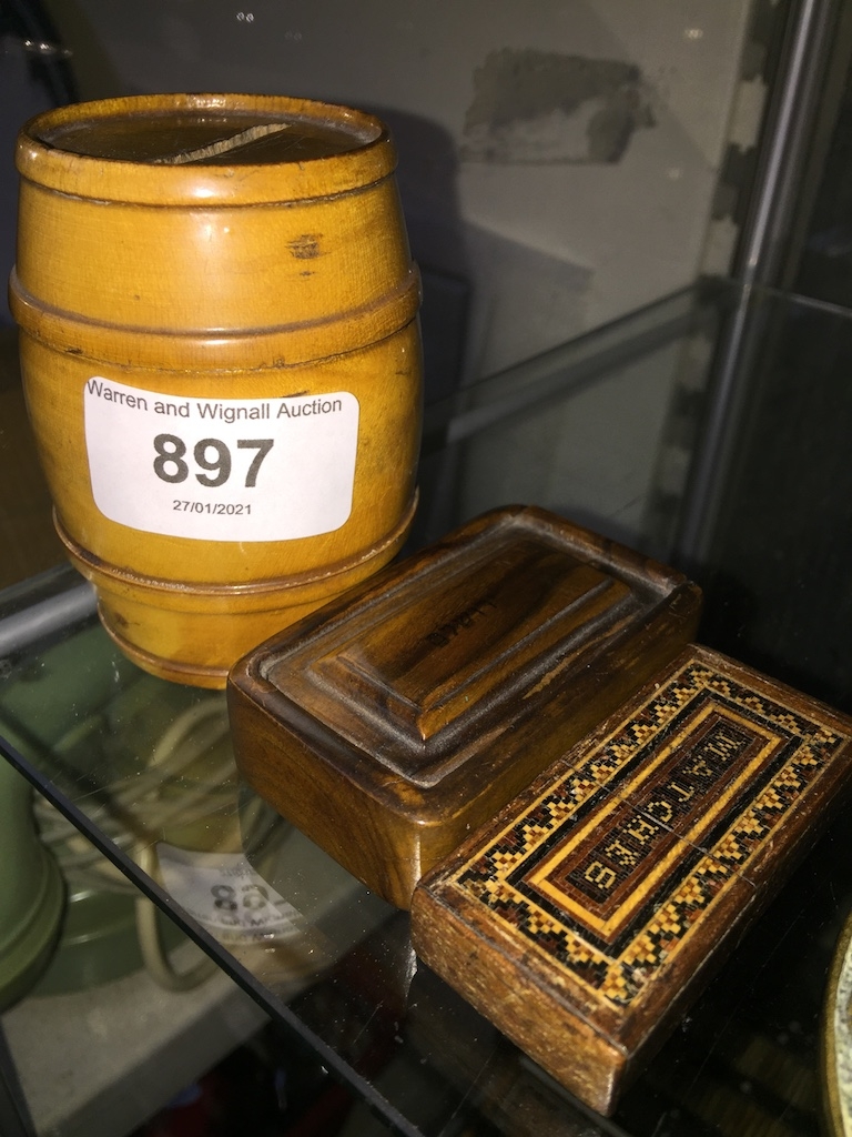 Mauchlin ware barrel money box, olivewood snuff box and parquetry matchbox