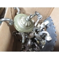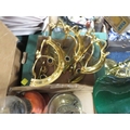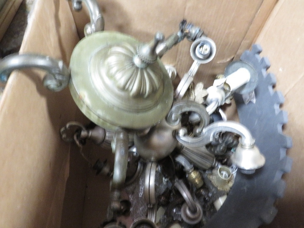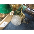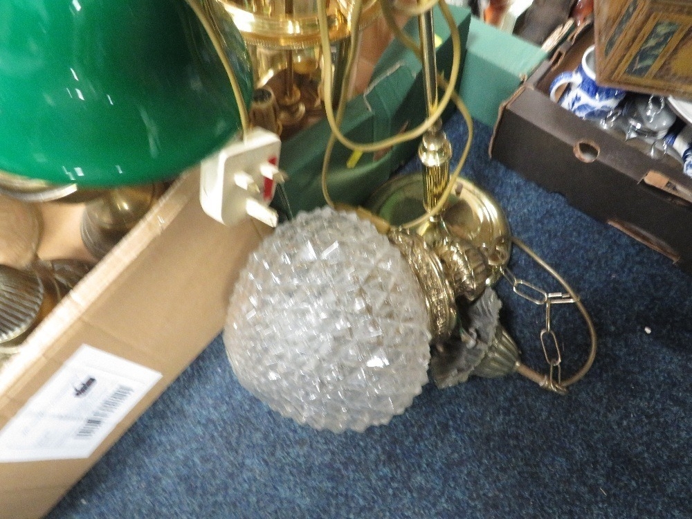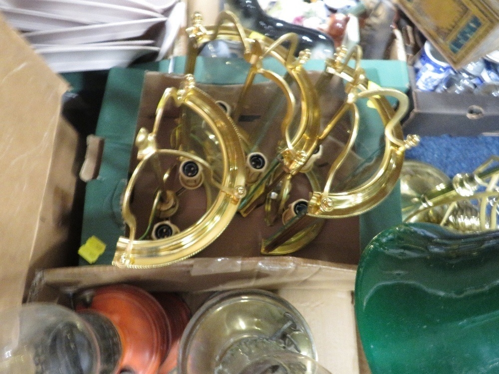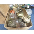 Three trays of assorted oil lamps and light fixtures A/F