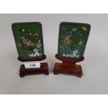 Pair of Chinese miniature cloisonne panels decorated with birds, insects and flowers, on hardwood stands